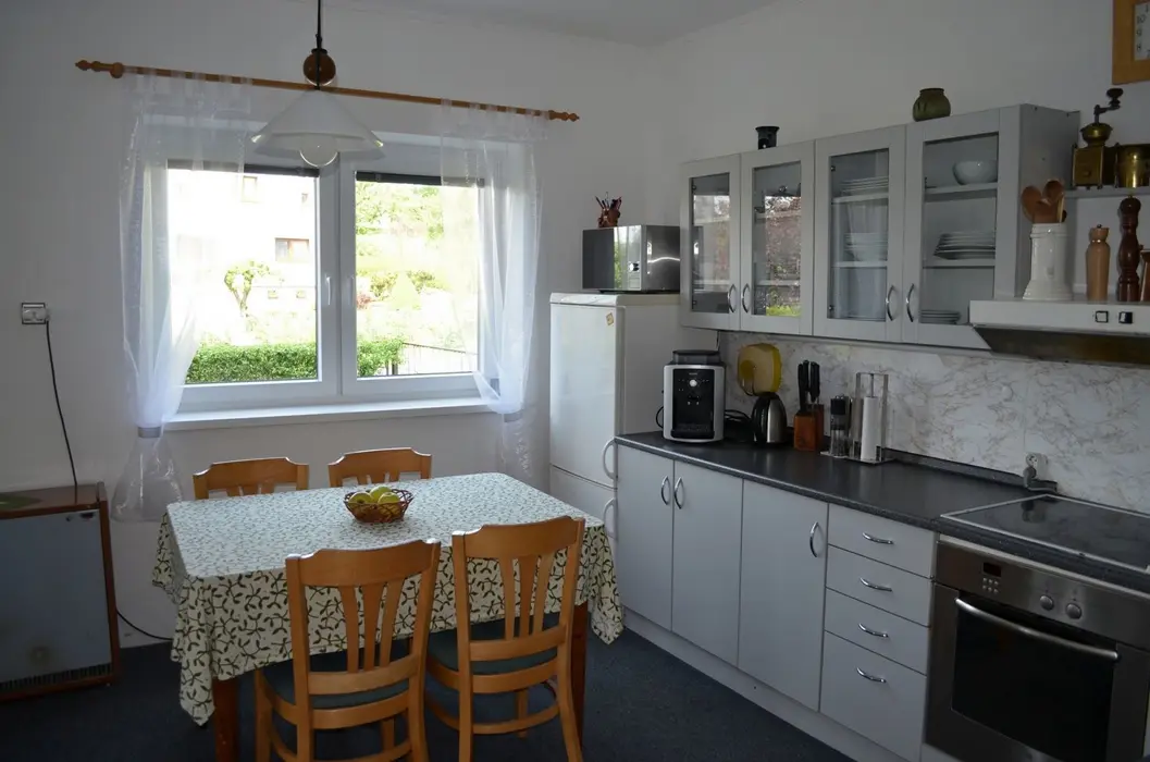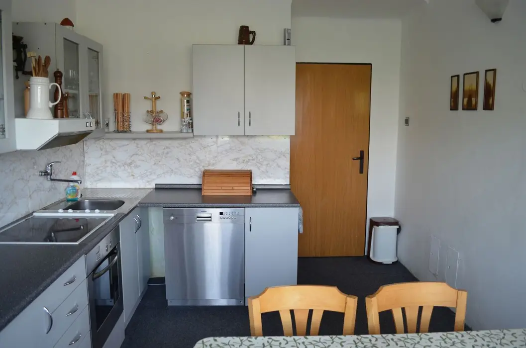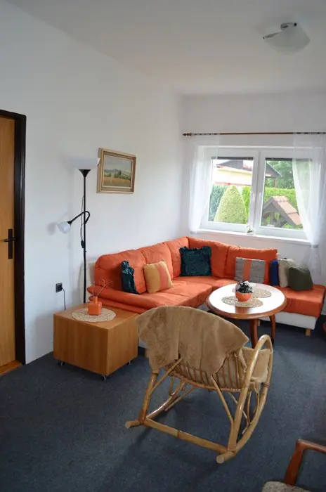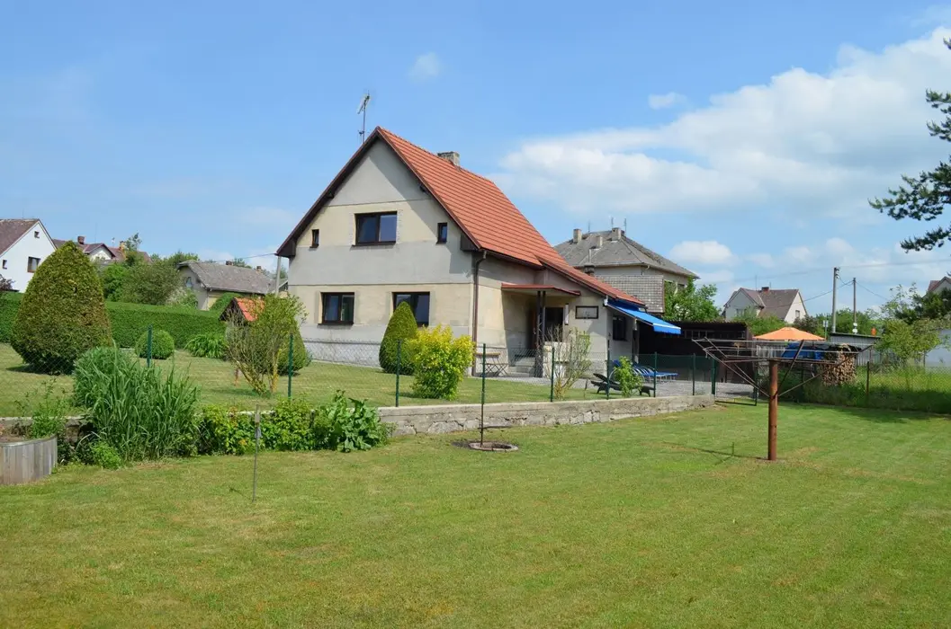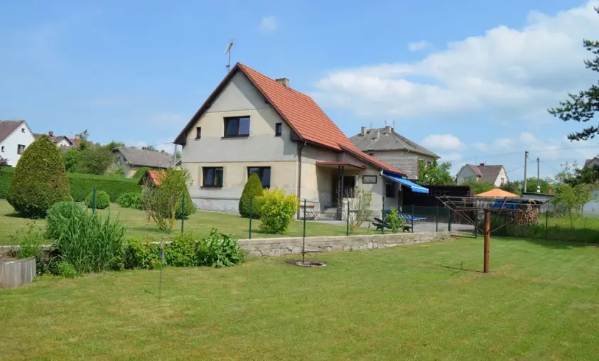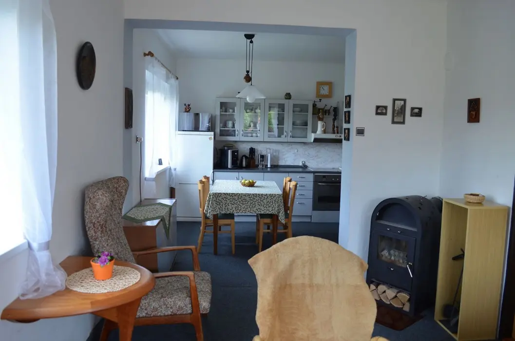 V přízemí: obývací pokoj s posezením, krbová kamna, LCDTV, kuchyně - jídelní stůl, indukční varná deska s troubou, lednice s malým mrazáčkem, kávovar, varná konvice, remoska, myčka. 4 ložnice - 4x2 - obě průchozí do 2 malých podkrovních pokojíků - v každé 2 lůžka. Soc. zařízení - koupelna se sprchou, umyvadlo, samostatné WC, k dispozici pračka + sušička. Topení na akumulační kamna