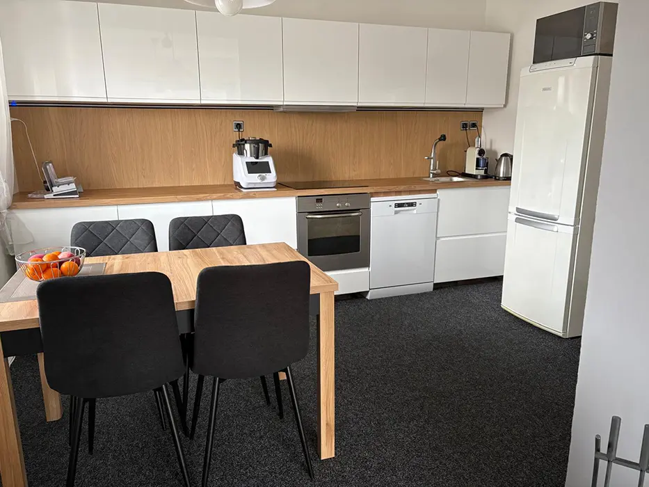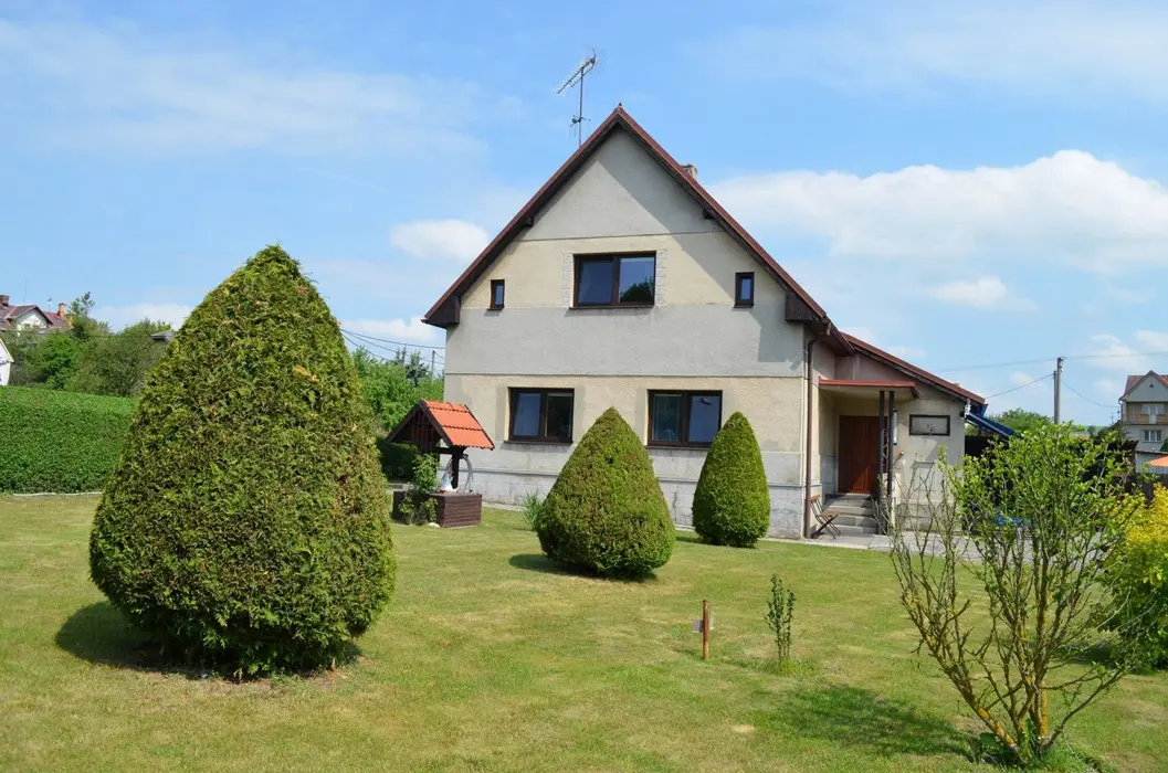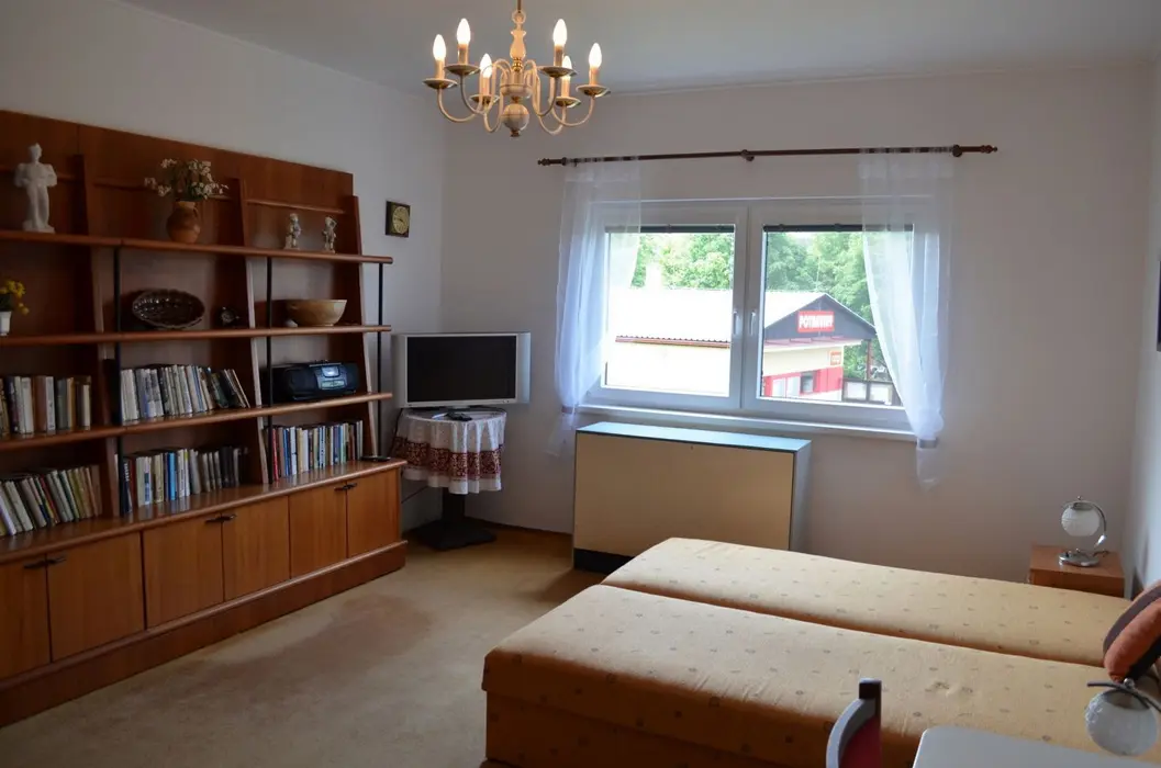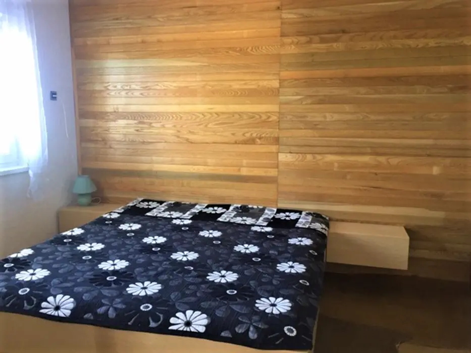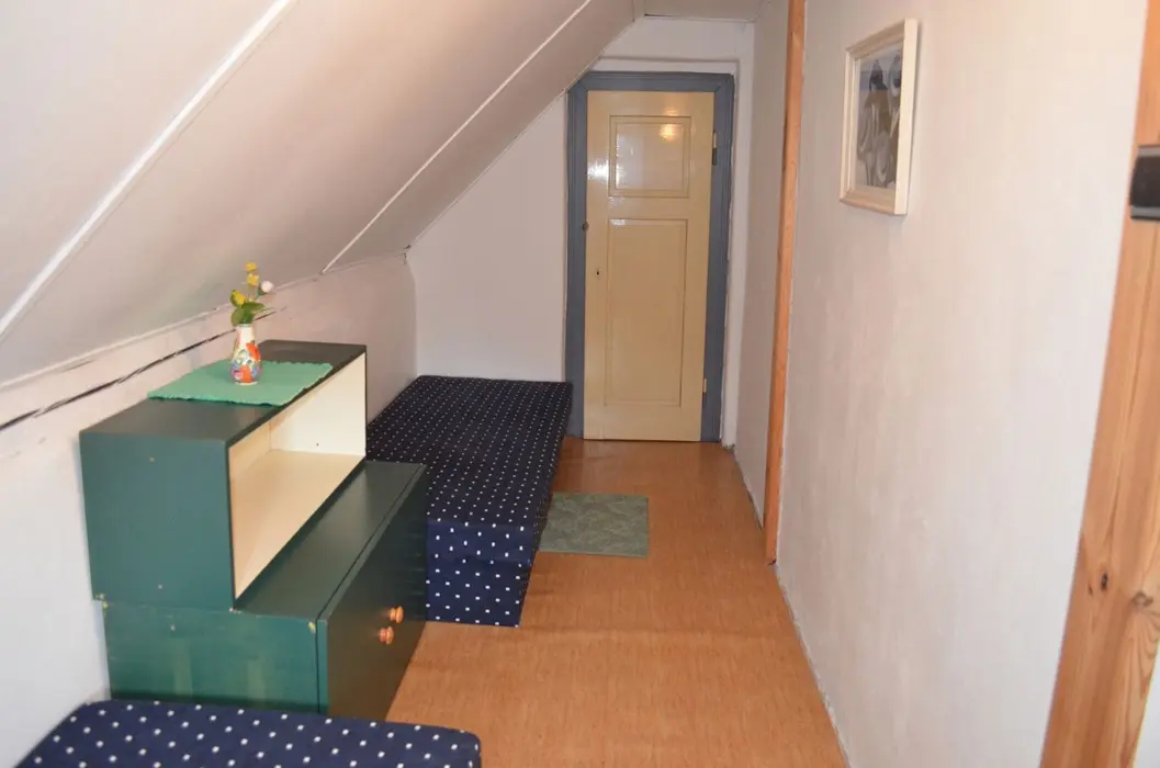 V přízemí: obývací pokoj s posezením, krbová kamna, LCDTV, kuchyně - jídelní stůl, indukční varná deska s troubou, lednice s malým mrazáčkem, kávovar, varná konvice, remoska, myčka. 4 ložnice - 4x2 - obě průchozí do 2 malých podkrovních pokojíků - v každé 2 lůžka. Soc. zařízení - koupelna se sprchou, umyvadlo, samostatné WC, k dispozici pračka + sušička. Topení na akumulační kamna