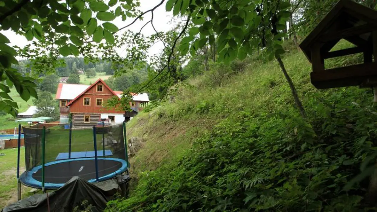 Trampolína 4,2 m, bazén 4,6 m, houpačka, pískoviště, stolní tenis, ohniště, částečně oplocený pozemek, opalovací lehátka