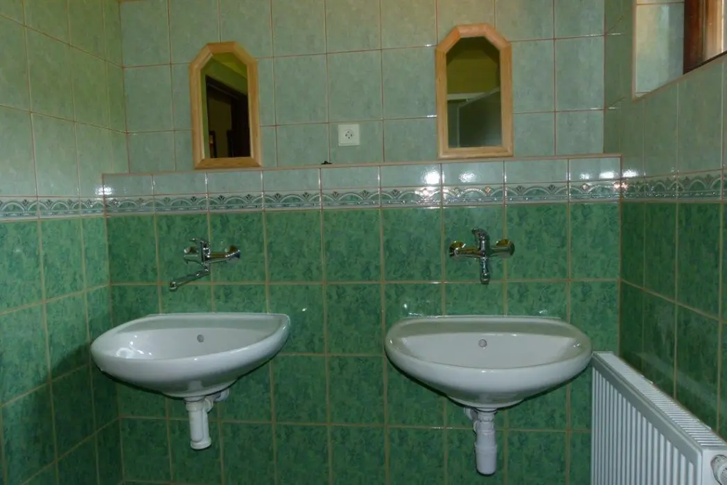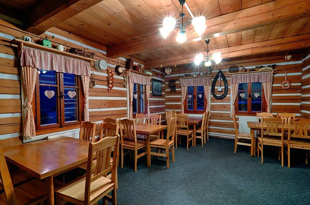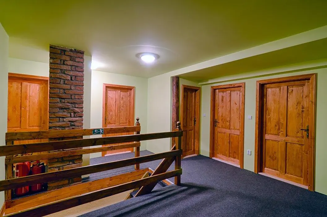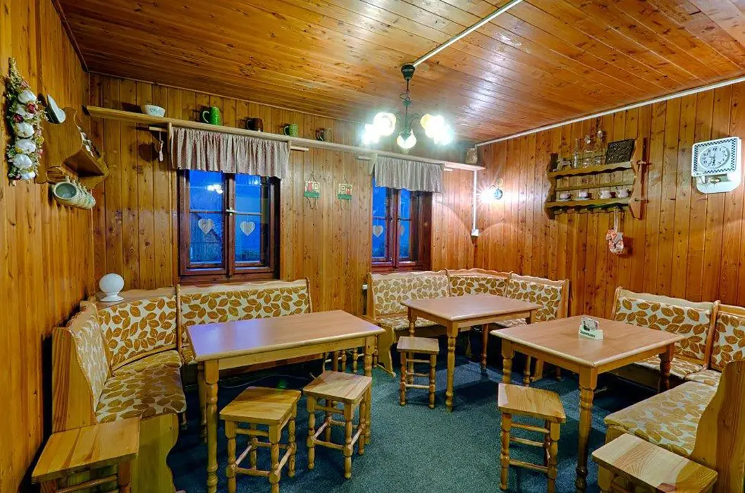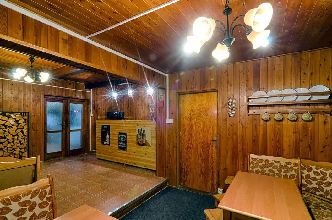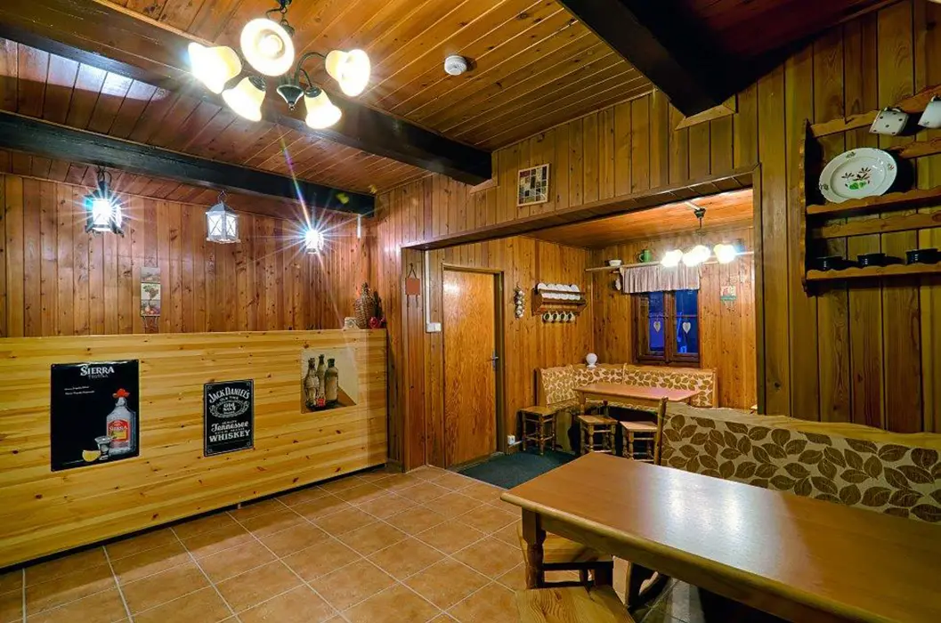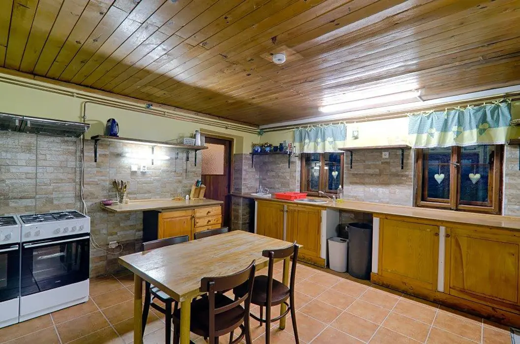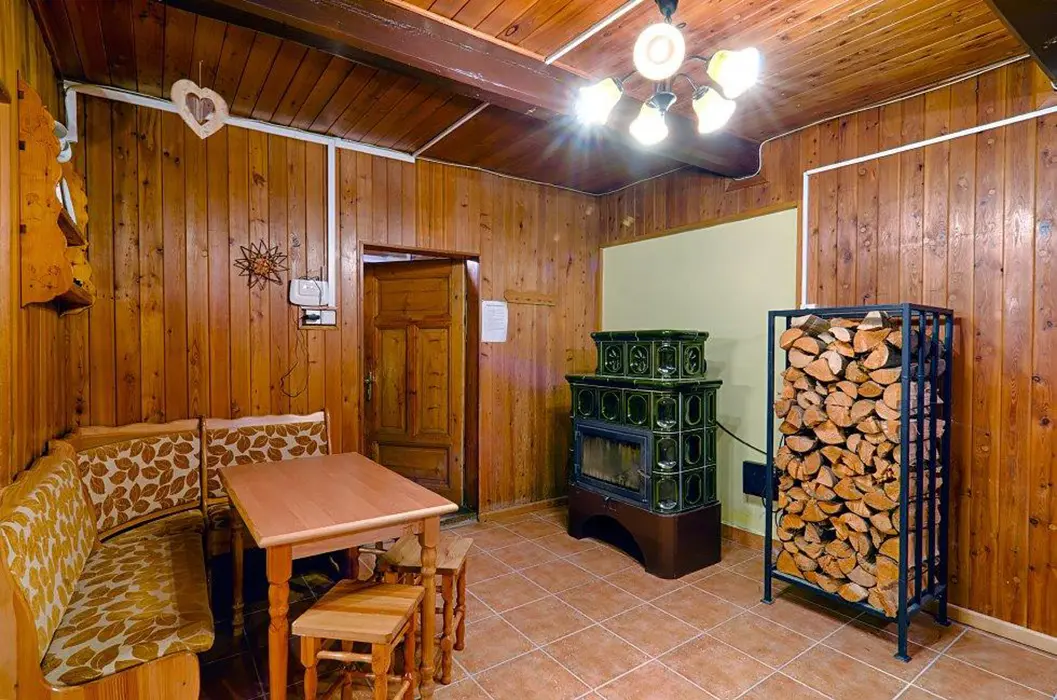 Obývací pokoj s posezením, krbová kamna, BTV. Kuchyně - plynový sporák, lednice, varná konvice, mikrovlnná trouba, jídelní stůl a židle. 8 ložnic - v přízemí 1x4, v patře 2x2, 2x3, 3x4 lůžka. Sociální zařízení v přízemí - 2x sprcha, 3x WC, 2x pisoár. Topení plynové + krbová kamna