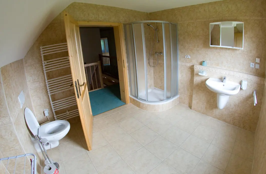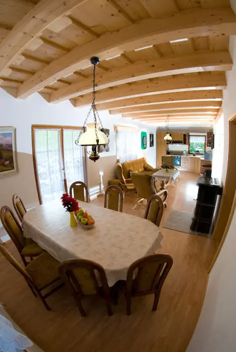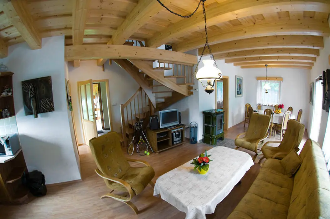 Obývací pokoj - krb, barevná televize. Kuchyně - rychlovarná deska, mikrovlnná trouba, myčka, lednice. 4 ložnice 2x2,1x3, 1x4 ( palanda + 2 postele ). Sociální zařízení - 2 koupelny, sprchový kout, WC. Topení - el.přímotopy
