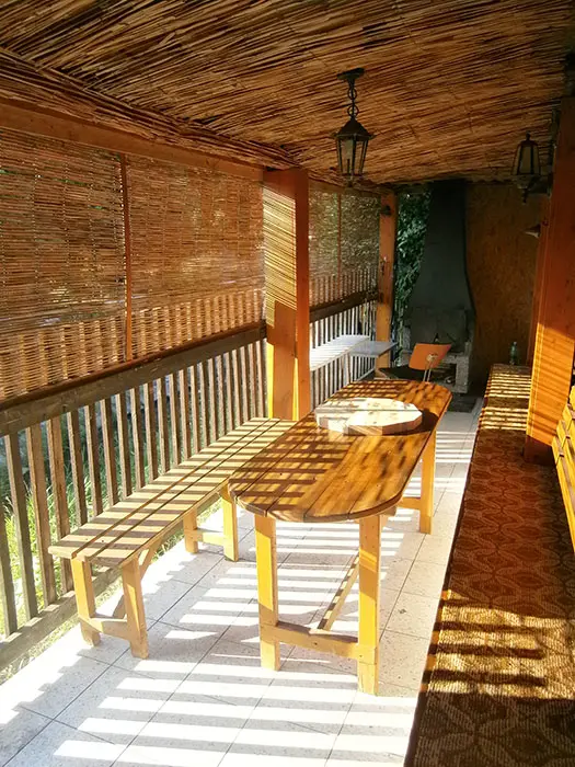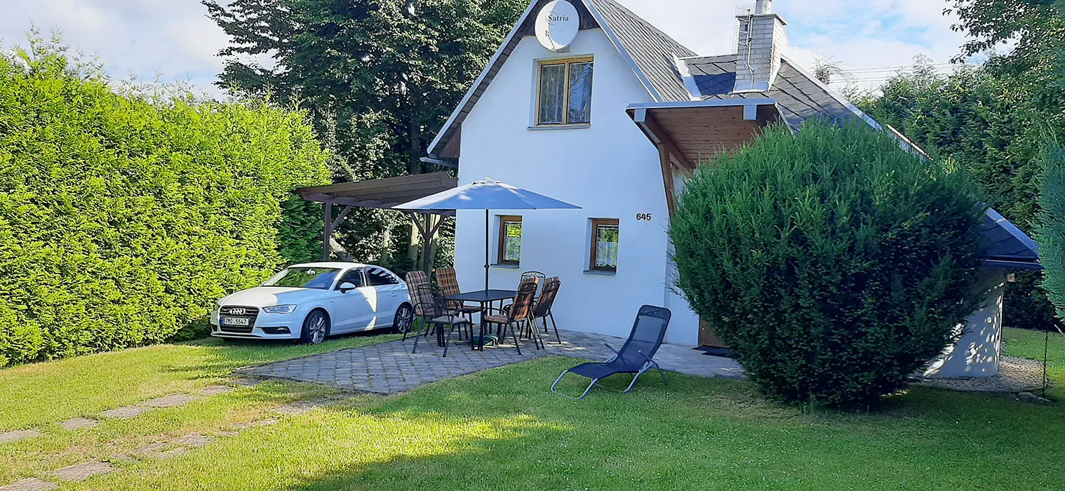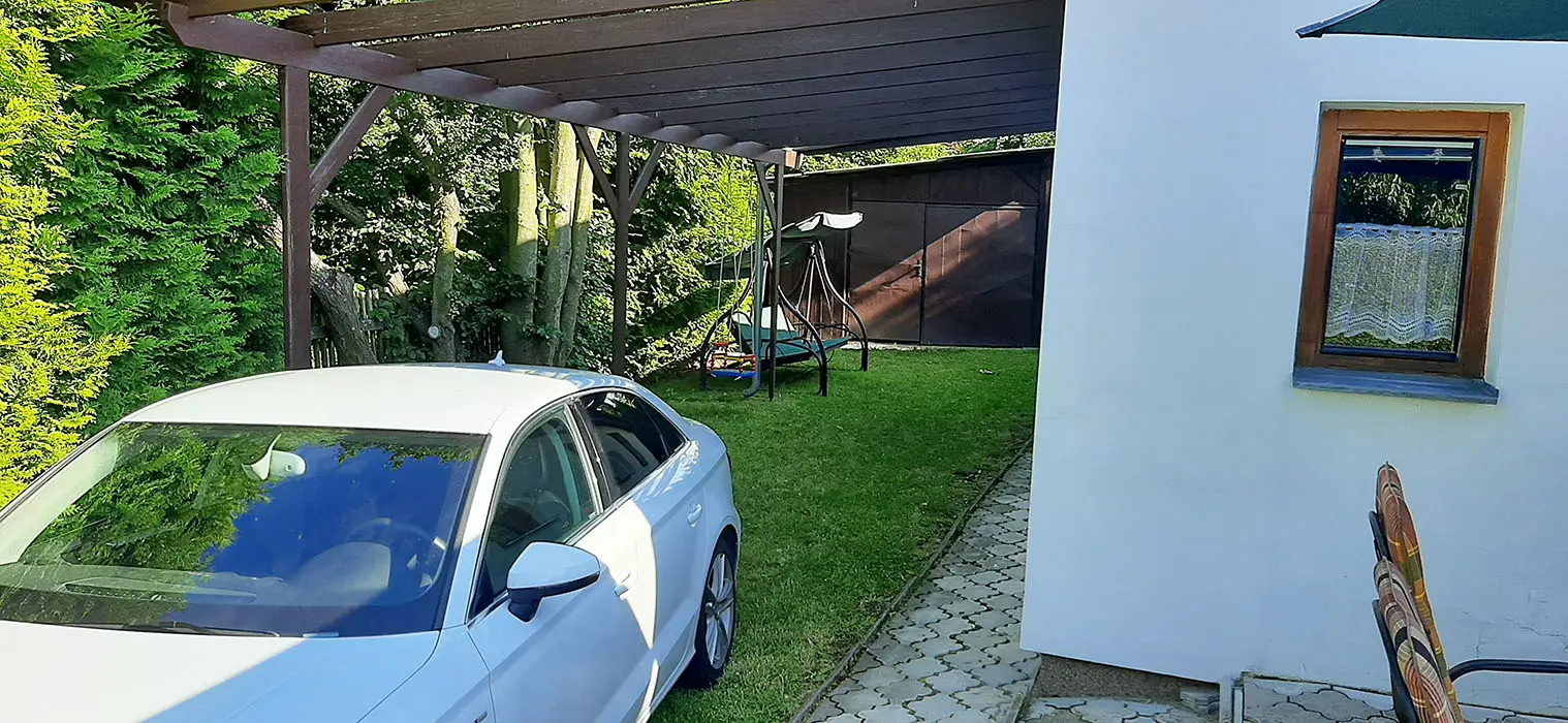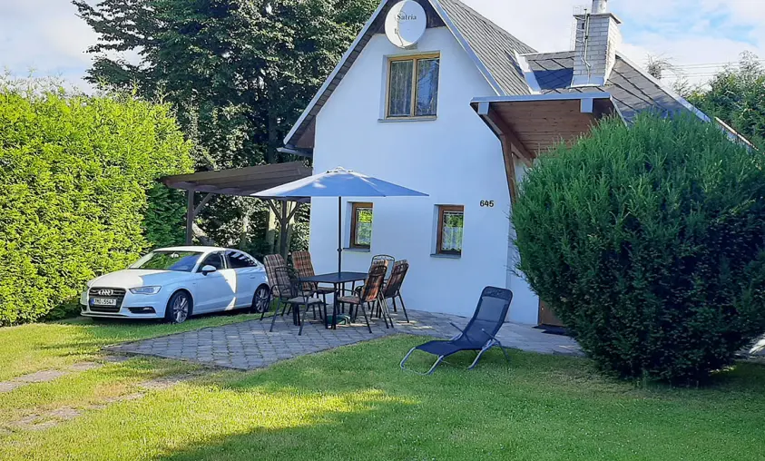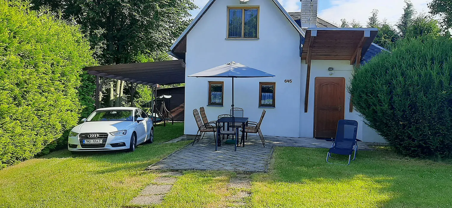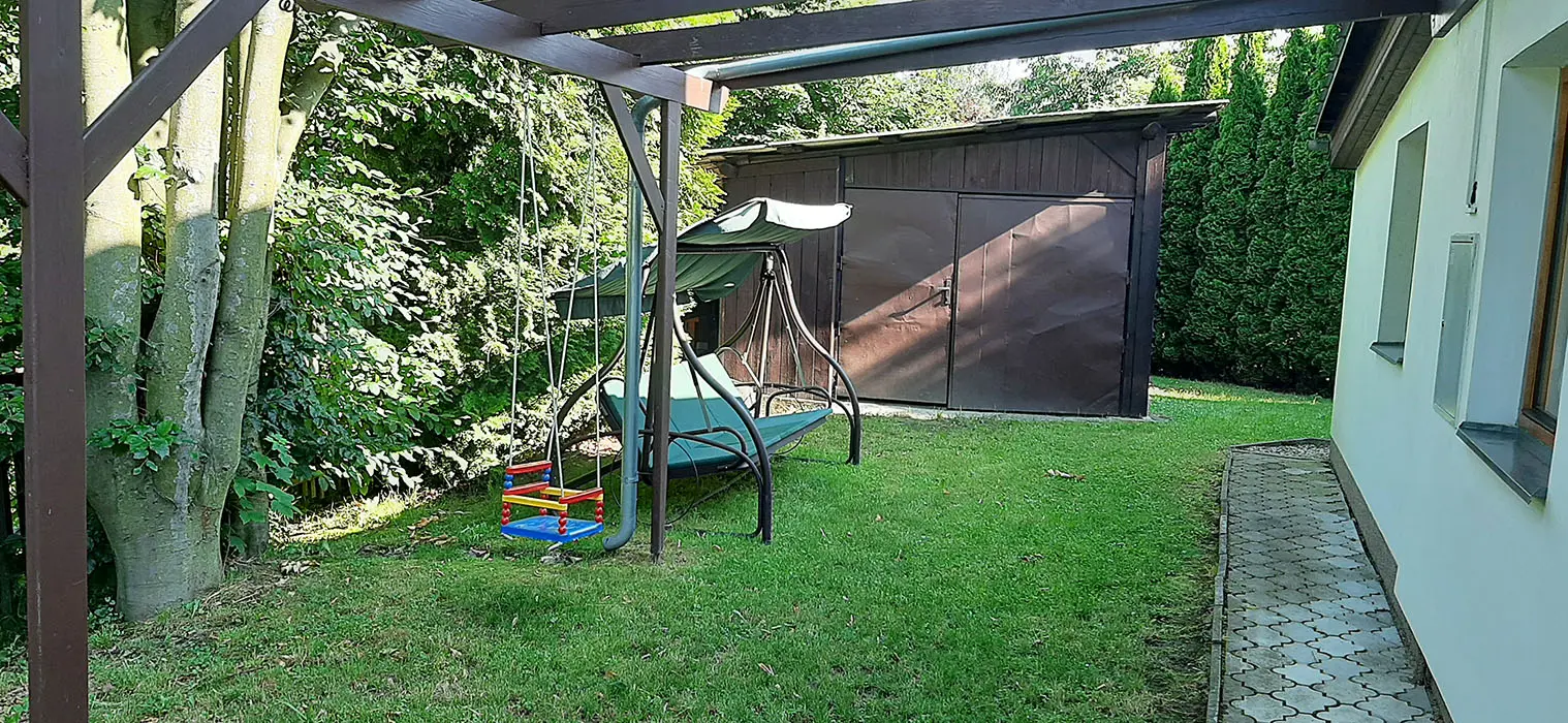 Velký zatravněný oplocený pozemek, podél kterého teče potok, přes potok lávka. Oplocení je ještě před potokem z bezpečnostních důvodů pro děti, dále je zde posezení na zastřešené verandě s krbem, dětský koutek, zahradní nábytek, udírna