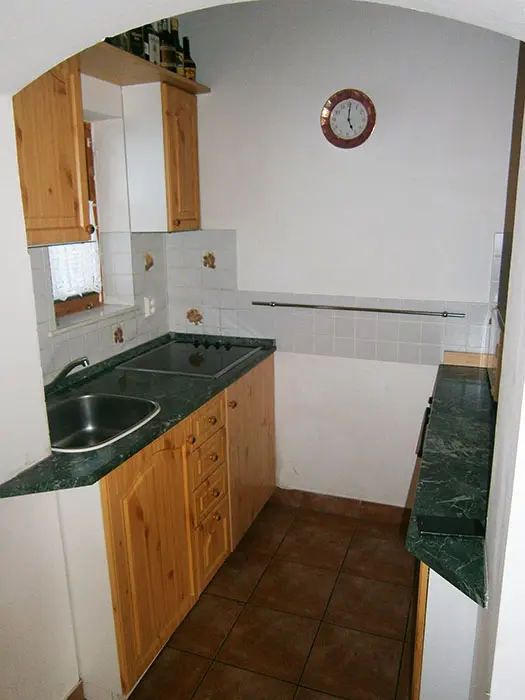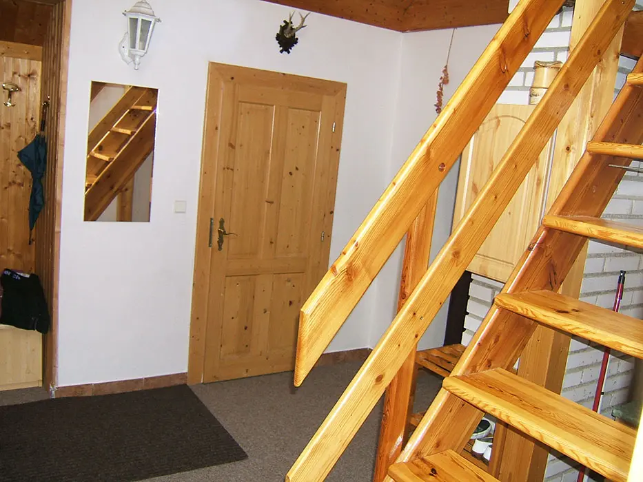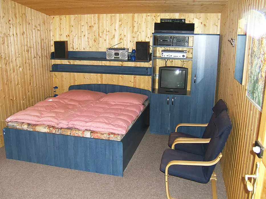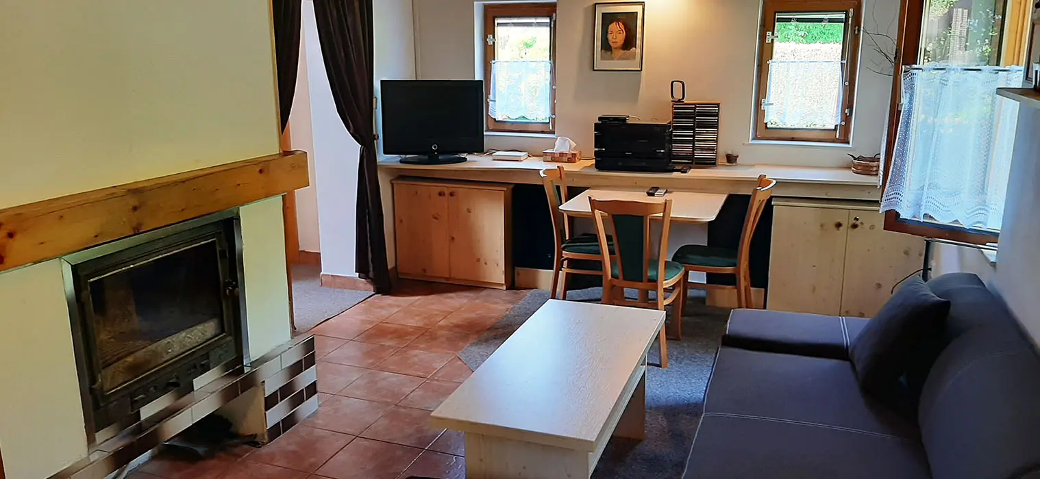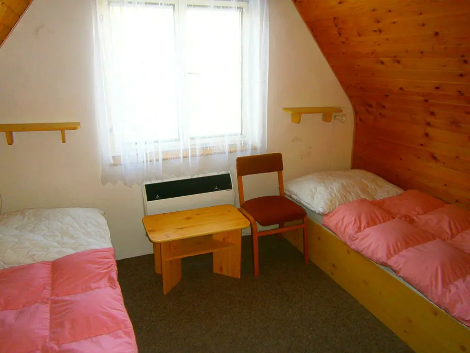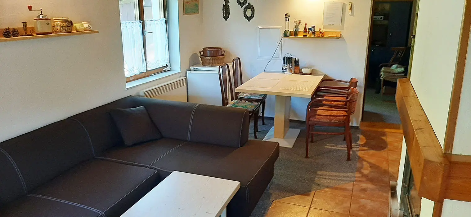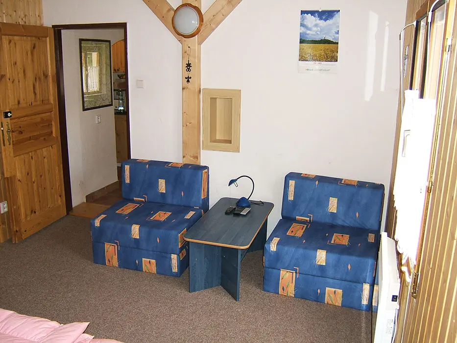Obývací pokoj s posezením u krbu, TV - otevřená kuchyňka - nádobí, lednice, sklokeramická varná deska, MVT, překapávač. 4 ložnice - 3x2 lůžka, 1x2 - dětská ložnice. Soc. zařízení - sprcha, WC. Topení - centrální krbové + elektrické přímotopy