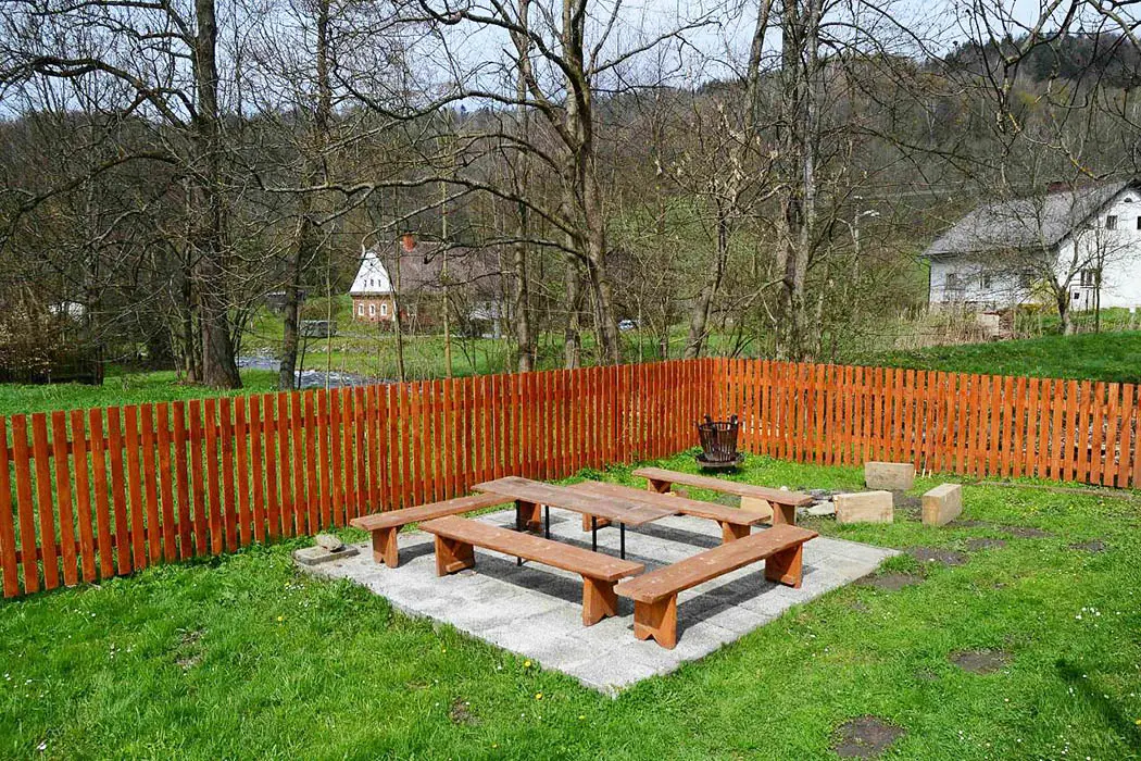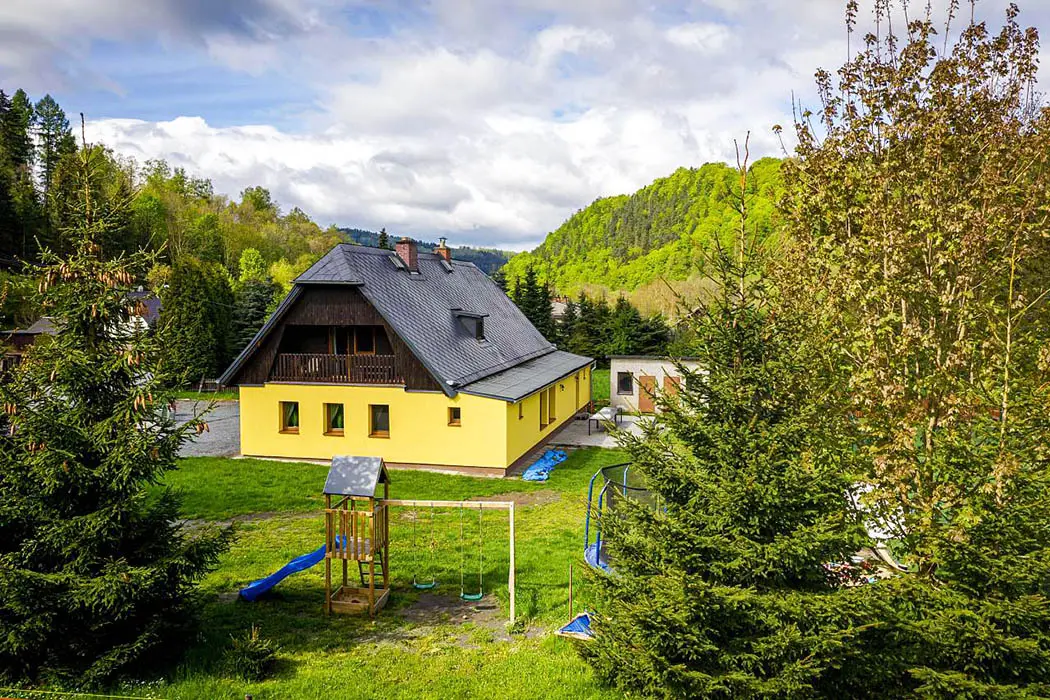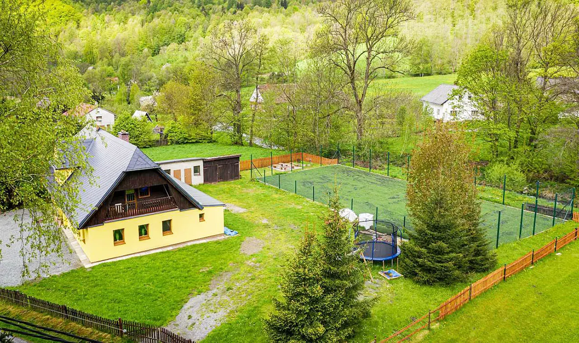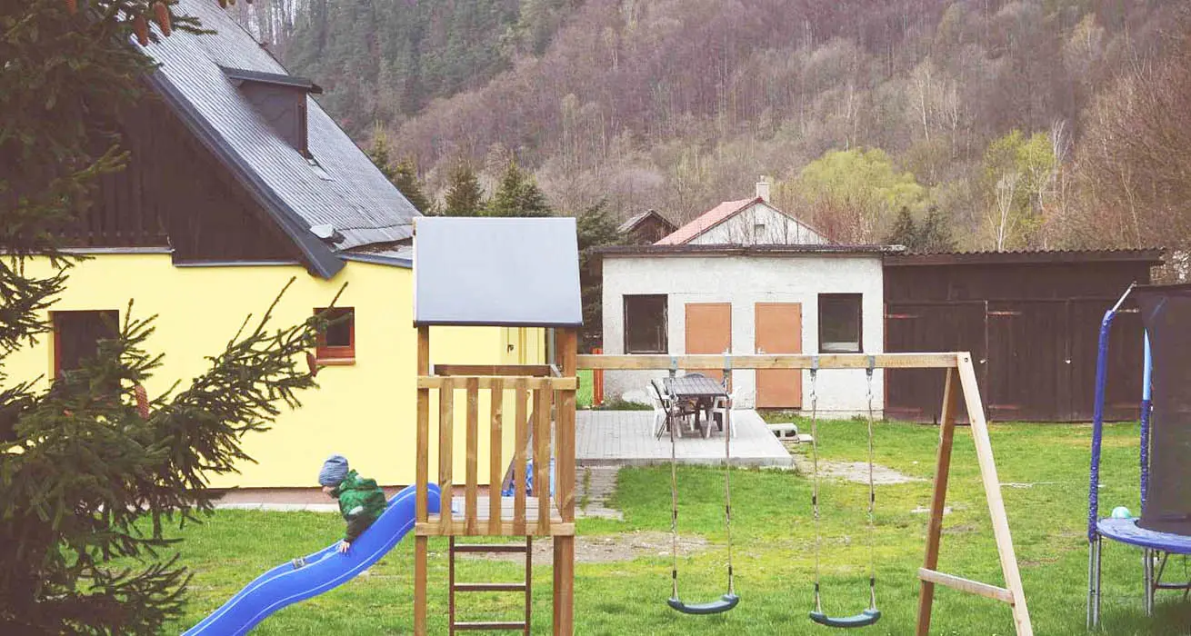 Na velké oplocené zahradě - houpačky, trampolína, skluzavka, pískoviště, hřiště s umělou trávou, venkovní posezení, ohniště, garáž na uschování kol a lyží. Nedaleko je další velké dětské hřiště a povodňový park s balneem a plytkými potůčky (ideální na hraní pro děti)