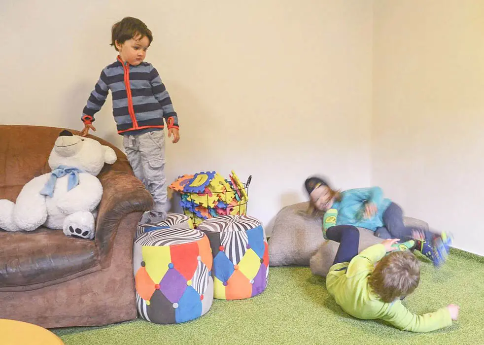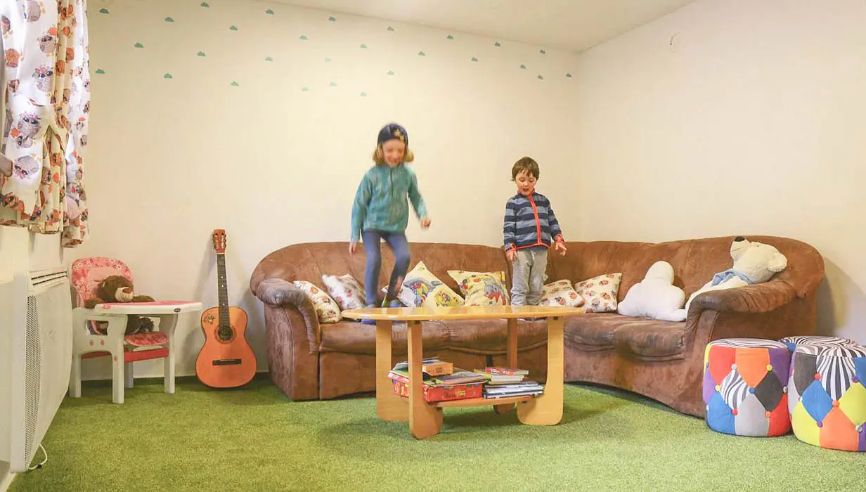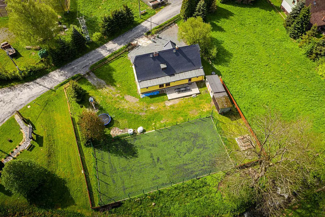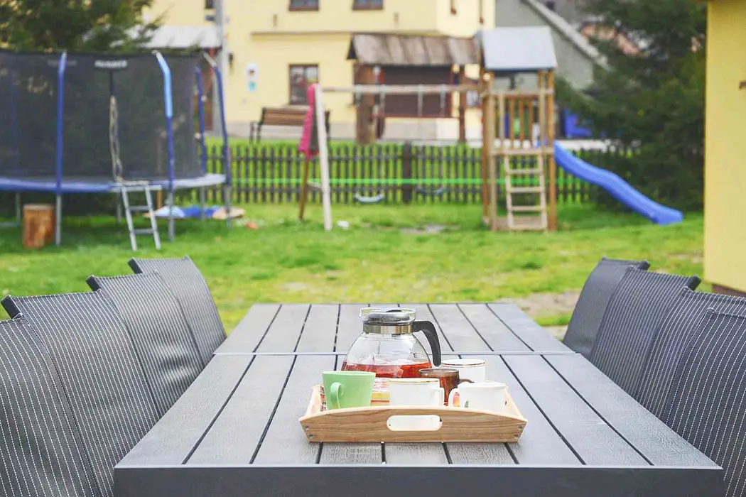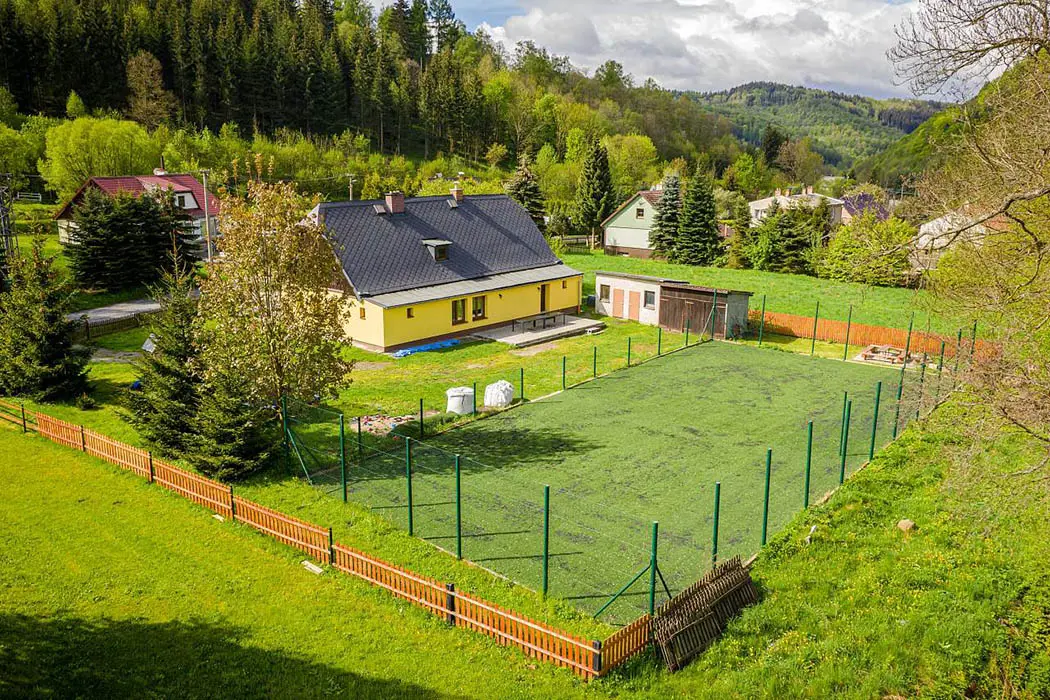 Na velké oplocené zahradě - houpačky, trampolína, skluzavka, pískoviště, hřiště s umělou trávou, venkovní posezení, ohniště, garáž na uschování kol a lyží. Nedaleko je další velké dětské hřiště a povodňový park s balneem a plytkými potůčky (ideální na hraní pro děti)