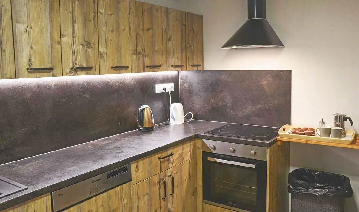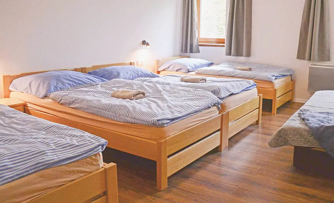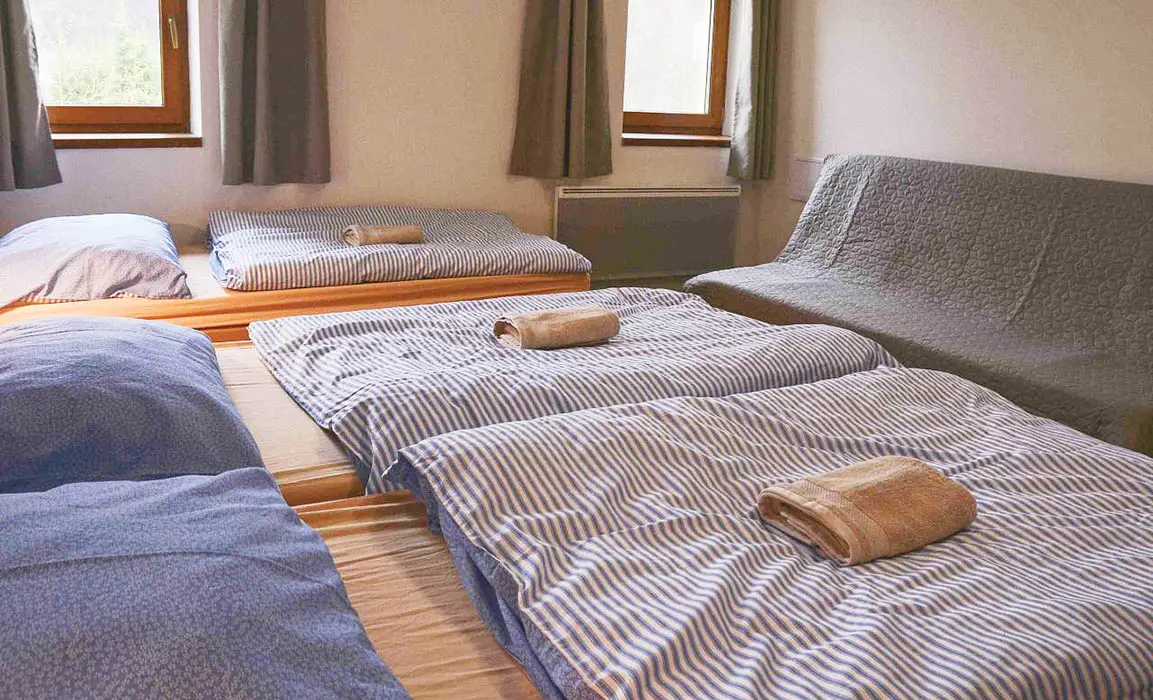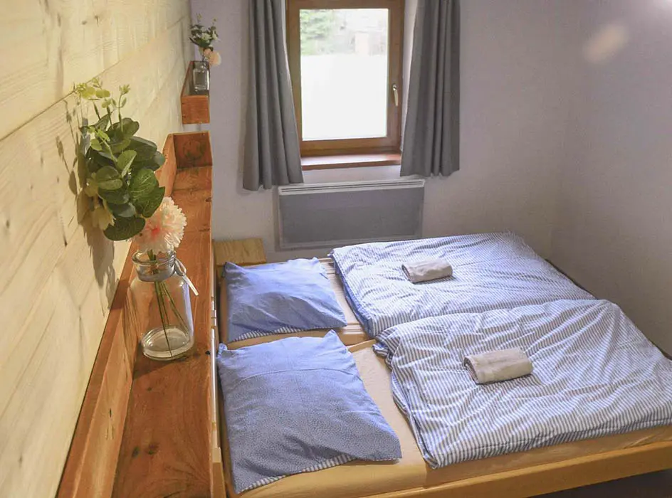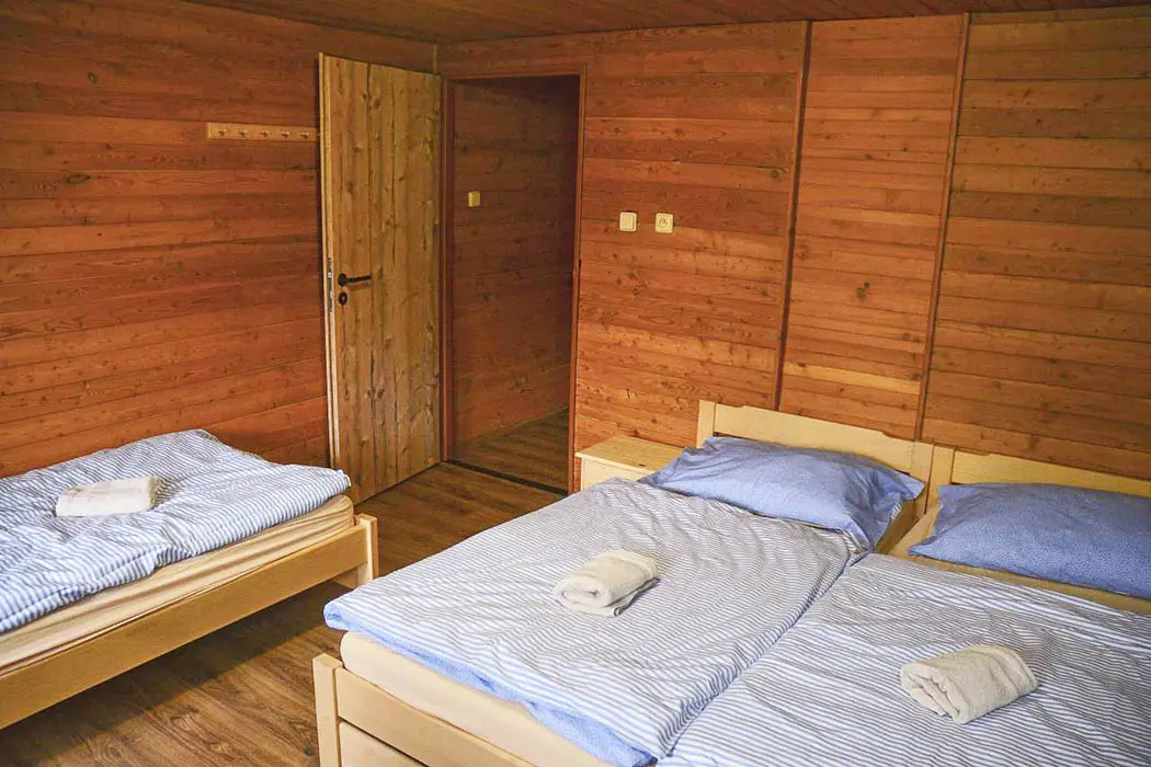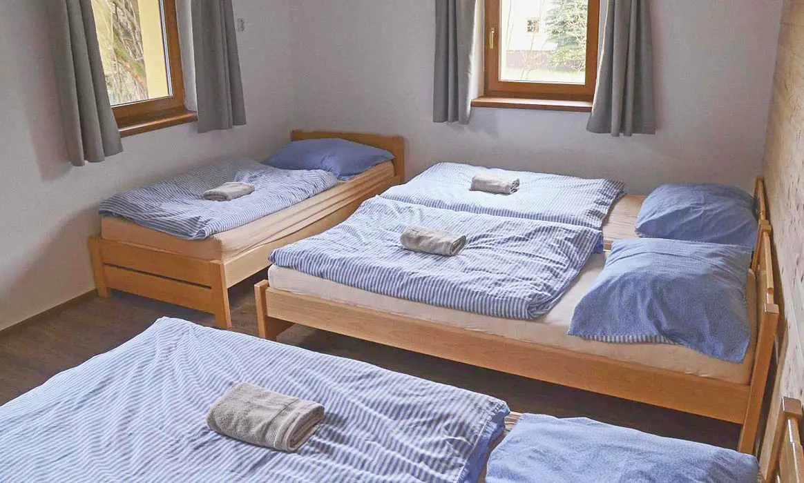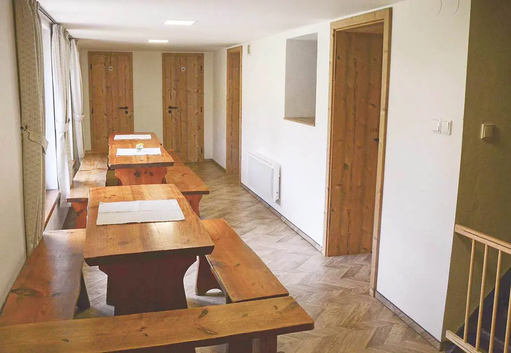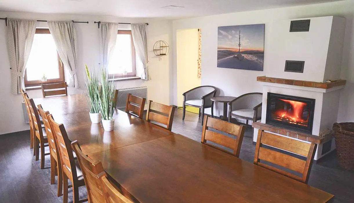 Prostorná společenská místnost - stoly, židle, krb, 2x TV, plně vybavená kuchyně - el.sporák s troubou, 2x lednice, toustovač, mikrovlnka, topinkovač, varná konvice, myčka, nádobí. 6 ložnic - přízemí - 1x3, 1x4 ( v jedné možnost přistýlky ), v patře 1x2, 2x3, 1x4 lůžka. K dispozici dětská postýlka. Soc. zařízení - 2x koupelna se sprchovým koutem 2x WC. Topení - el. přímotopy + krbová kamna