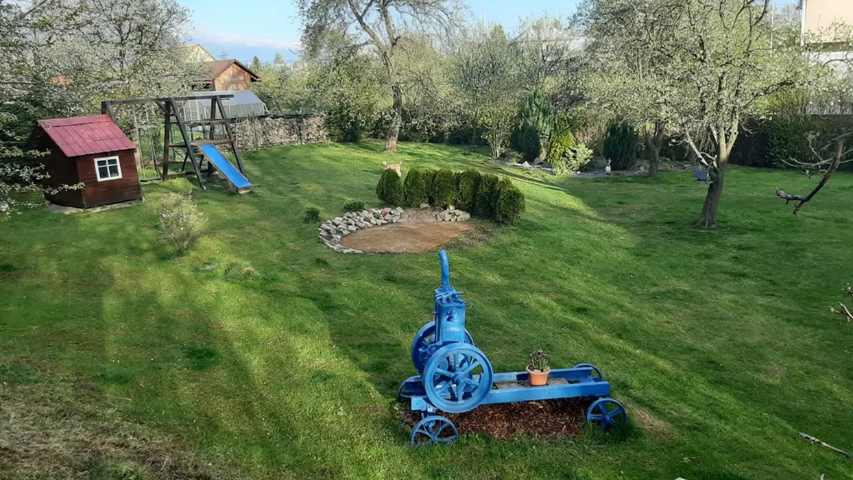 Posezení na terase se zahradním nábytkem, 2x gril - na dřevěné uhlí a elektrický. Zahrada 1400 m2 s vybavením pro děti, venkovní posezení s ohništěm, vybavení pro venkovní posilování či box