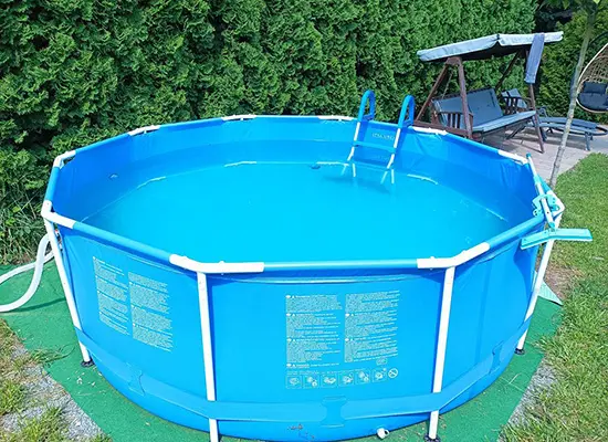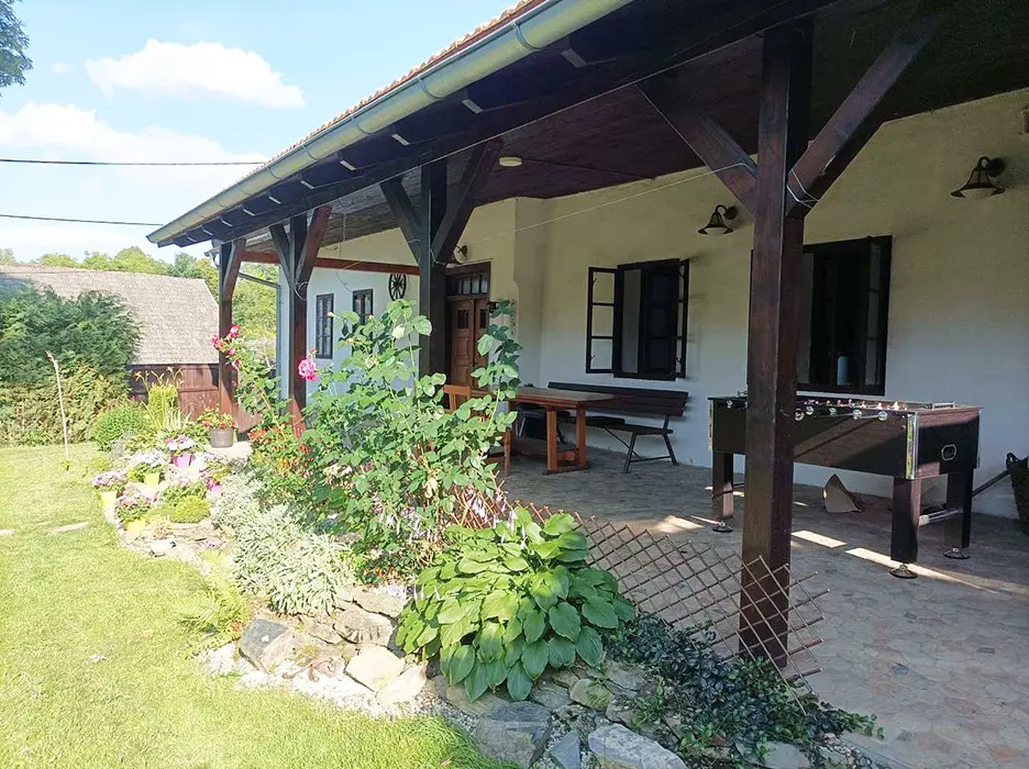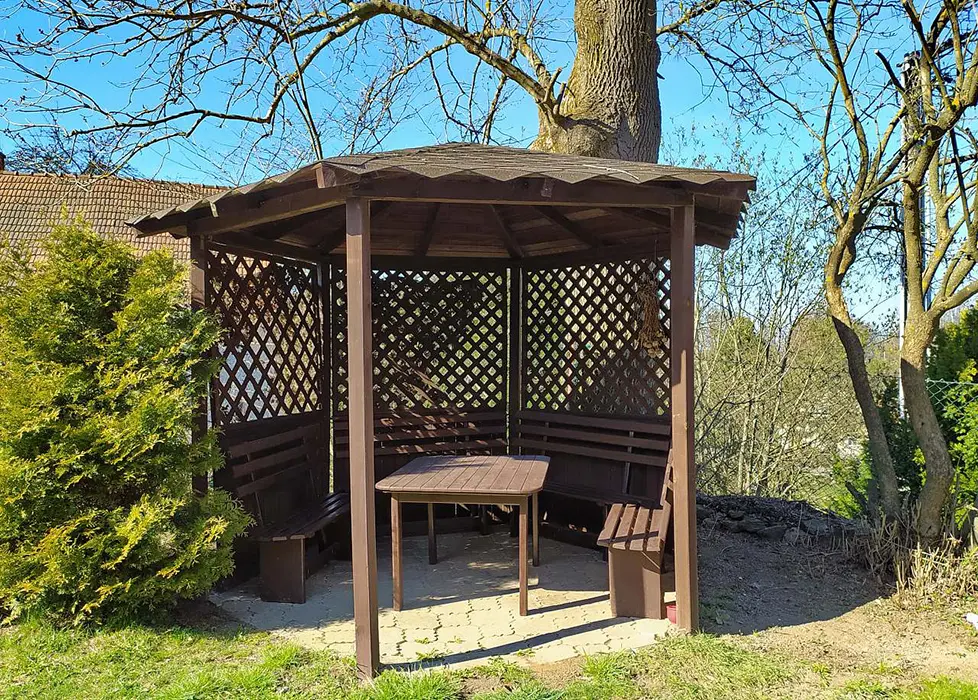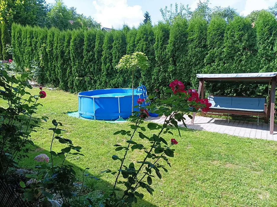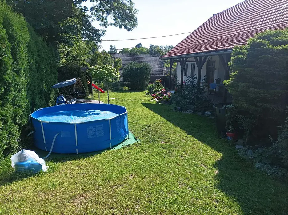 Na prostorné zahradě - zastřešené venkovní posezení, stolní fotbálek, zahradní altán, ohniště, houpací lavice, přenosný gril, skluzavka pro děti, nadzemní bazén 3 m x 0,76 m