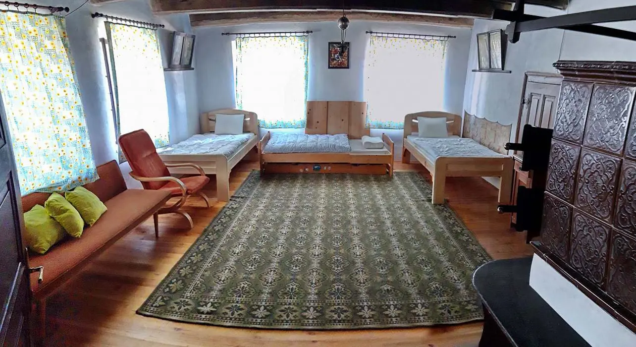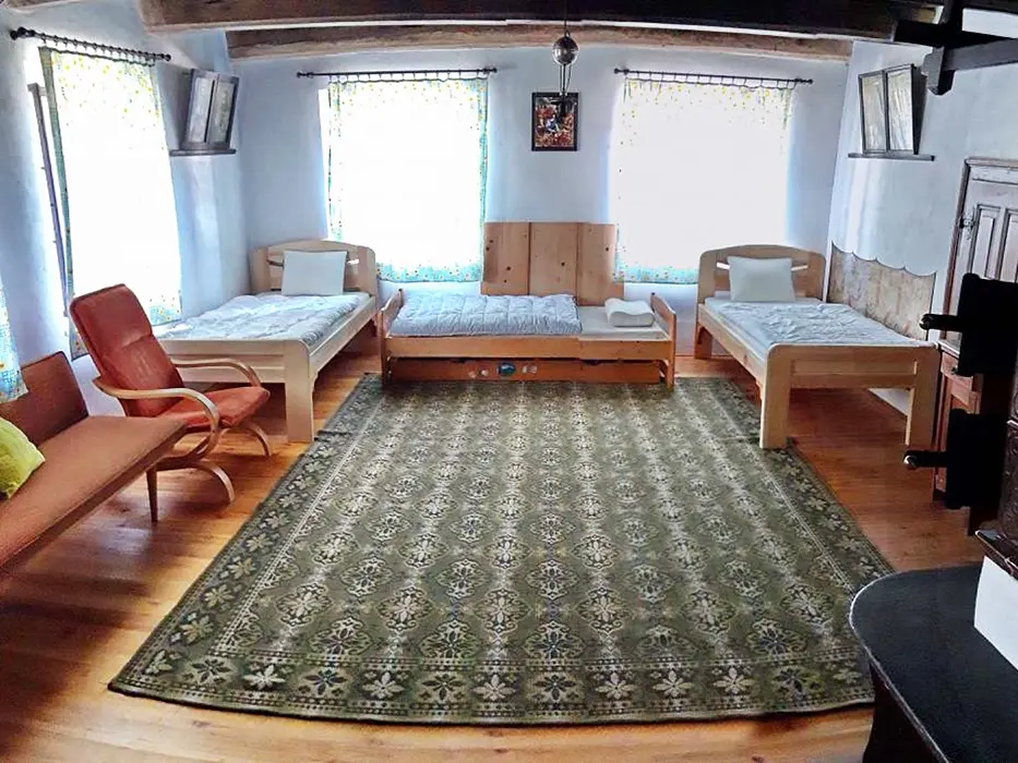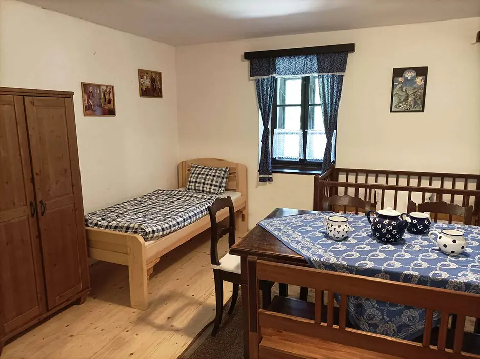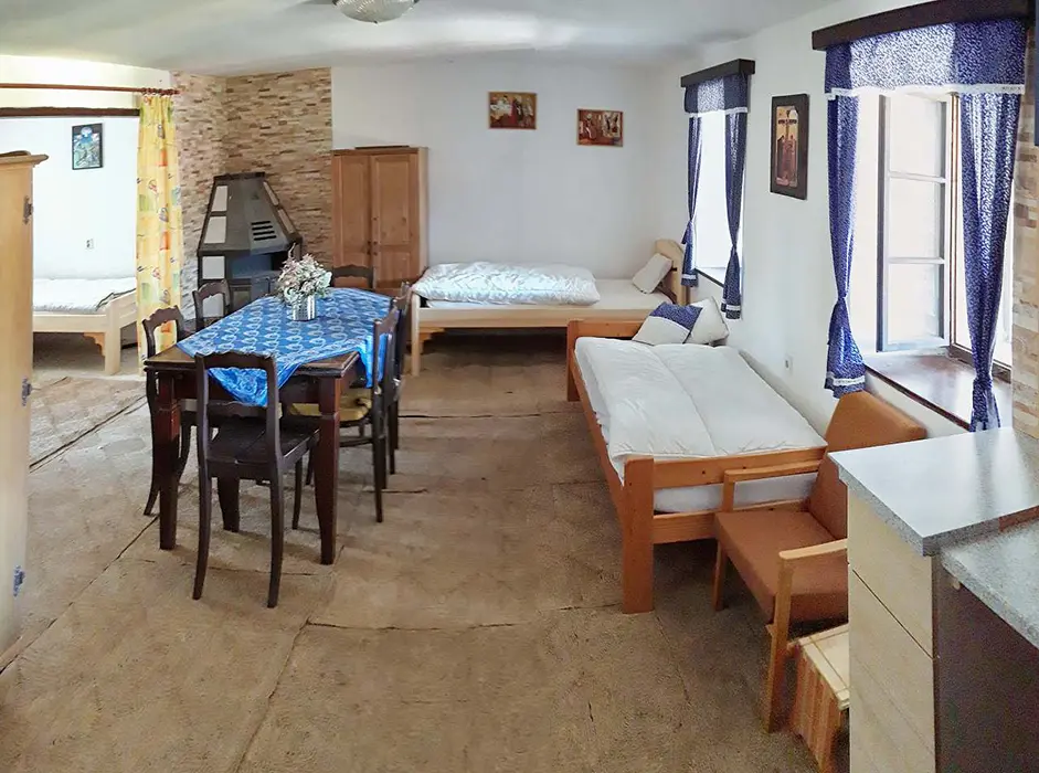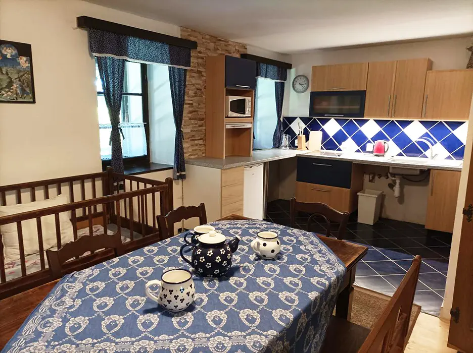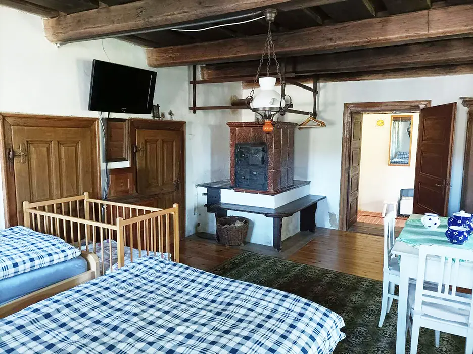 Prostorná obytná část spojená s kuchyní - 5 lůžek ( 2 lůžka ve světnici + 3 lůžka vedle za závěsem ), kachlová kamna, stůl, židle. Kuchyňské vybavení v samostatné kuchyni: el. sporák (4 - plotýnková sklokeramická varná deska), trouba, lednice velká, mikrovlnná trouba, myčka na nádobí, topinkovač, toustovač, el. konvice a kávovar na kapsle. Kuchyňské vybavení u kuch. koutu: el. sporák (2 - plotýnková sklokeramická varná deska), lednička malá, mikrovlnná trouba, el. konvice. 2 ložnice - 1x4+1 přistýlka, 1x1 lůžko. Soc. zařízení - koupelna se sprchou, umyvadlo, pračka, samostatné WC. Topení - kachlová kamna, litinová kamna, el. přímotopy