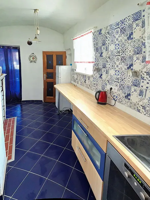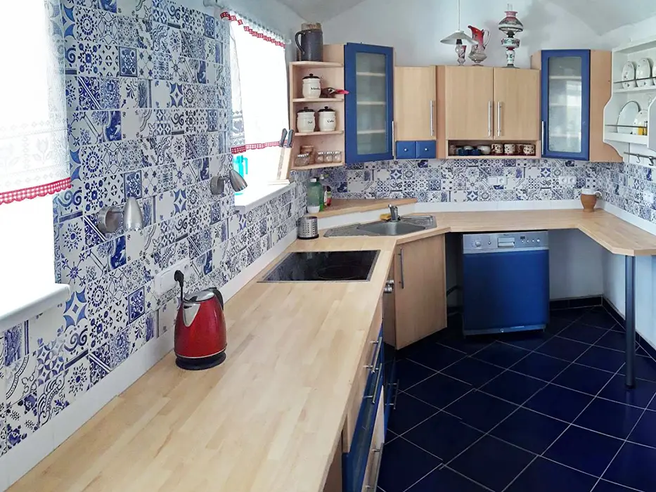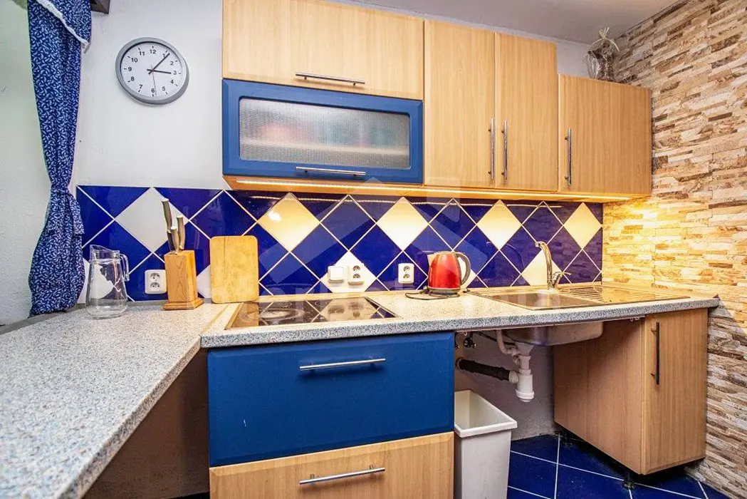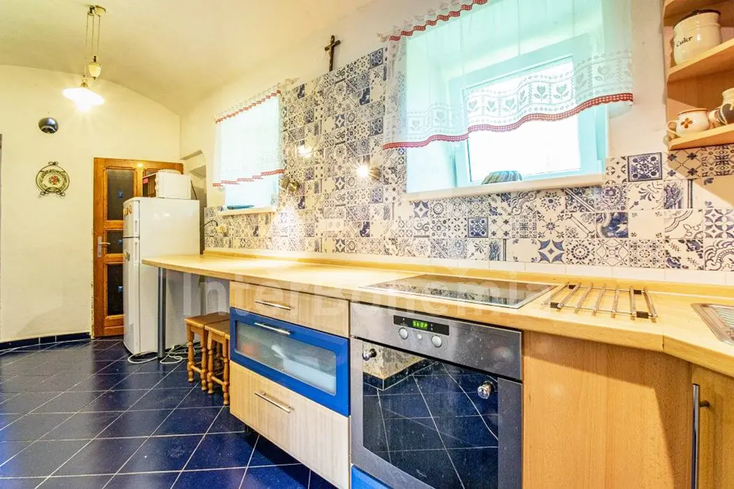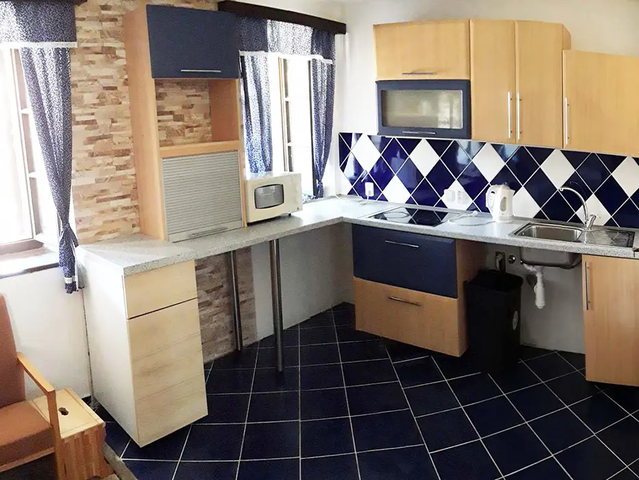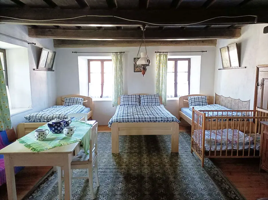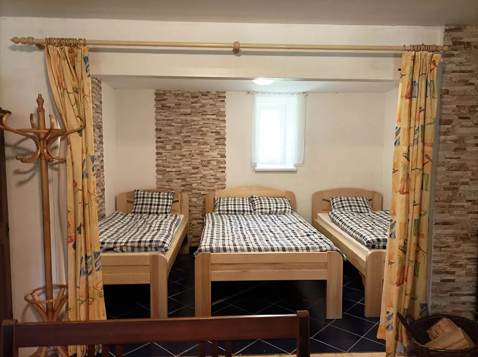 Prostorná obytná část spojená s kuchyní - 5 lůžek ( 2 lůžka ve světnici + 3 lůžka vedle za závěsem ), kachlová kamna, stůl, židle. Kuchyňské vybavení v samostatné kuchyni: el. sporák (4 - plotýnková sklokeramická varná deska), trouba, lednice velká, mikrovlnná trouba, myčka na nádobí, topinkovač, toustovač, el. konvice a kávovar na kapsle. Kuchyňské vybavení u kuch. koutu: el. sporák (2 - plotýnková sklokeramická varná deska), lednička malá, mikrovlnná trouba, el. konvice. 2 ložnice - 1x4+1 přistýlka, 1x1 lůžko. Soc. zařízení - koupelna se sprchou, umyvadlo, pračka, samostatné WC. Topení - kachlová kamna, litinová kamna, el. přímotopy