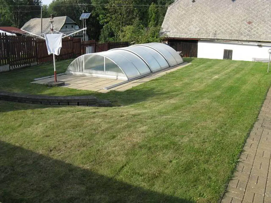 Venkovní zastřešená terasa s posezením, venkovní krb s možností grilování, velký zapuštěný a krytý bazén 3x5 m