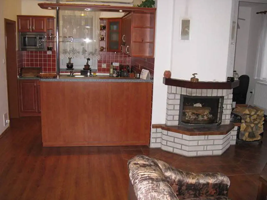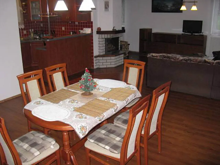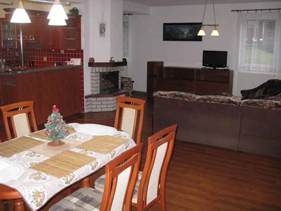 V přízemí - obytná část spojená s kuchyní - sedací souprava, krb, LCDTV, jídelní stůl a židle, vybavení kuchyně - varná sklokeramická deska, pečící trouba, mikrovlnka, varná konvice, lednice s mrazákem, nádobí. 3 ložnice - v přízemí 1x3, v patře 1x3 + 1x2 + přistýlka. Soc. zařízení - koupelna s vanou, samostatné WC s umyvadlem. Topení - plynový kotel a solární panely, krb - tuhá paliva