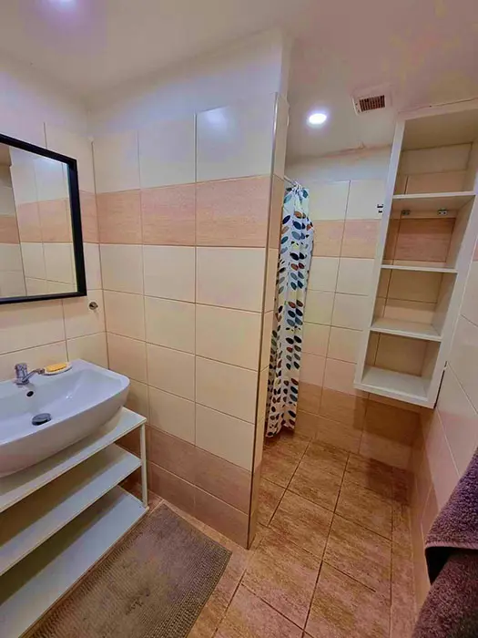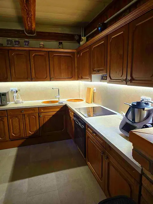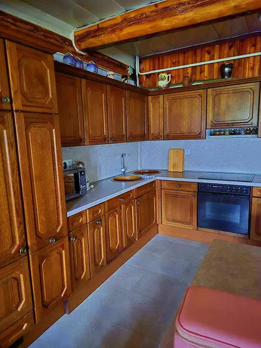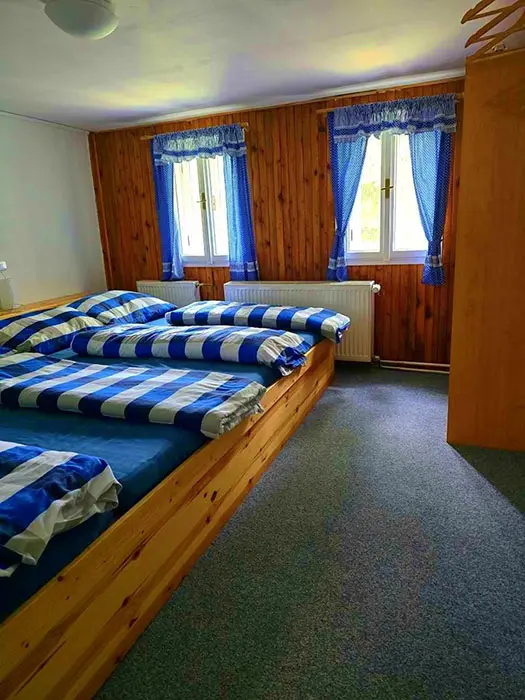 Vstupní chodba, v přízemí - velká prostorná obývací místnost spojená s kuchyní - krb, 3 sedací soupravy, LCDTV, křesla, jídelní stůl a židle, vybavení kuchyně - varná sklokeramická deska, el. trouba, mikrovlnka, kávovar Nespresso, myčka, 5 lednic ( v další místnosti ), nádobí. 9 ložnic - 1. patro - 1x2, 2x3, 3x4, 2. patro - 1x2, 2x4 s matracemi na zemi vhodné pro spaní dětí. K dispozici dětská jídelní židlička a postýlka - nutno domluvit předem. Soc. zařízení - 3x WC + pisoár, v přízemí a v patře nové koupelny se sprchou. Topení - tepelné čerpadlo v celém objektu. V přízemí finská sauna a autom. pračka.