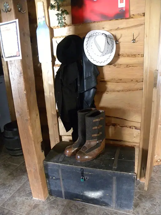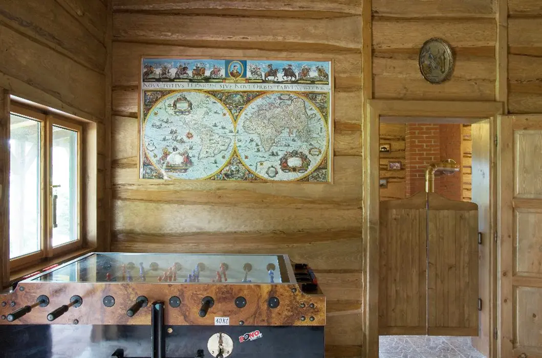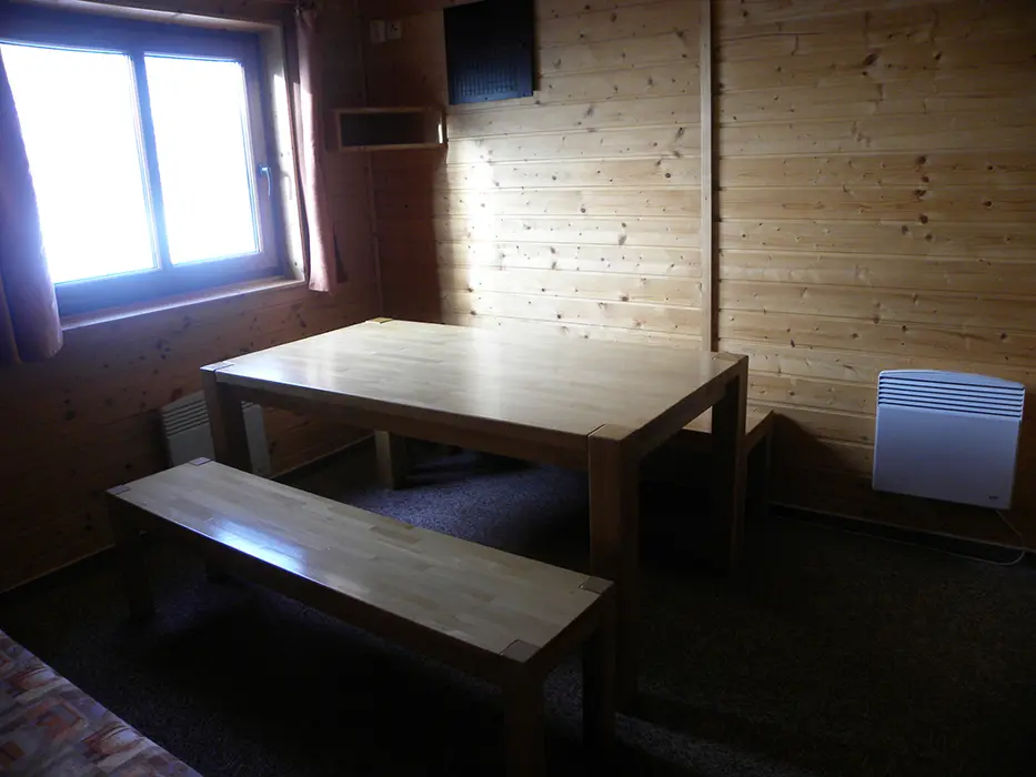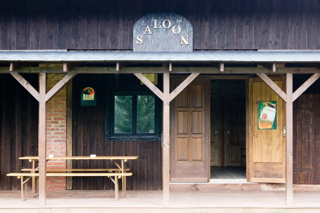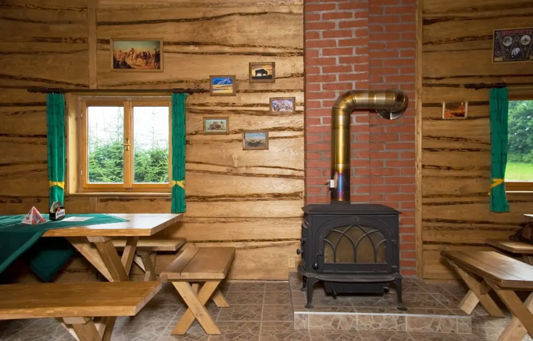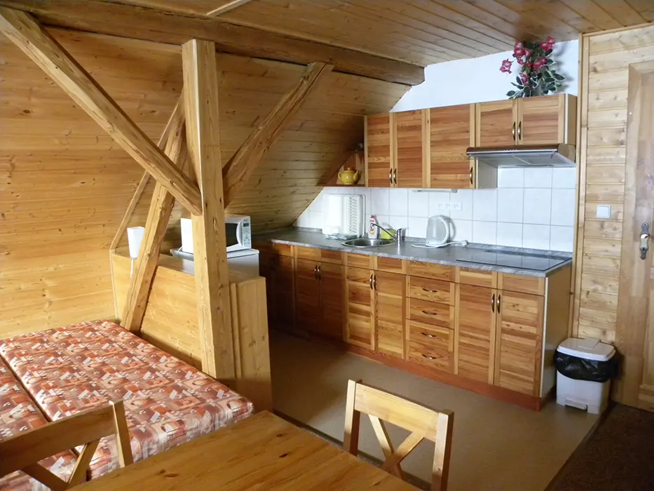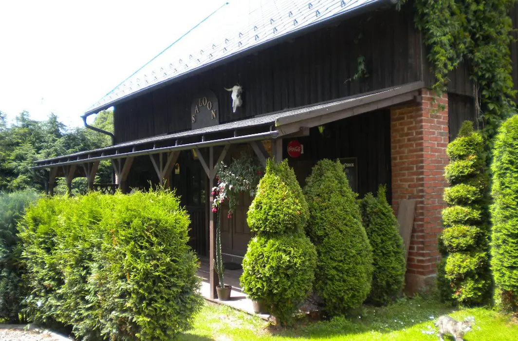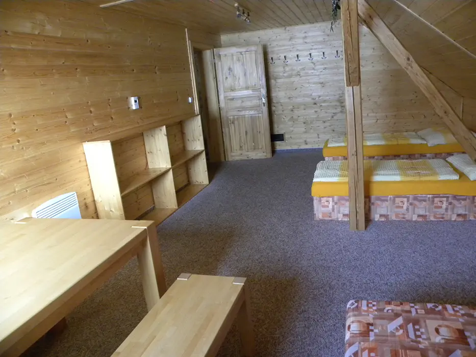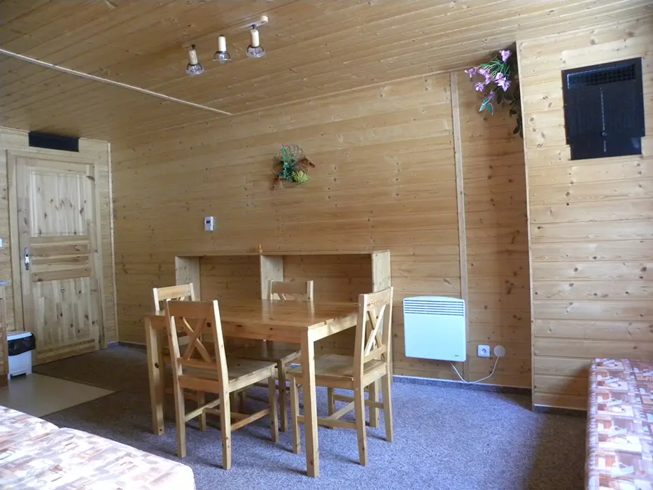 V přízemí - společenská místnost ve westernovém stylu - jen pro ubytované klienty - obsluha majitelem objektu. V patře - velký pokoj s kuchyňským koutem ( sklokeramická varná deska, lednice, mikrovlnka, varná konvice, nádobí ), stůl a židle, 4 lůžka, další ložnice 1x4 lůžka. Sociální zařízení - sprchový kout, WC. Topení - centrální