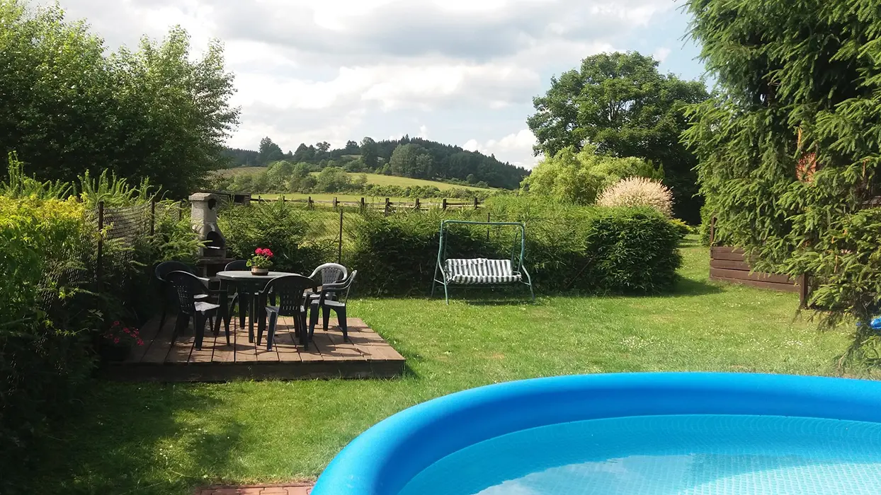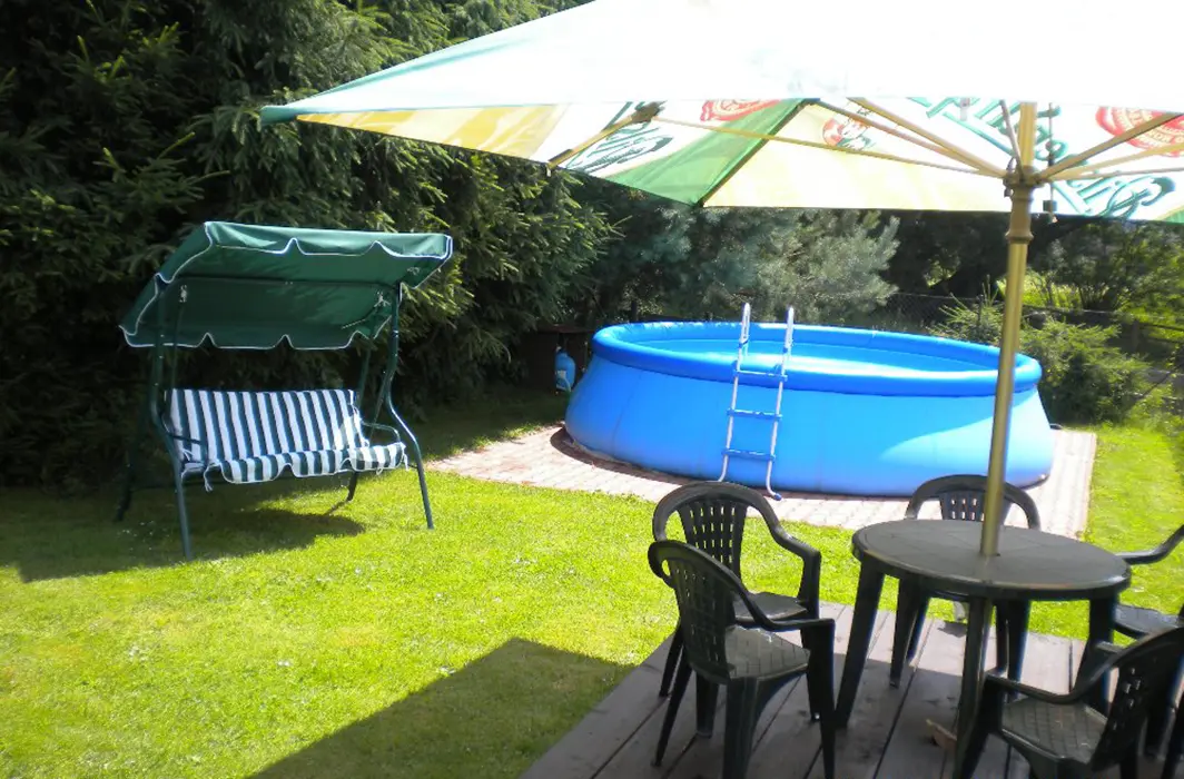 Venkovní terasa s posezením, zahradní krb, nadzemní bazén 4,5 m x 1,05 m, malý sportovní areál ( dětské hřiště, pískoviště, prolézačka, basketbalový koš, fotbal, volejbal )