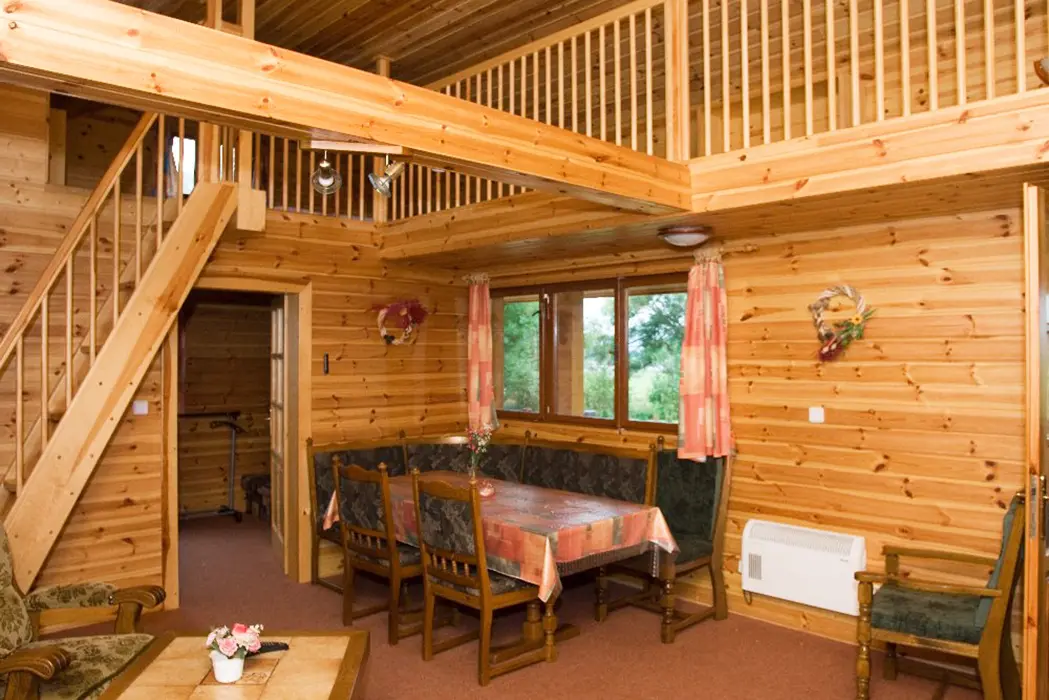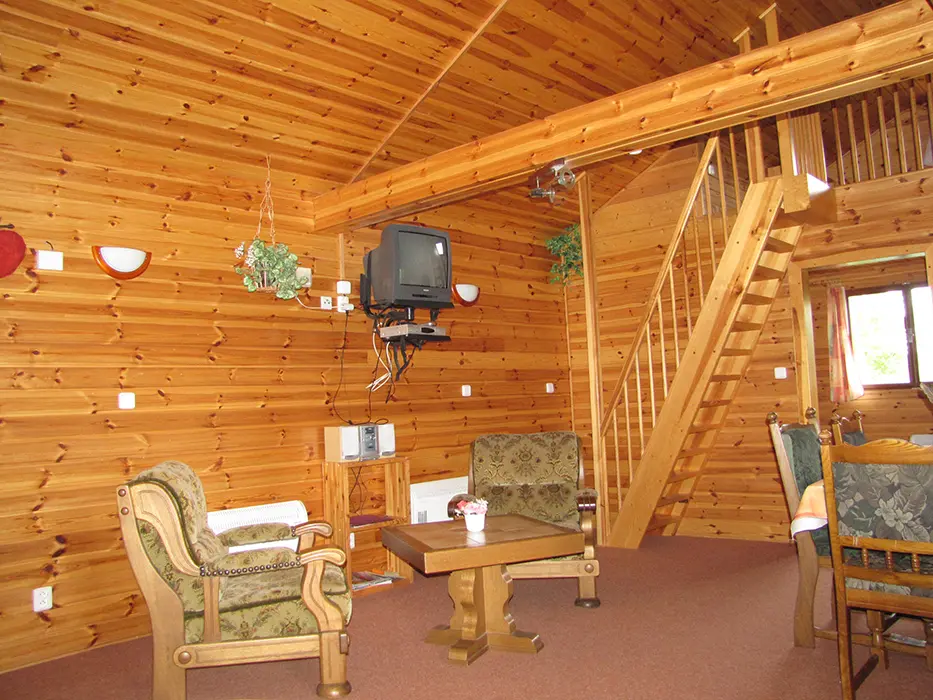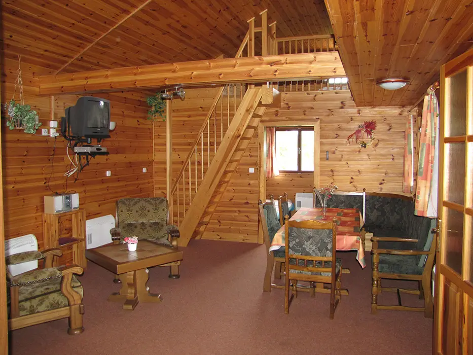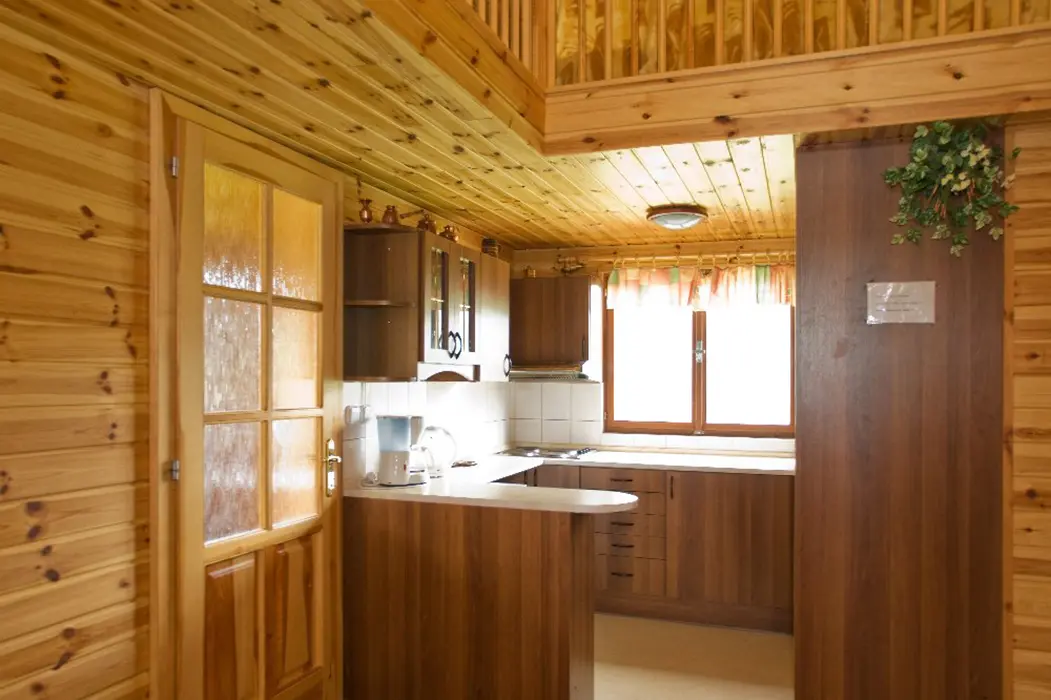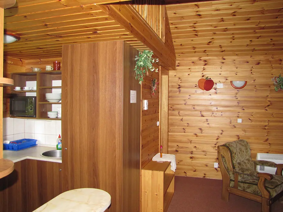 V přízemí - obývací pokoj s posezením, jídelní kout. Kuchyně - el. sporák, mikrovlnka, varná konvice, lednice s mrazákem, nádobí. 3 ložnice - v přízemí 1x3 lůžka, v podkroví se sníženým stropem 2 otevřené ložnice až pro 6 osob. Koupelna se sprchovým koutem, WC. Topení - centrální. V objektu je klimatizace.