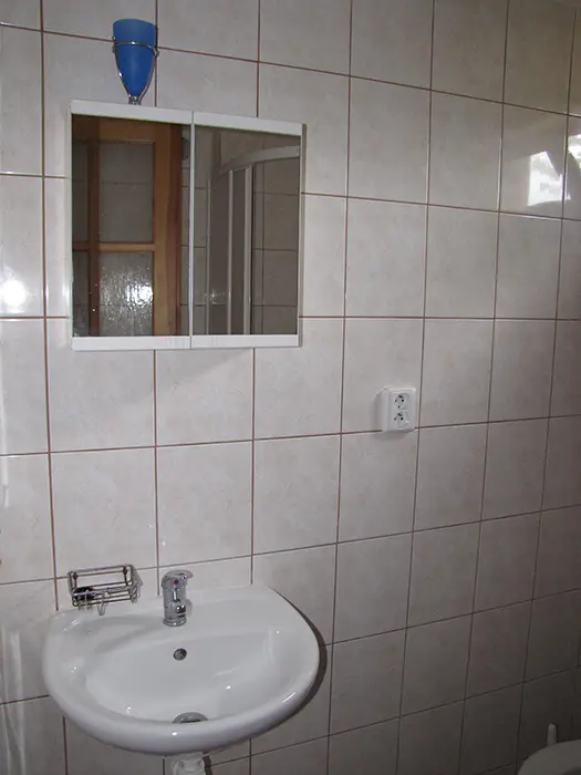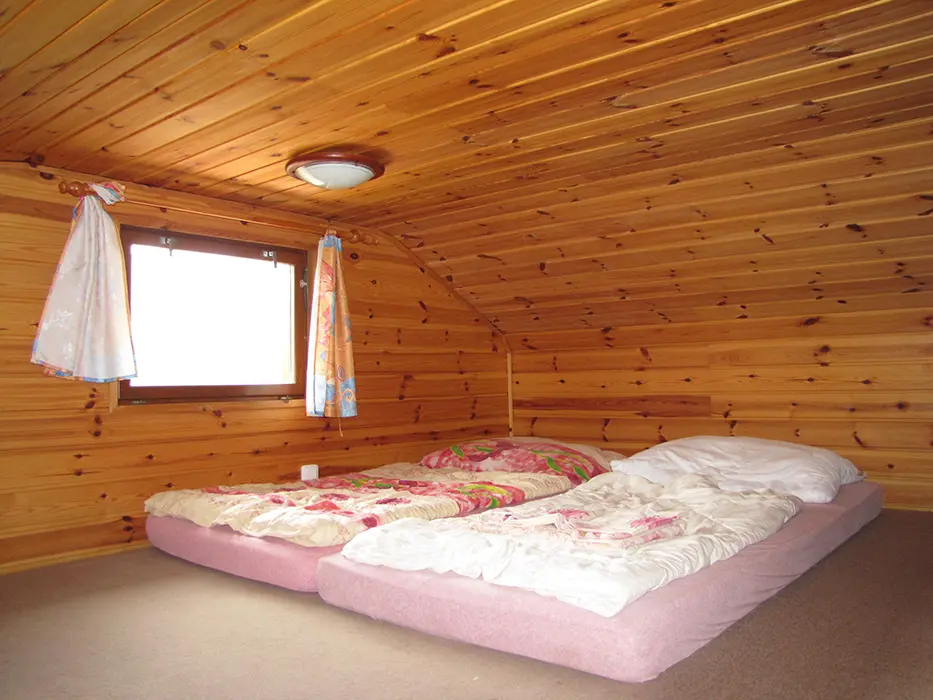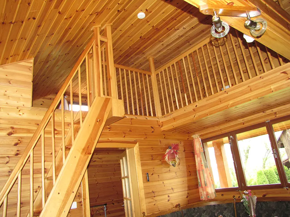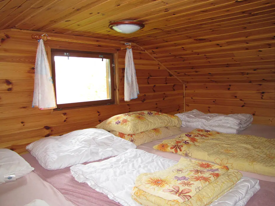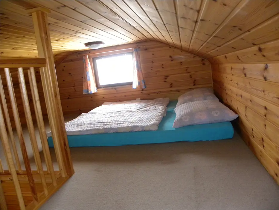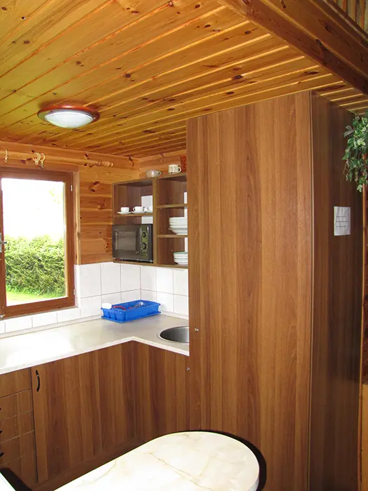 V přízemí - obývací pokoj s posezením, jídelní kout. Kuchyně - el. sporák, mikrovlnka, varná konvice, lednice s mrazákem, nádobí. 3 ložnice - v přízemí 1x3 lůžka, v podkroví se sníženým stropem 2 otevřené ložnice až pro 6 osob. Koupelna se sprchovým koutem, WC. Topení - centrální. V objektu je klimatizace.
