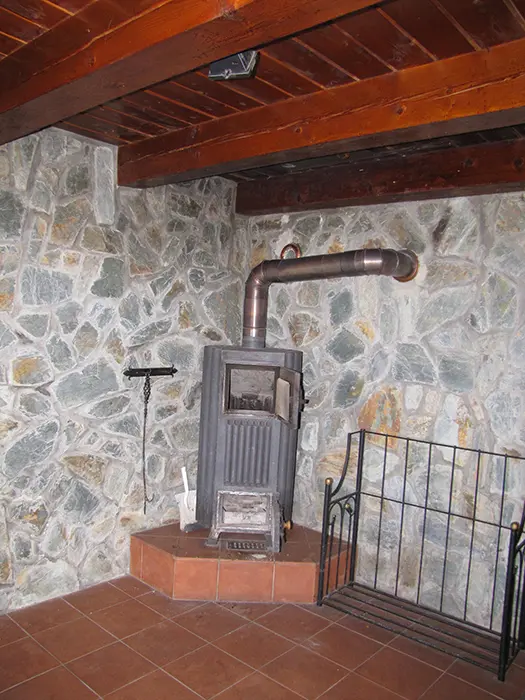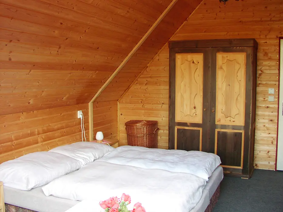 V přízemí obývací pokoj s posezením, krbová kamna, kuchyně - el. sporák, mikrovlnka, varná konvice, lednice s mrazákem, nádobí. V patře 2 ložnice 2x4 lůžka. Koupelna - vana, umyvadlo, WC. Topení - centrální.