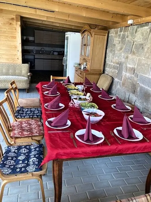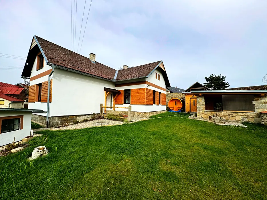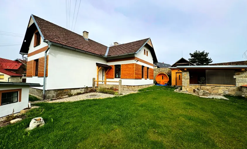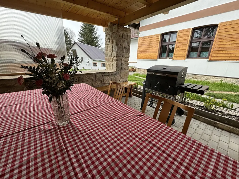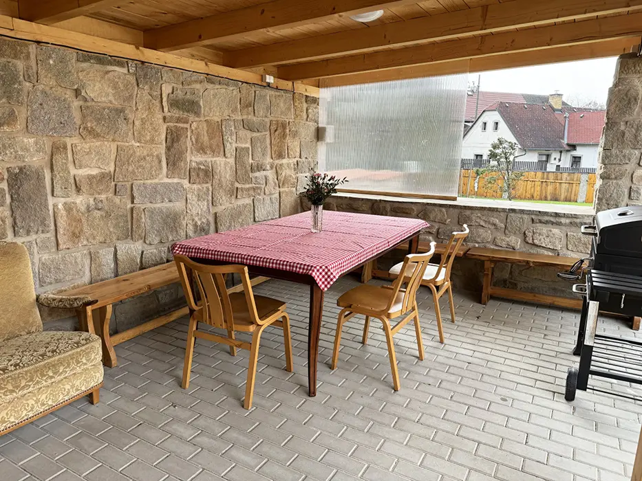 Zastřešená pergola - posezení, bazén 2x3m, dětské pískoviště, přenosný gril na dřevěné uhlí, výčepní zařízení - zapůjčení po předchozí dohodě za poplatek, vybavená venkovní kuchyně, sudová sauna, možnost uschování kol po dohodě v garáži