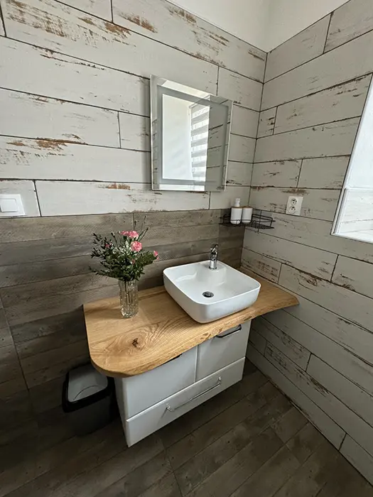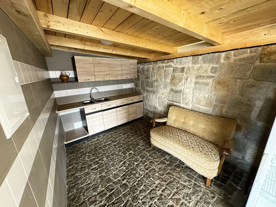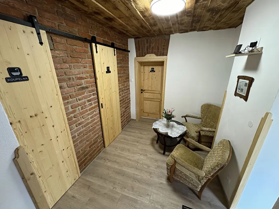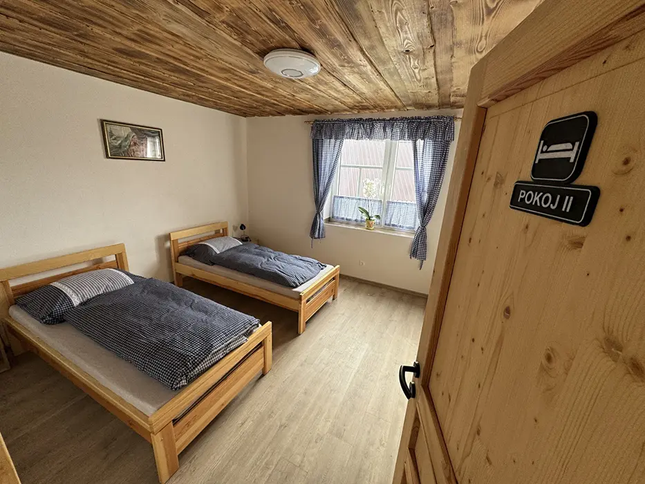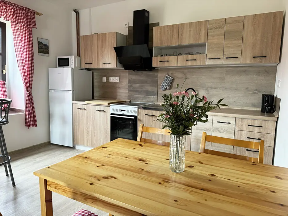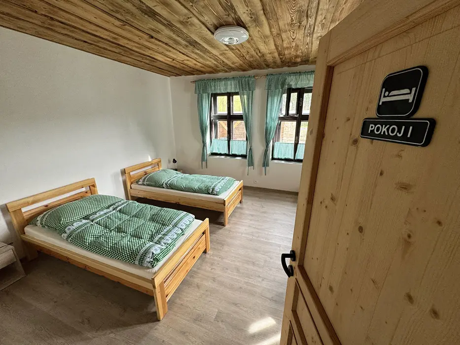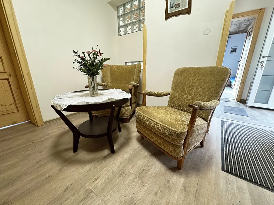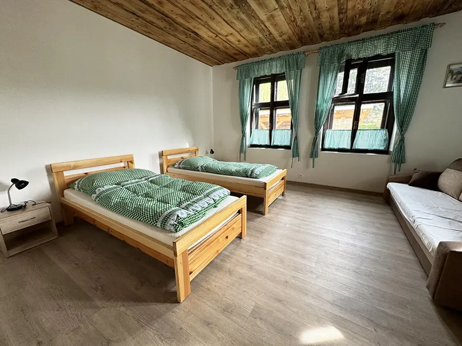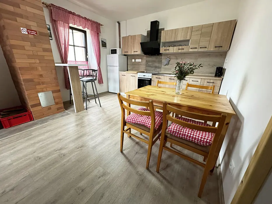 Vstupní chodba, obytná kuchyně - stůl a židle, el. sporák, varná konvice, lednice s mrazákem, nádobí, mikrovlnka, krbová kamna. 2 ložnice - 2x2 lůžka + v každé sedačka - možnost přistýlky. Dětská postýlka na vyžádání. Soc. zařízení - koupelna se sprchou, umyvadlo, samostatné WC + další koupelna se sprchou + WC - venku, vedle sauny. K dispozici pračka. Topení - podlahové na tepelné čerpadlo. Voda v objektu - z vlastní studny, pro použití je nezávadná (rozbor studniční vody je k nahlédnutí na místě), k dispozici je kupovaná pitná voda