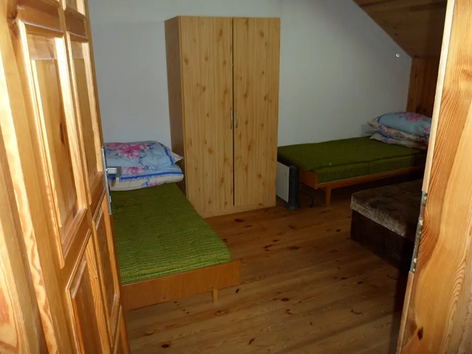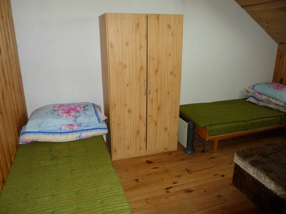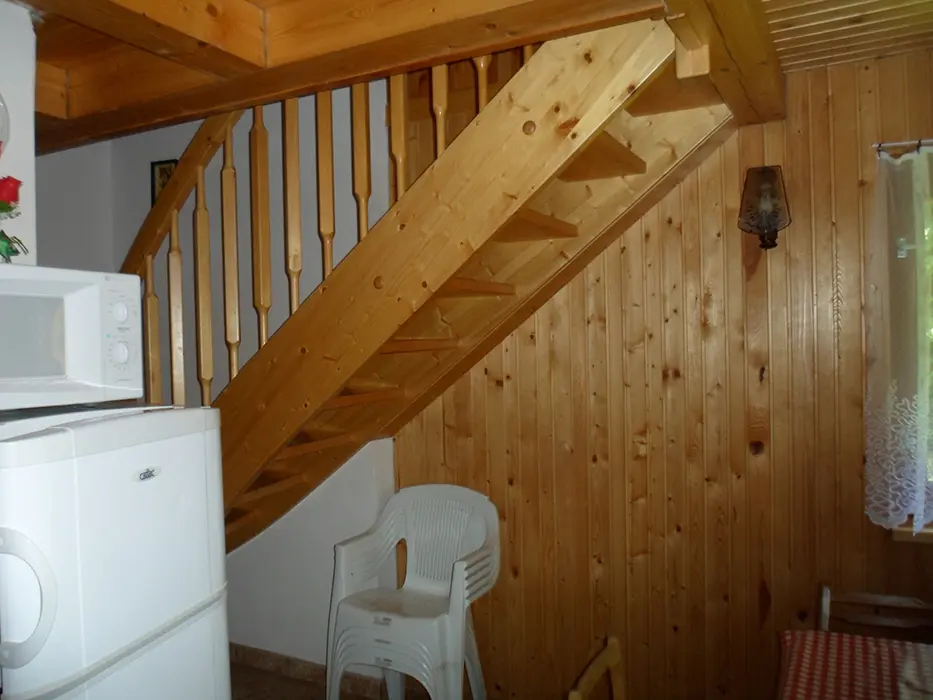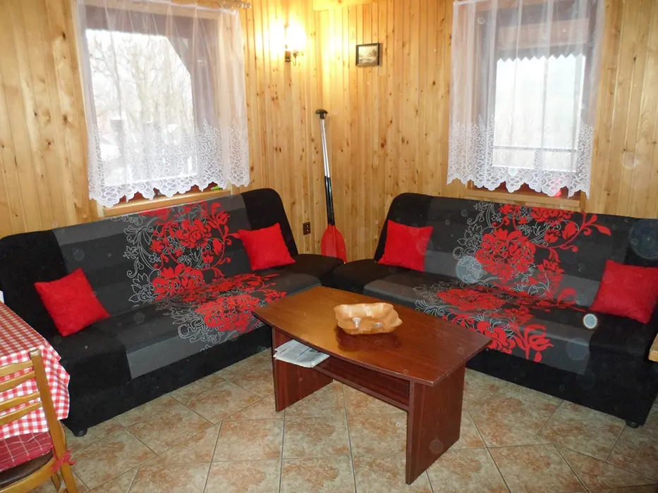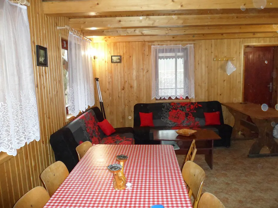 Jedná se o dvojchatu - 1/2 se nepronajímá, druhá část: posezení, vlastní vchod. Kuchyňský kout propojený se společenskou místností, TV, SAT, lednice, mrazák, plynový sporák, elektrická trouba, mikrovlnná trouba, rychlovarná konvice, krbová kamna, jídelní stůl, židle. 2 ložnice 2x4 lůžka. Sociální zařízení - koupelna s WC a sprchovým koutem. Topení - krbová kamna, přímotopy.
