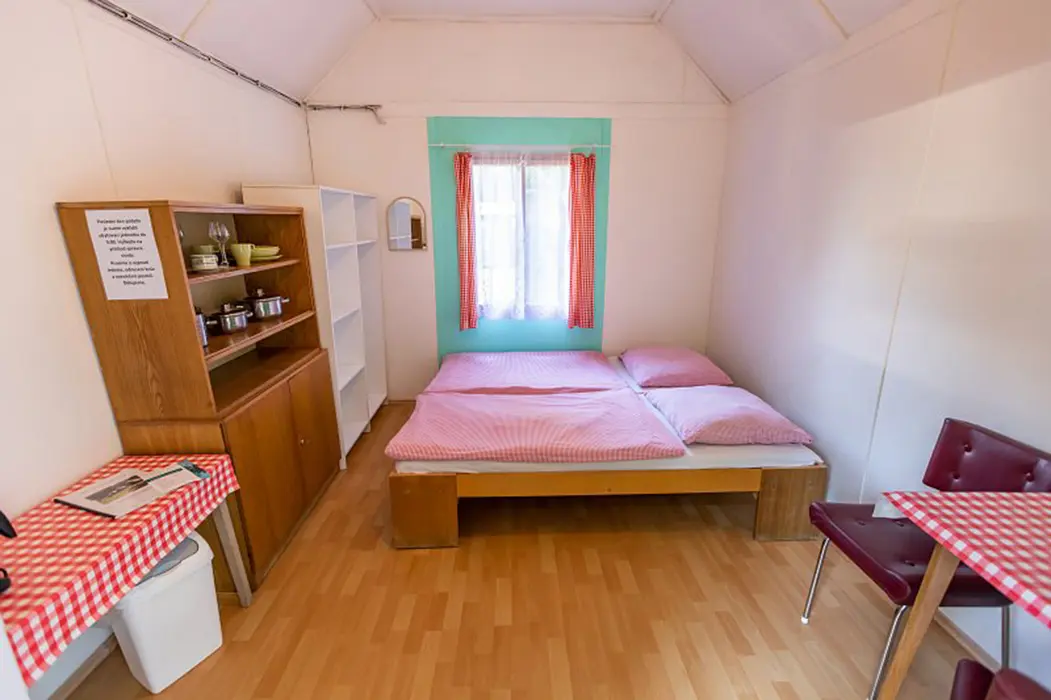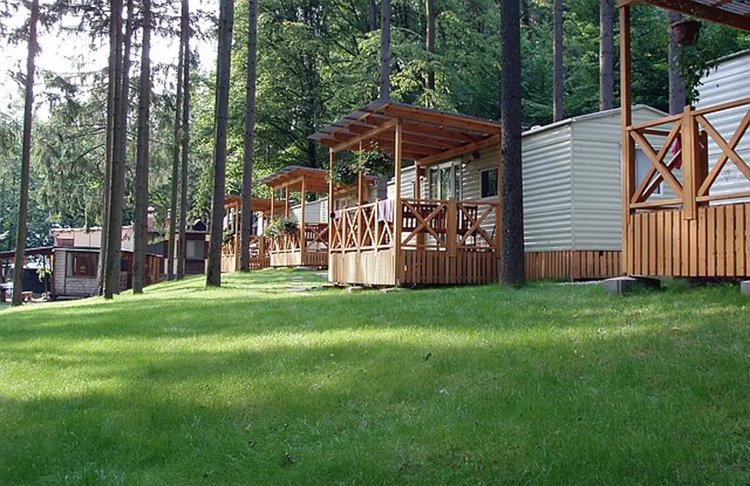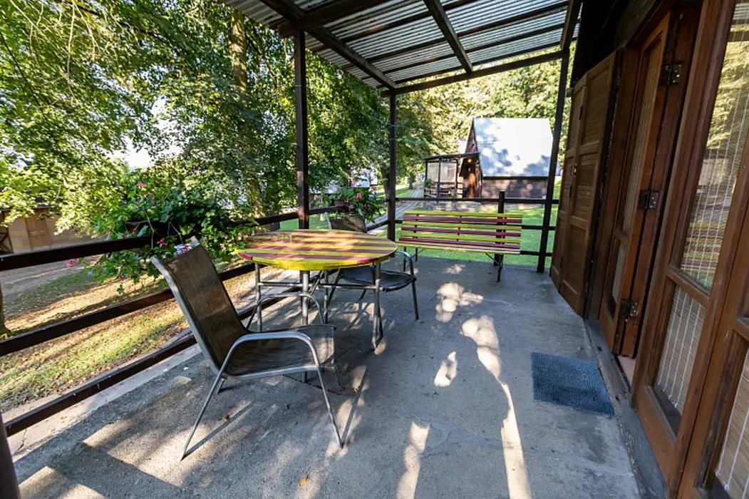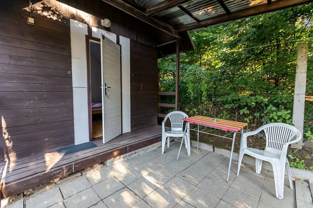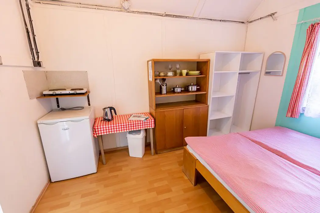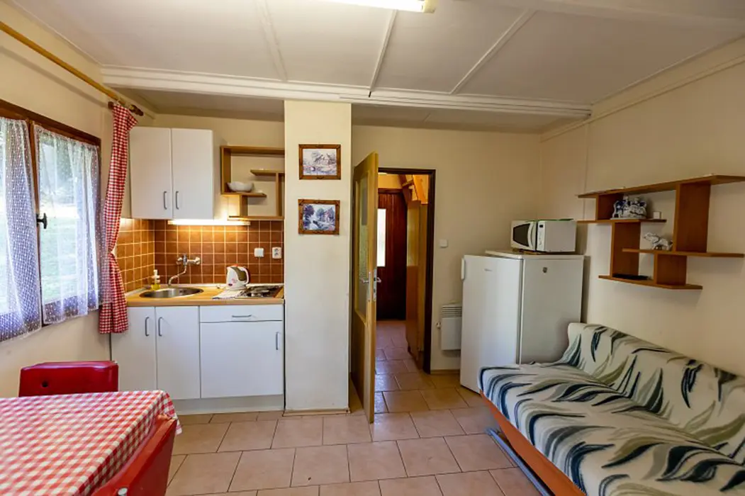 15 chatek ( 2-5 lůžkové ), v každé: zásuvka 220 V, osvětlení, lůžka, lůžkoviny, skříň na šaty, stolek, židle, lednička s mrazáčkem, vařič, rychlovarná konvice, základní nádobí, venkovní posezení, WC a sprchy jsou zdarma společné v areálu.