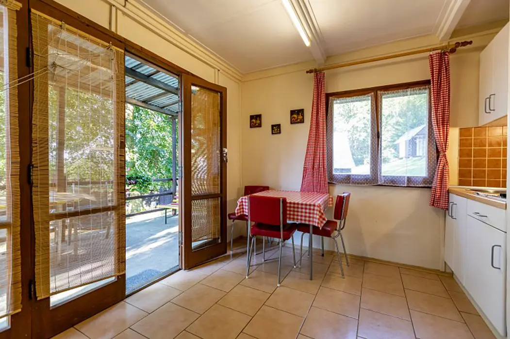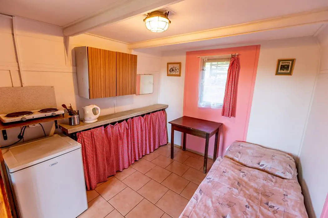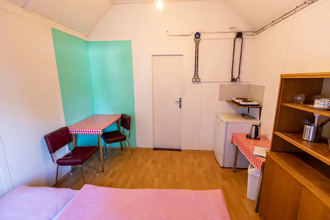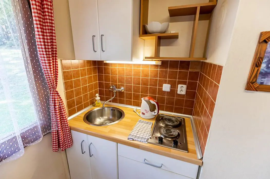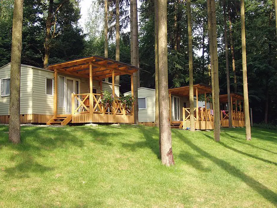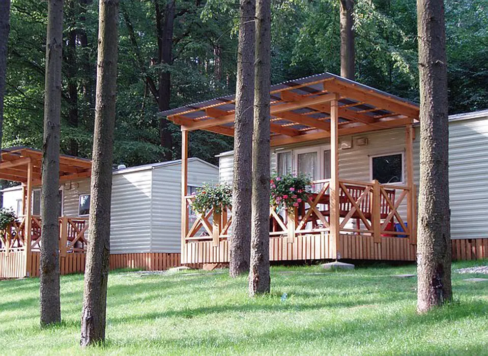 15 chatek ( 2-5 lůžkové ), v každé: zásuvka 220 V, osvětlení, lůžka, lůžkoviny, skříň na šaty, stolek, židle, lednička s mrazáčkem, vařič, rychlovarná konvice, základní nádobí, venkovní posezení, WC a sprchy jsou zdarma společné v areálu.