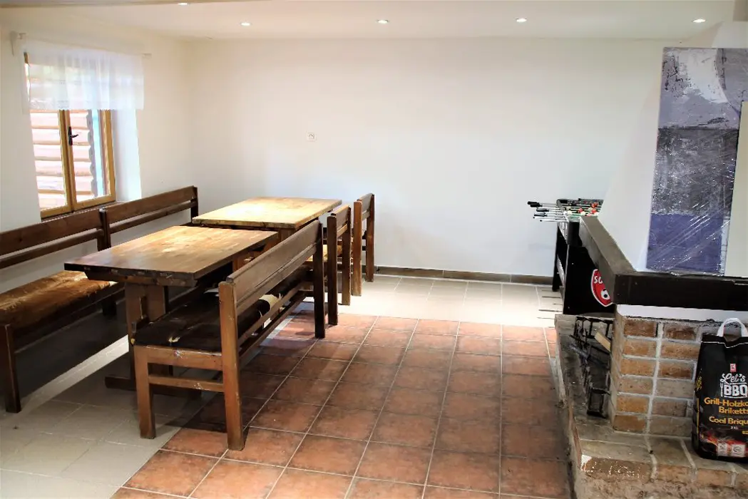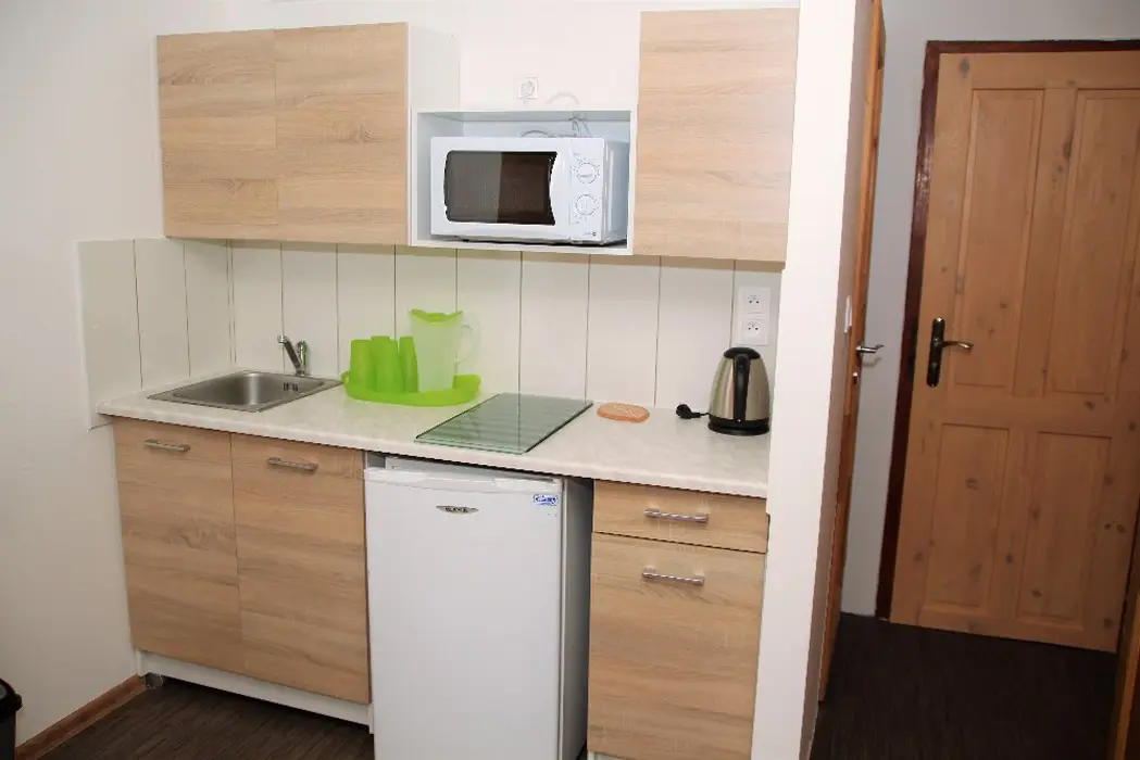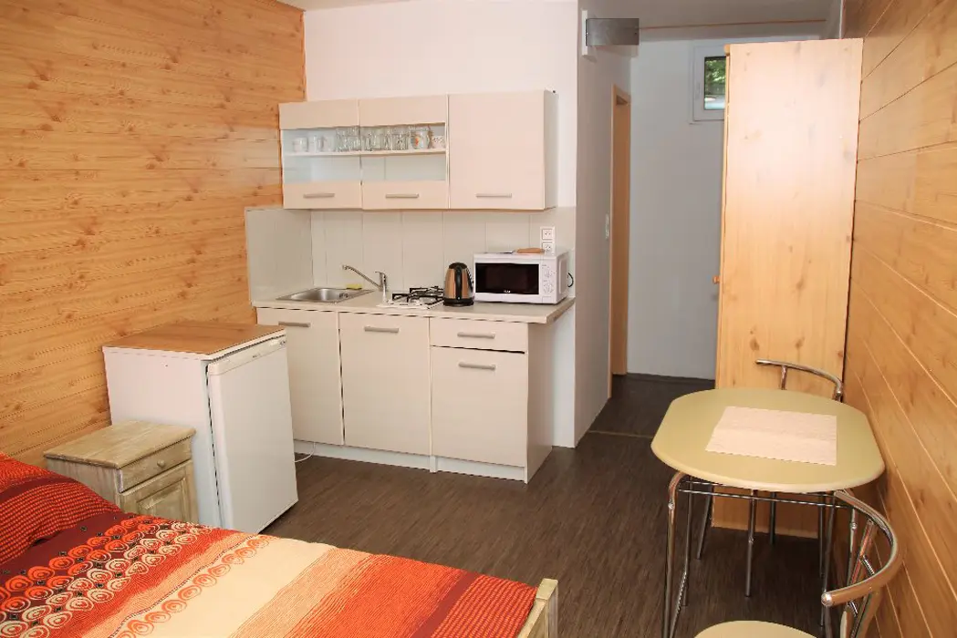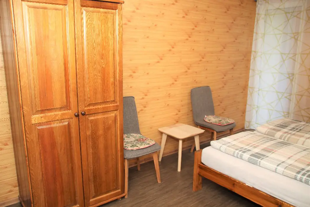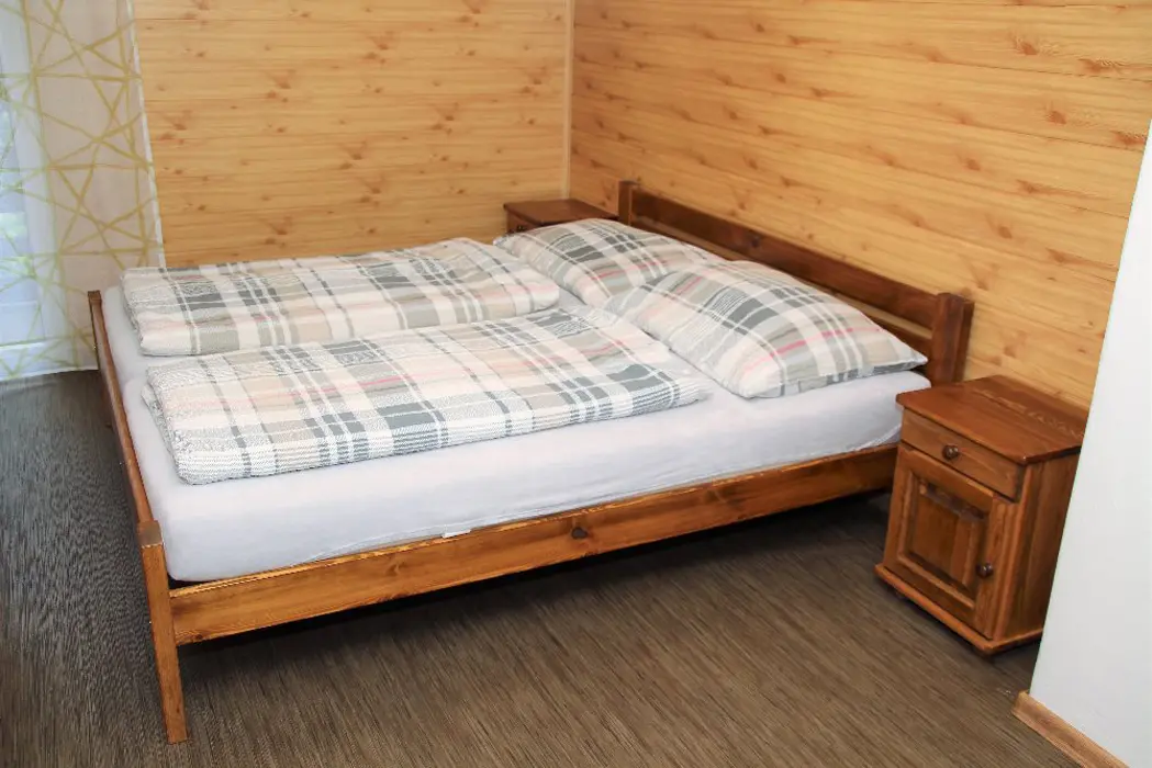 V přízemí hospůdka s barem a krbem, velkoplošná BTV, možnost stravování ( není zahrnuto v ceně ubytování ). 10 pokojů – 3x2, 3x3, 3x4, 1x5 lůžek, každý má kuchyňku - dvouplotýnkový pl. vařič, lednice, základní nádobí. Sociální zařízení - sprchový kout + WC, balkon s výhledem. Topení el. přímotopy