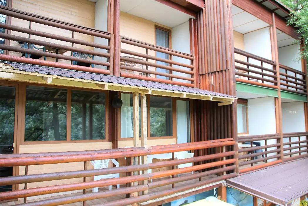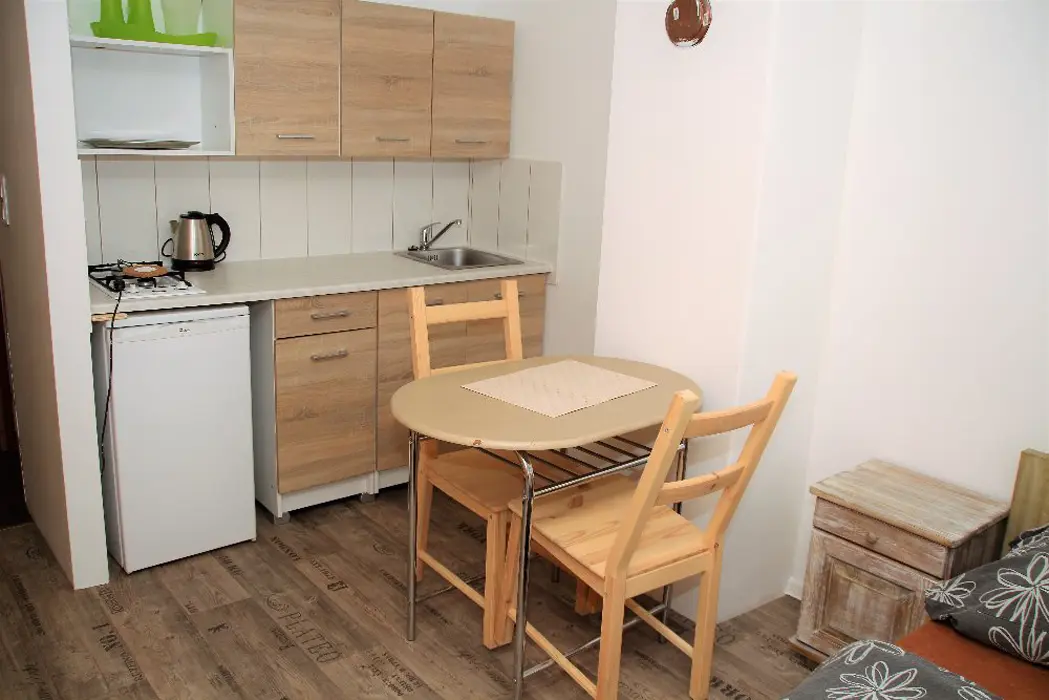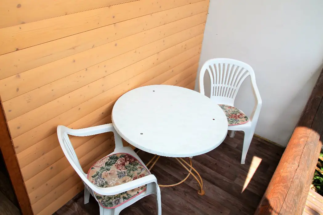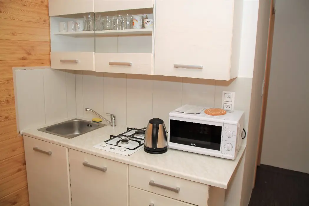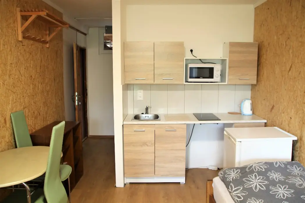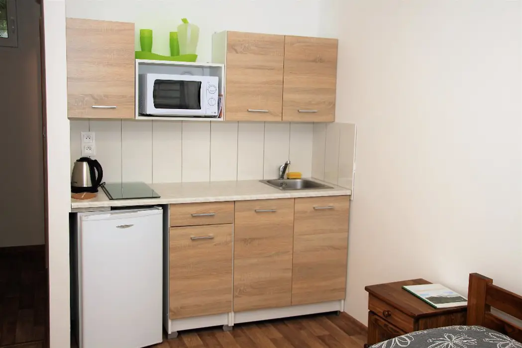 V přízemí hospůdka s barem a krbem, velkoplošná BTV, možnost stravování ( není zahrnuto v ceně ubytování ). 10 pokojů – 3x2, 3x3, 3x4, 1x5 lůžek, každý má kuchyňku - dvouplotýnkový pl. vařič, lednice, základní nádobí. Sociální zařízení - sprchový kout + WC, balkon s výhledem. Topení el. přímotopy