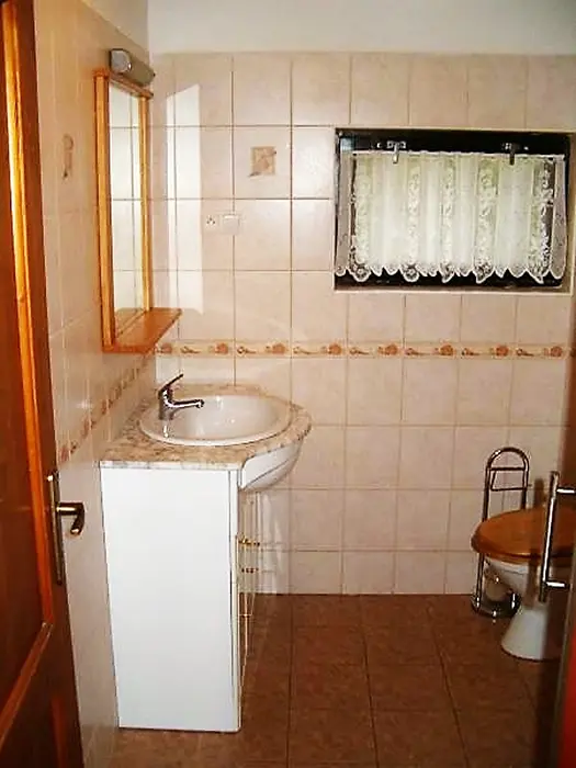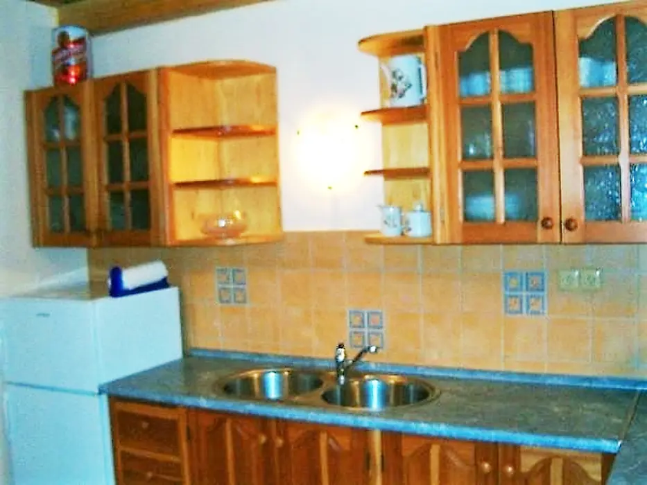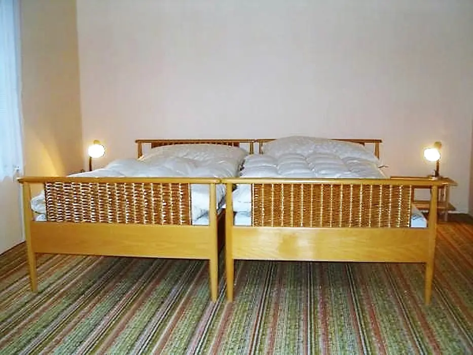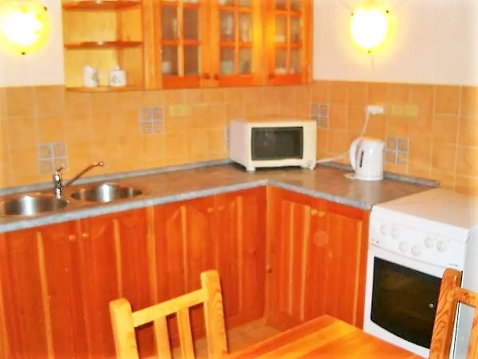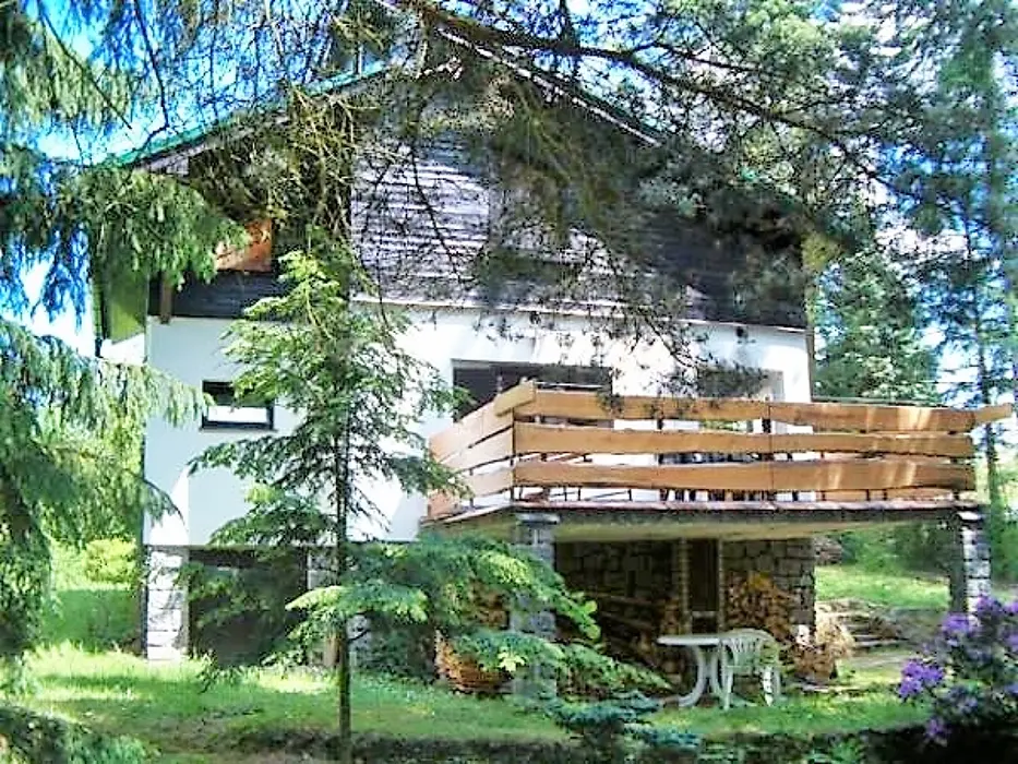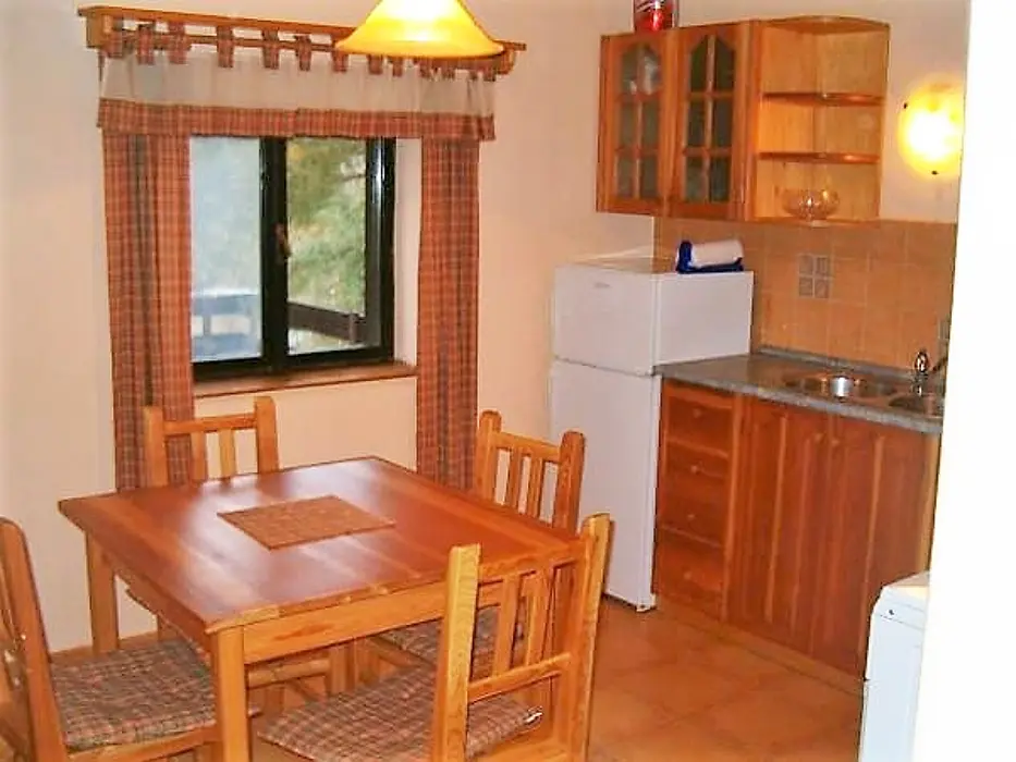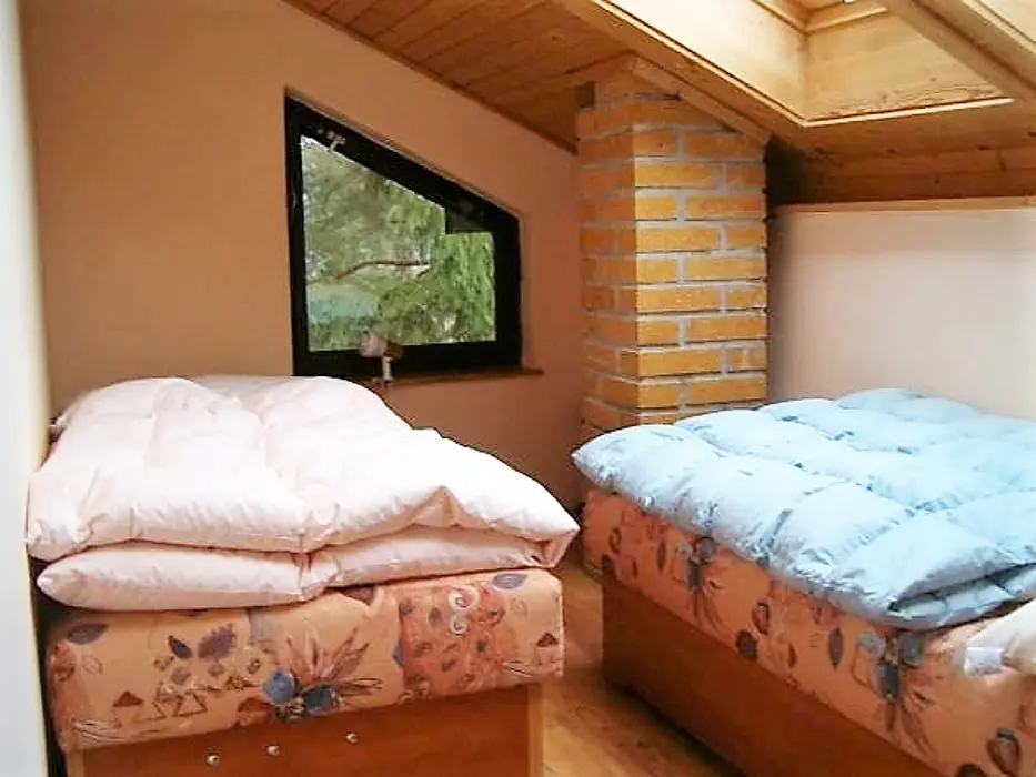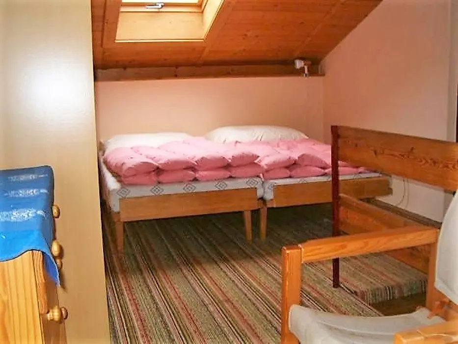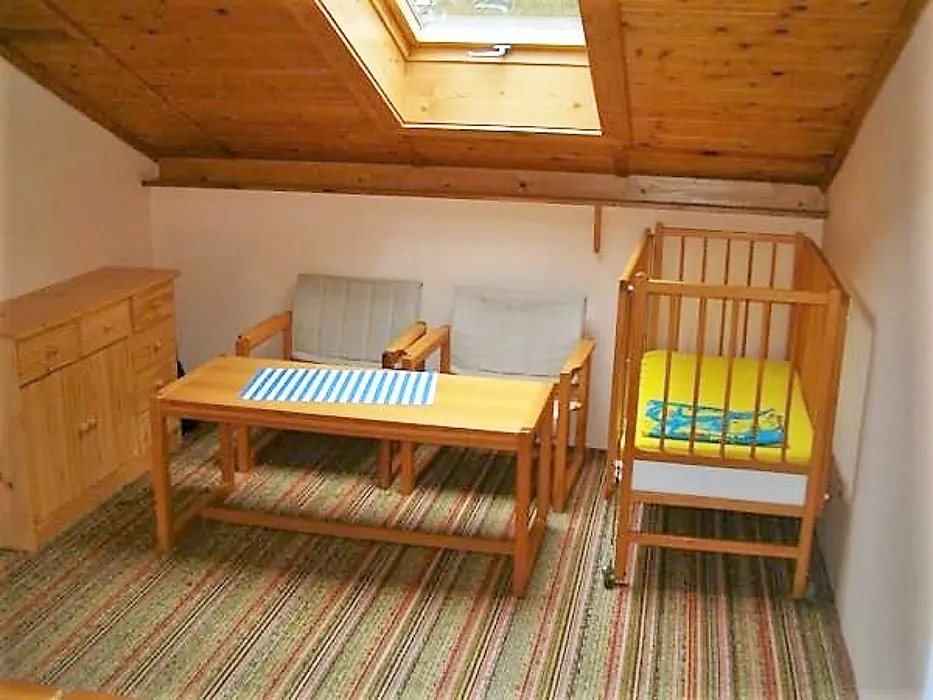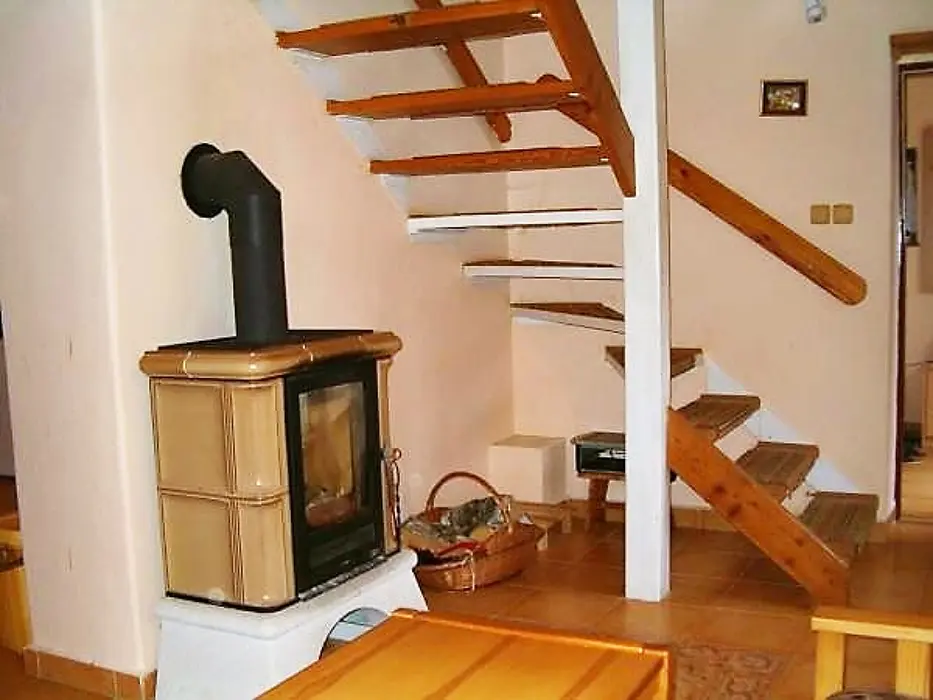 Obytná část s posezením, stůl, židle, TV, SAT, krbová kamna spojená s kuchyní - el. sporák s troubou, lednička 160 l s mrazícím boxem, mikrovlnka, varná konvice, nádobí. V patře 3 ložnice - 3x2 lůžka, k dispozici dětská postýlka ( za poplatek 500 Kč ). Soc. zařízení - sprchový kout, umyvadlo, WC. Topení - krbová kamna, el. přímotopy