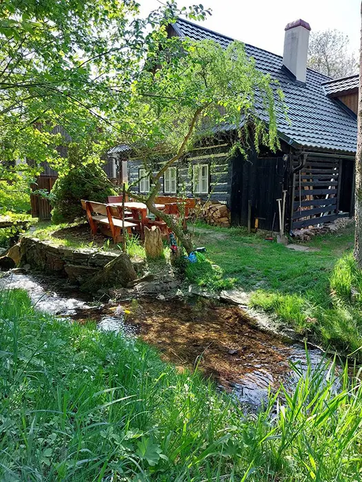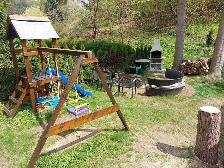 Venkovní posezení u zahradního krbu, pro děti - houpačky a prolézačky, další posezení u potůčku