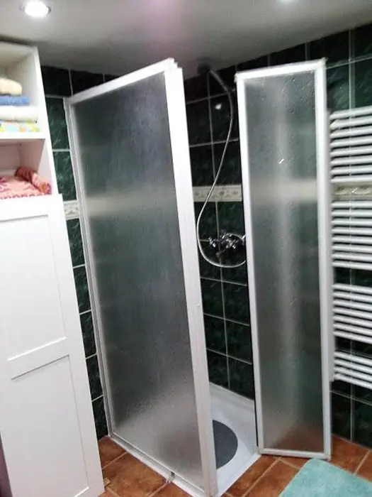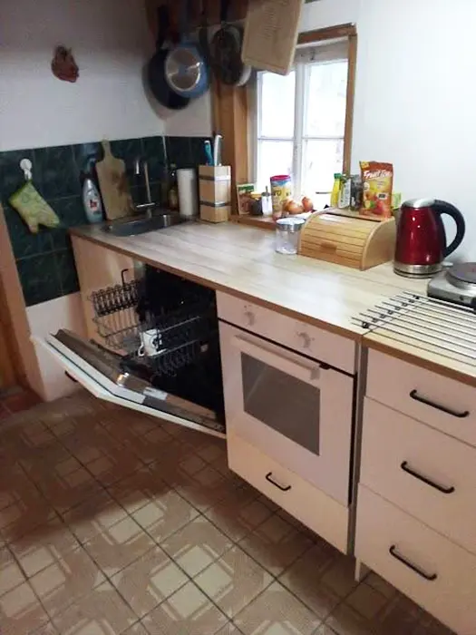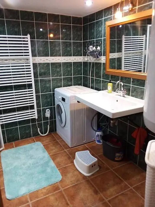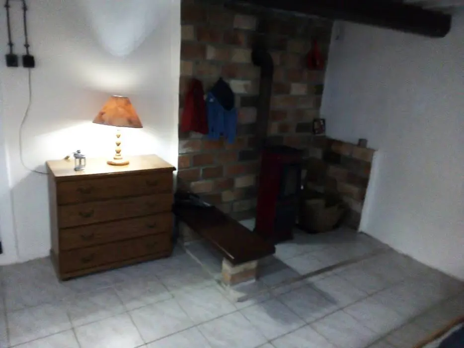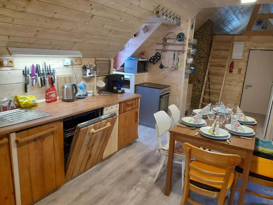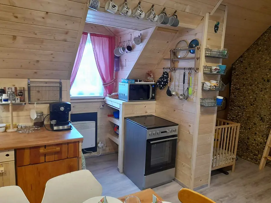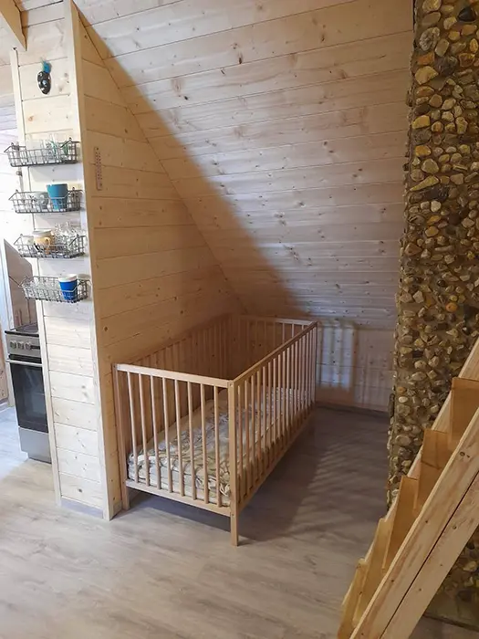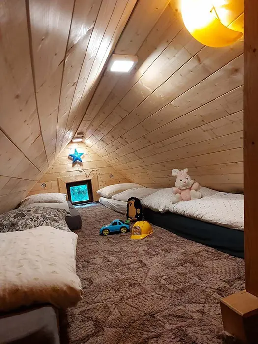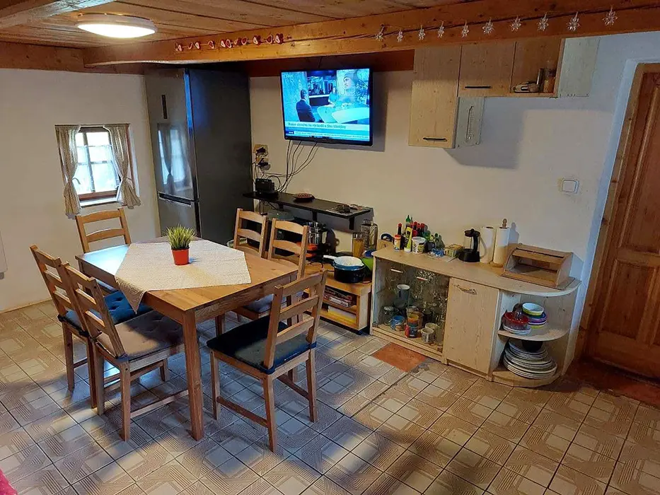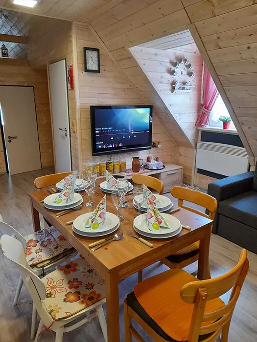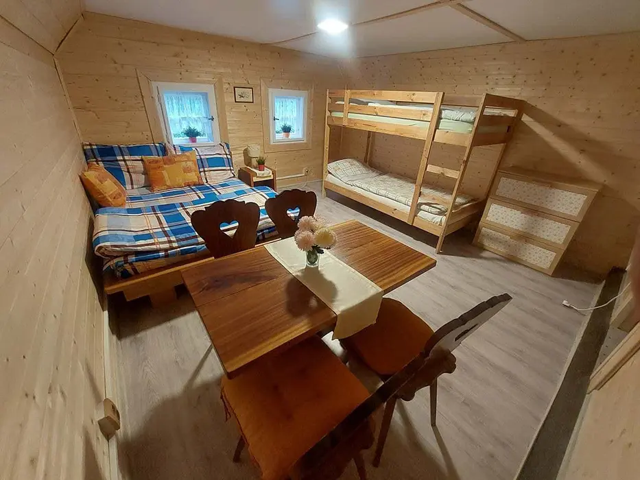 Vstupní chodba, prostorná obytná část - posezení - možnost 2 přistýlek, jídelní stůl a židle, LCDTV, 2 kuchyňské kouty - el. trouba, lednice, el. dvouplotýnka, el. sporák, myčka, mikrovlnka, espresso, varná konvice, nádobí. 3 ložnice - 2x4 lůžka - uzavřené, 1x4 lůžka - přístup je po žebříku z obytné části - tzv. spaní ve špici - matrace na zemi. 2 dětské postýlky, dětská židlička. Soc. zařízení - 2 koupelny - 1x se sprchovacím koutem + WC, 1x s vanou + WC. Topení - krbová kamna na dřevo + el. přímotopy