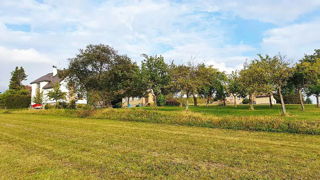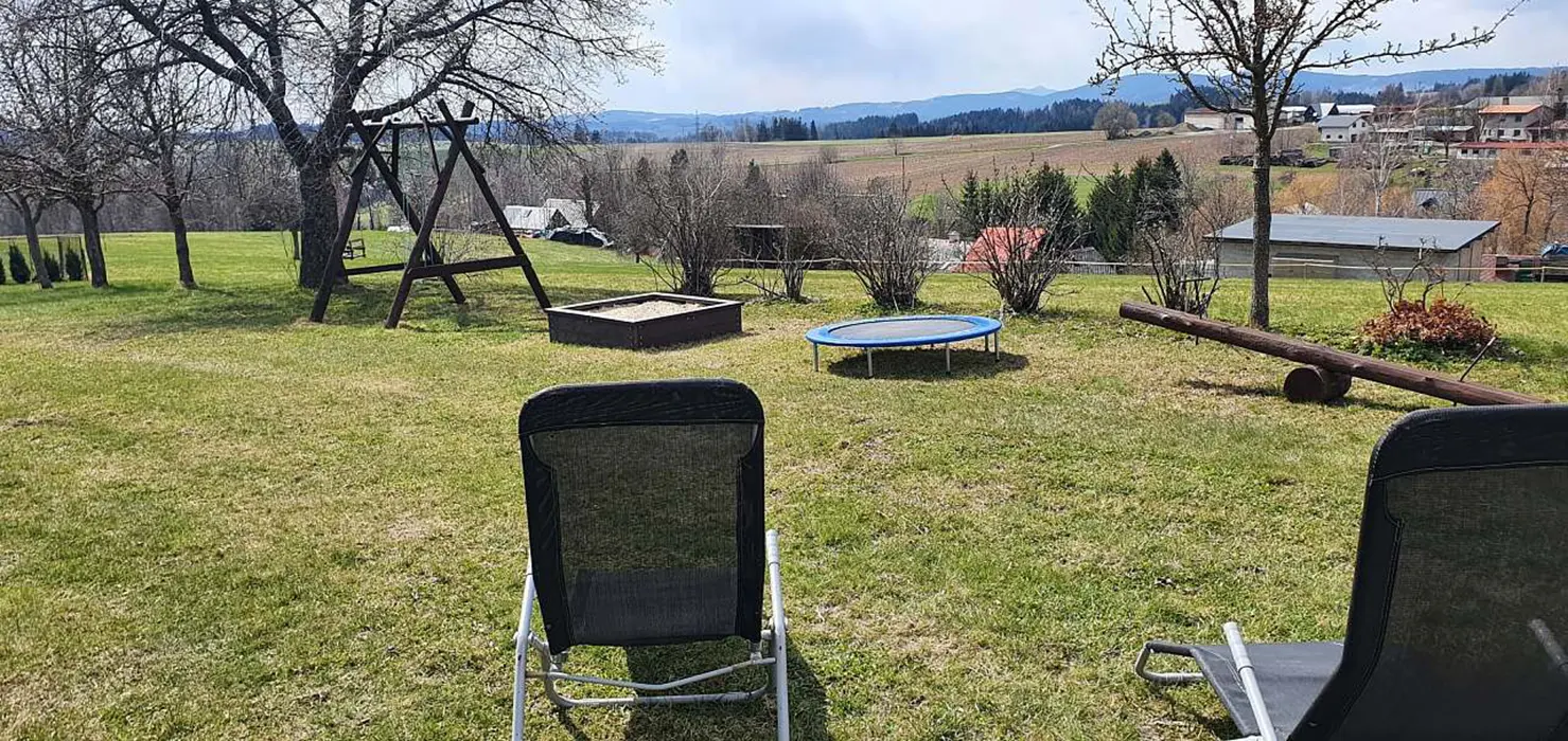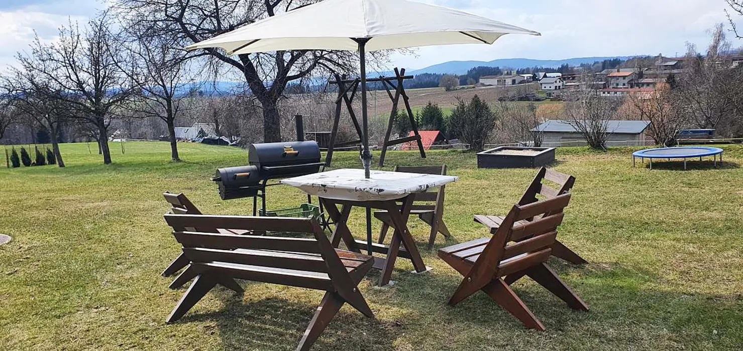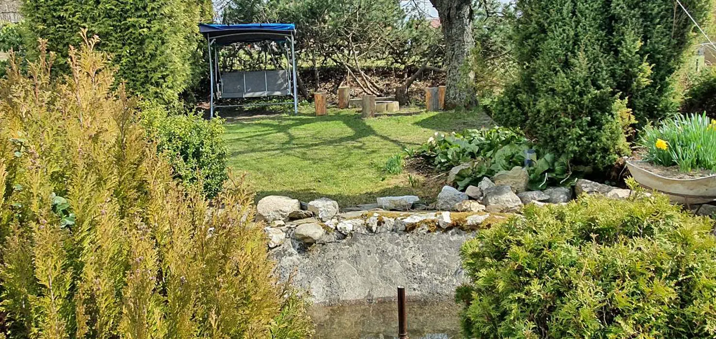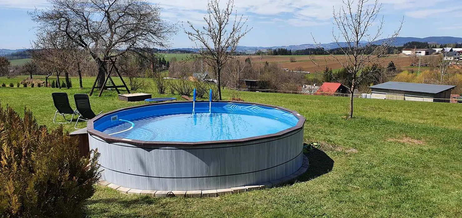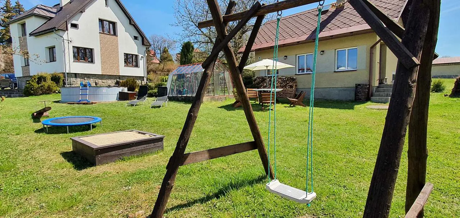 Velká zahrada, posezení se slunečníkem, gril, ohniště, houpačka, nadzemní bazén 4m, pískoviště, malá trampolína