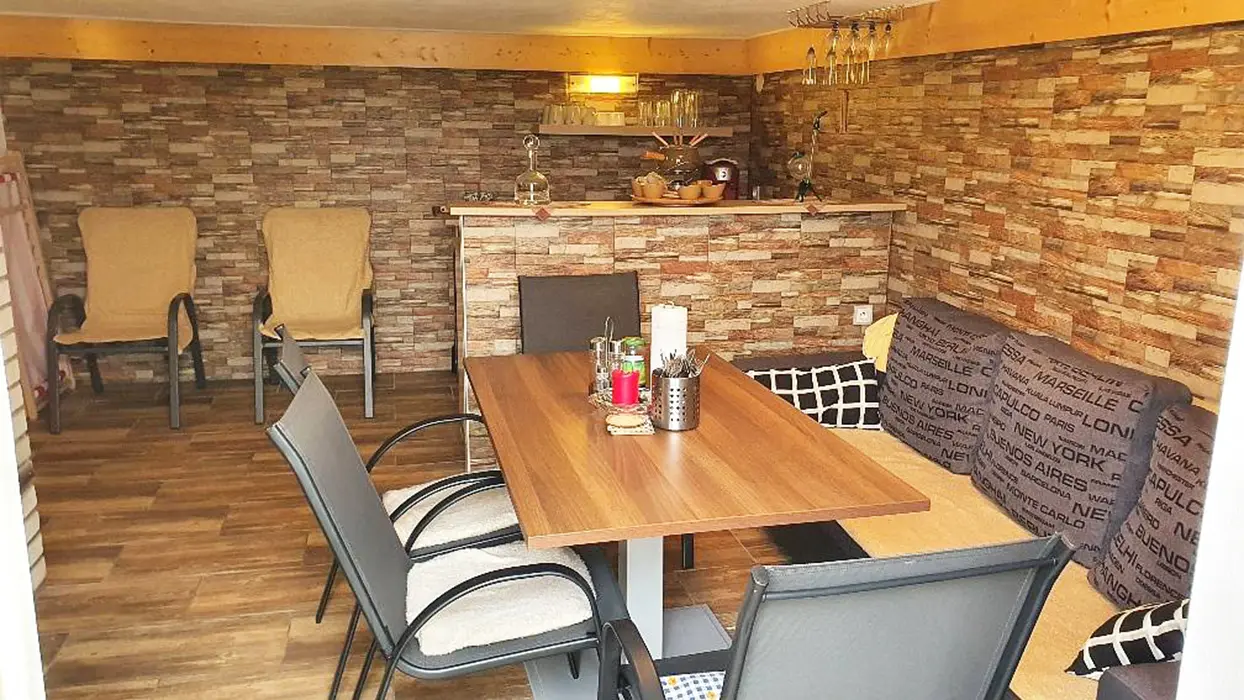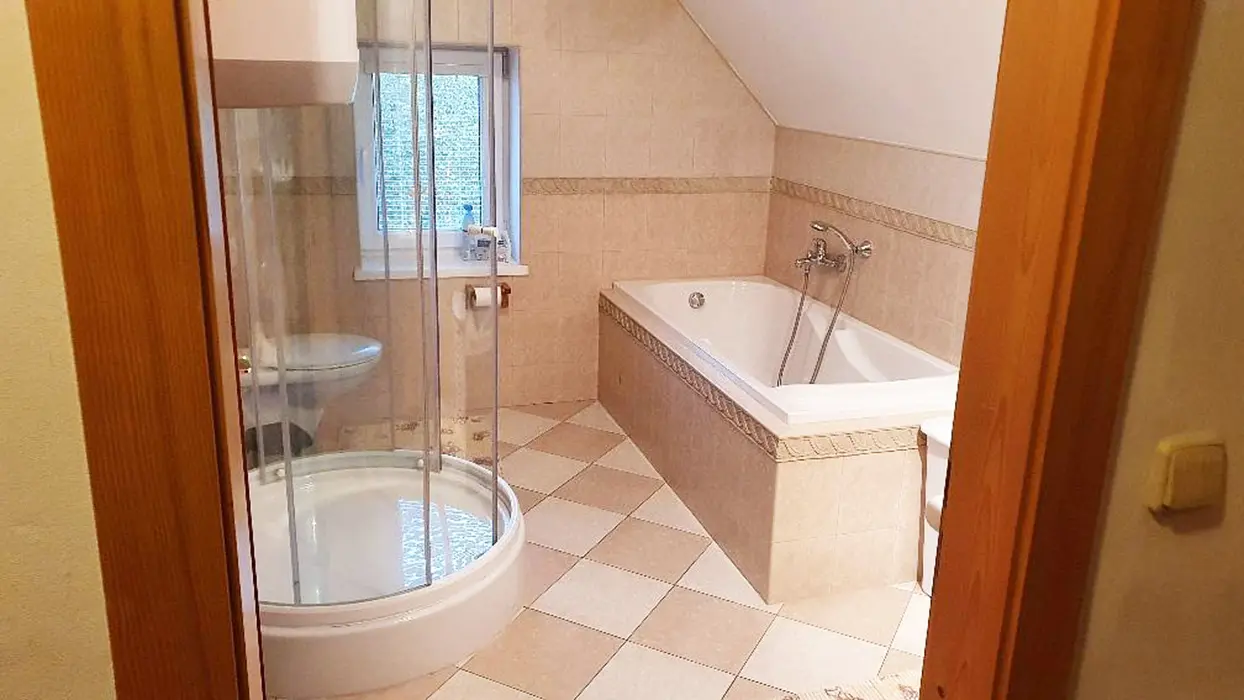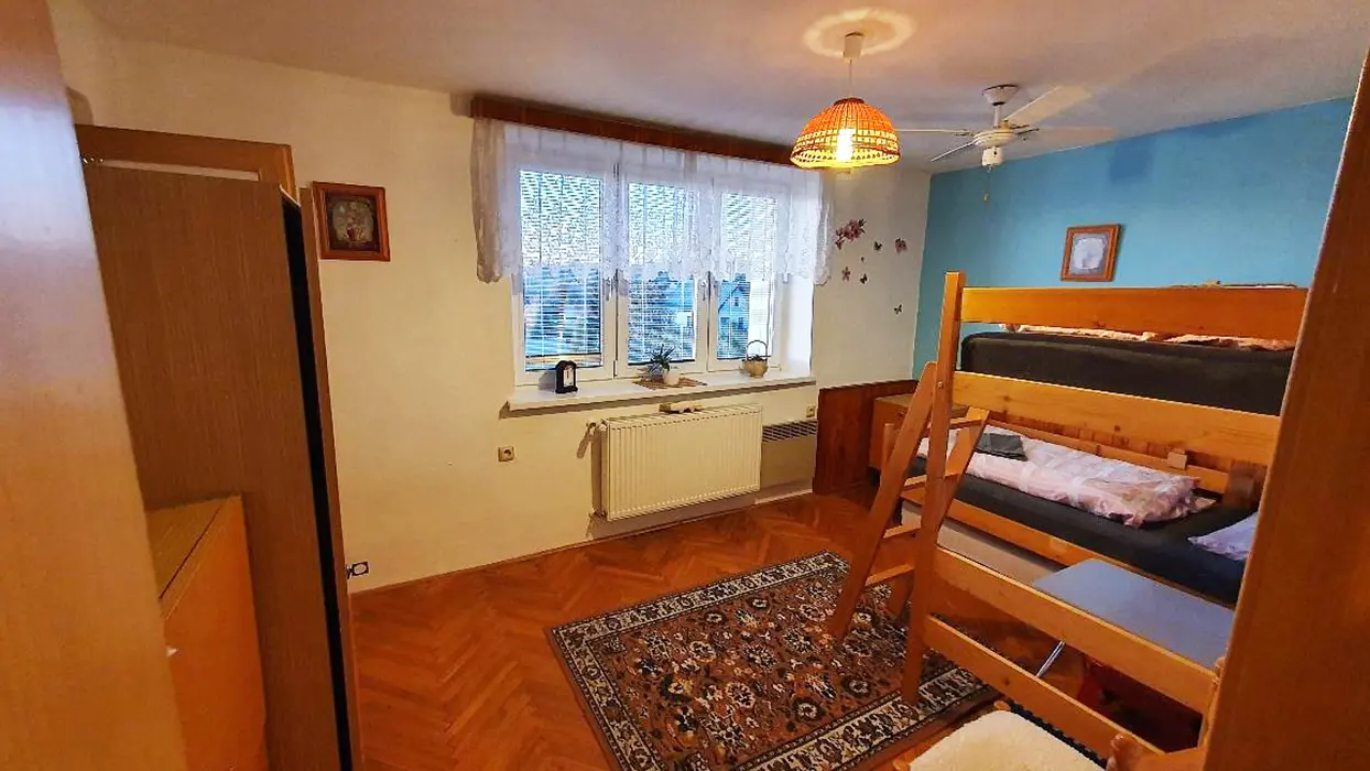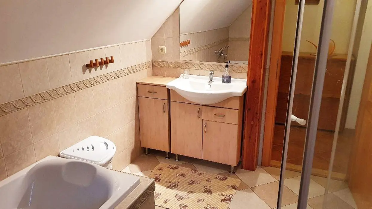 V suterénu - sauna, posezení, vířivka. V podkroví - prostorná obytná část spojená s kuchyní - plně vybavená - el.sporák, skokeram. varná deska, lednice, myčka, kávovar, varná konvice, nádobí, jídelní stůl a židle, posezení u LCDT, 2 lůžka. 1 ložnice - 2 lůžka - patrová postel + 1 přistýlka ( vysouvací lůžko ). Soc. zařízení - koupelna s vanou, sprchový kout, WC v koupelně. Topení - pl. ústřední