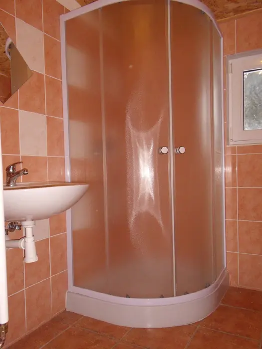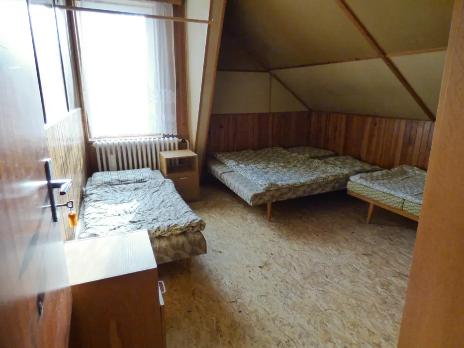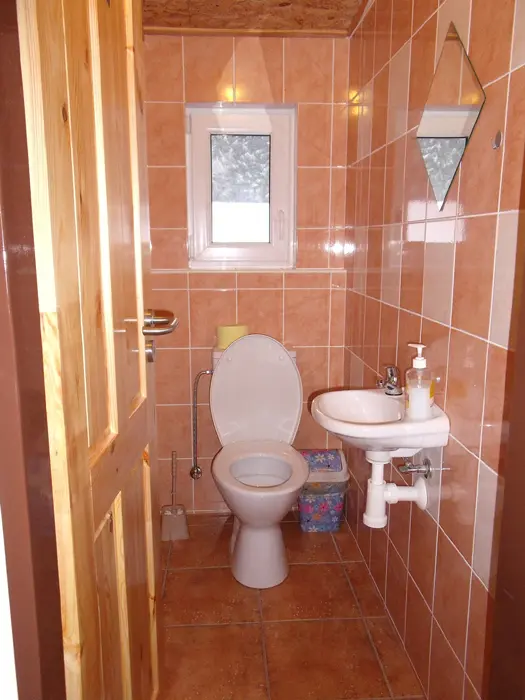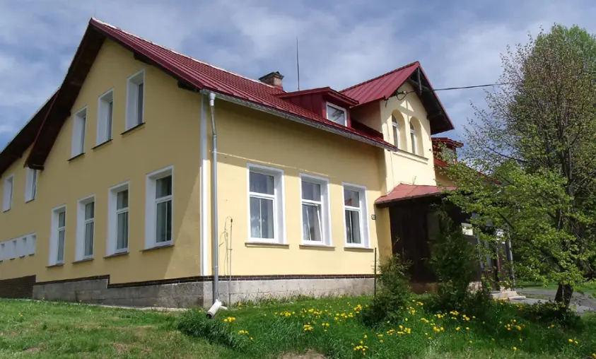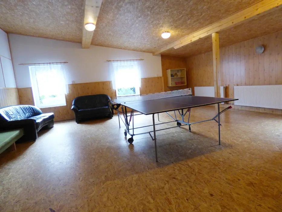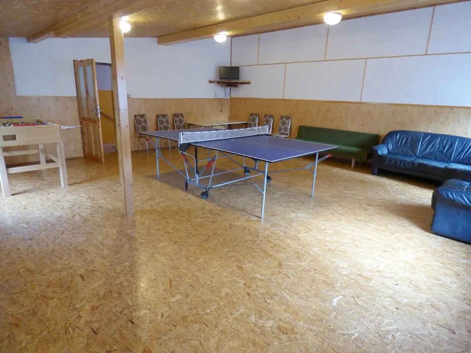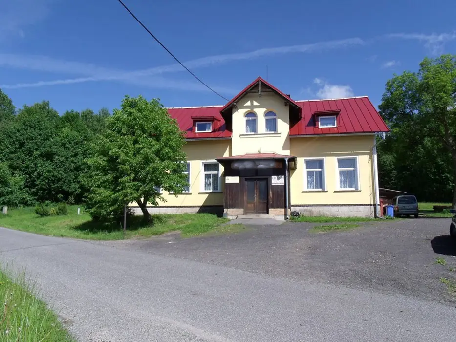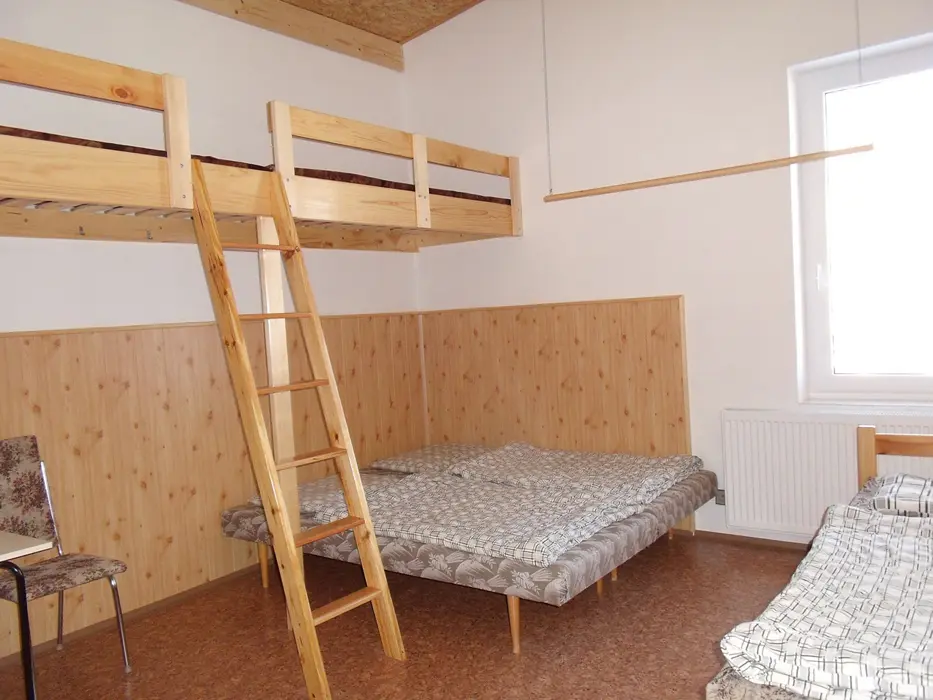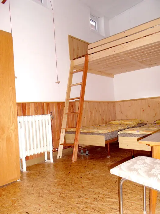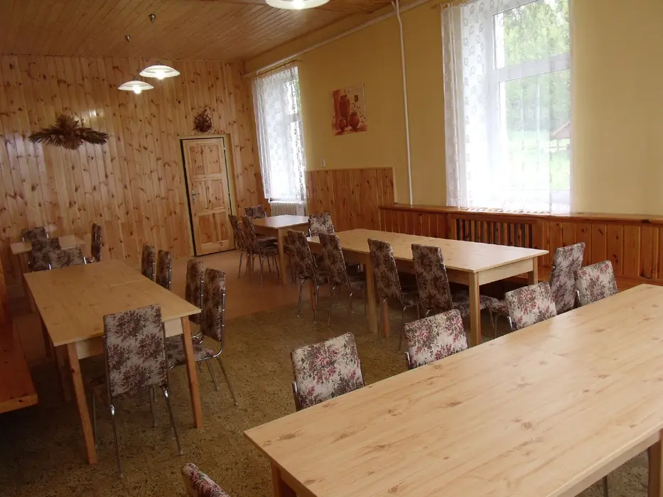 Prostorná společenská místnost - stoly, židle. Kuchyně - 2x plynový sporák, 2x lednice s mrazákem, spíž, ke skladování potravin lze také použít sklep. Vybavení - mikrovlnná trouba, varná konvice, nádobí. 12 ložnic - 4x2, 1x3, 3x4, 3x5 ( manž. postel + palanda ), 1x6 ( manž. postel + 2 palandy ). Sociální zařízení - v přízemí a mezipatře společné sprchy a WC. Topení - ústřední topení.