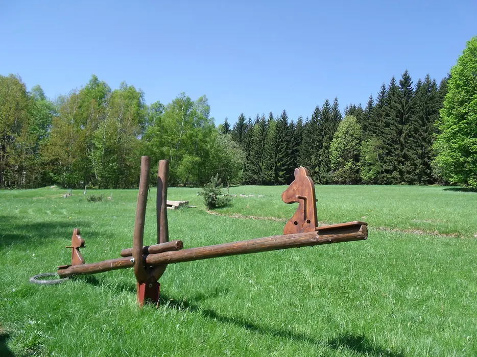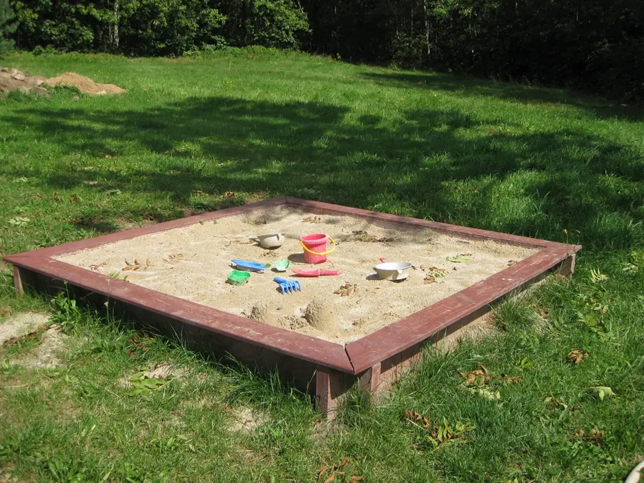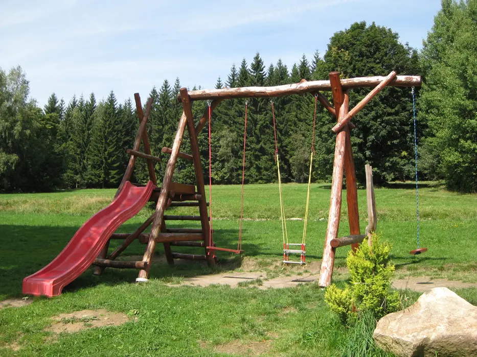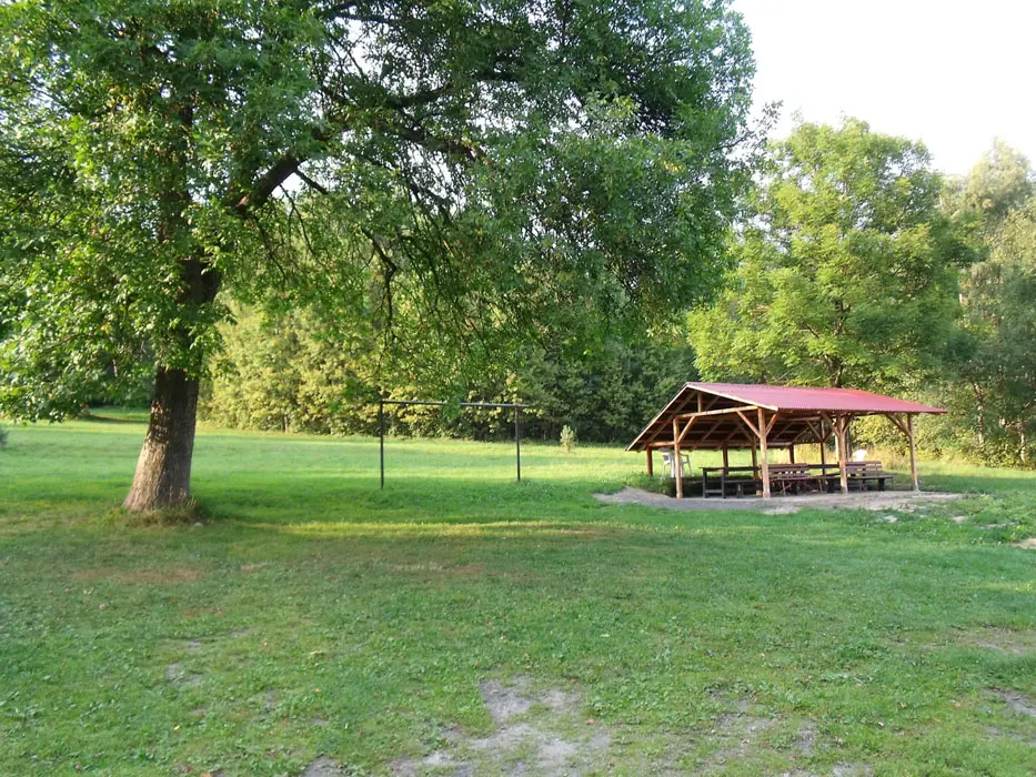 Dětské hřiště s pískovištěm u chaty, altánek s grilem a ohništěm, bazén, louka okolo objektu