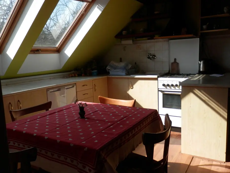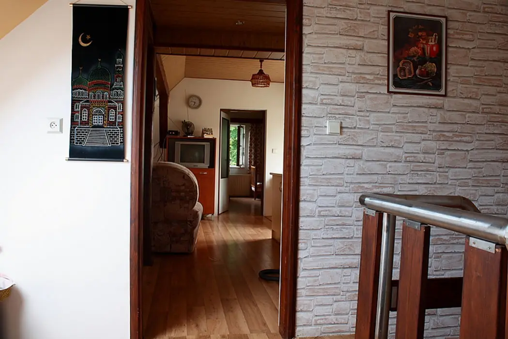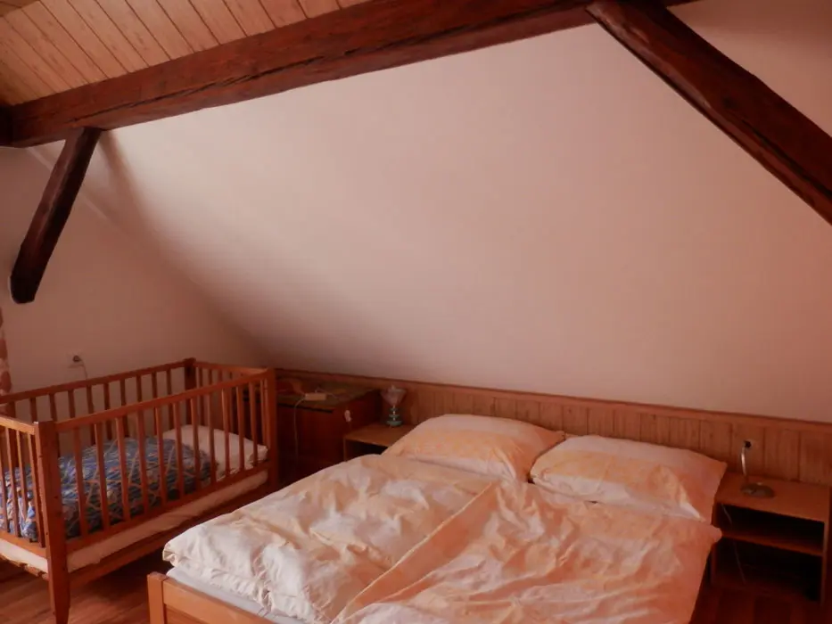 V podkroví - obytná kuchyně - sedací souprava, BTV, kuchyně - lednice, sporák na PB s el. troubou, mikrovlnka, toustovač, varná konvice, stůl a židle, nádobí. 2 ložnice 2x4 lůžka, k dispozici dětská postýlka. Sociální zařízení, WC. Topení centrální