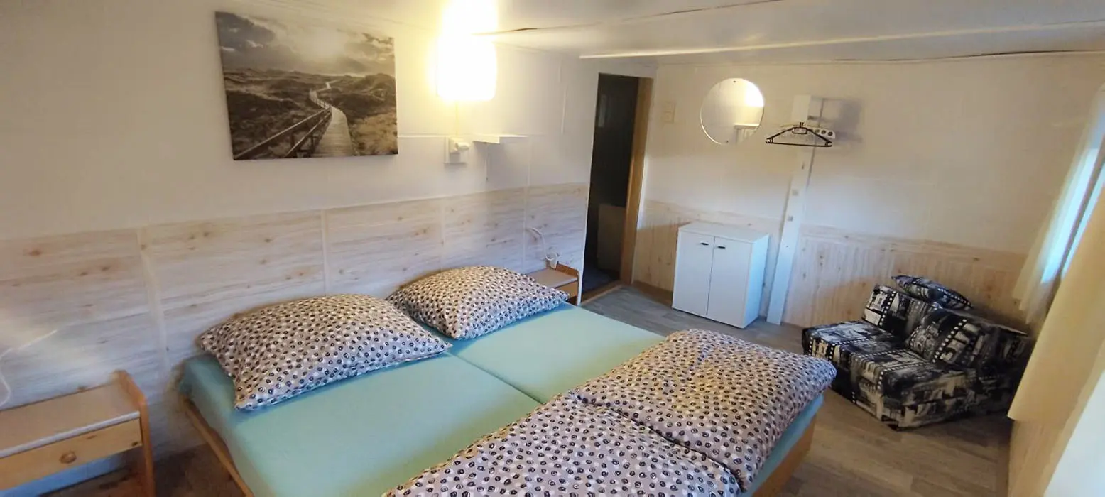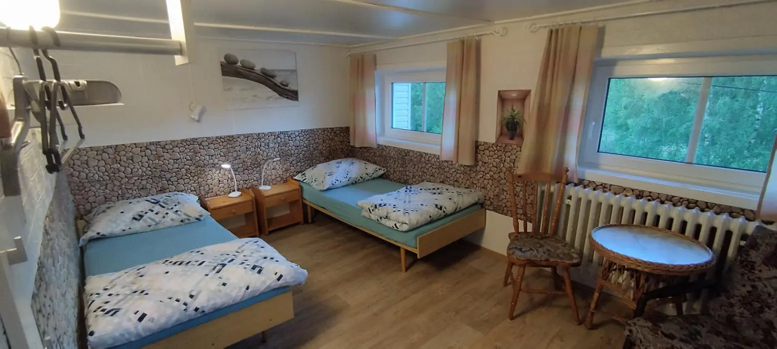 Penzion je určen pro rodiny s dětmi, školy, školky, školy v přírodě, organizované i skupinové zájezdy, sportovní skupiny a kluby, lyžařské výcviky, tábory, firemní akce, školení apod. Společenská místnost - kapacita 20 osob, BTV, krb, sedačky, jídelní kout. Kuchyně - plně vybavená, jídelna - TV s DVD přehrávačem, bar. 10 ložnic - 3x1, 5x2, 2x3 lůžka, možnost 5 přistýlek pro děti do 10 let. Soc. zařízení - 2x3 lůžkové pokoje - mají svoji sprchu + WC, ostatní mají společné sprchy + WC. Topení - centrální plynové