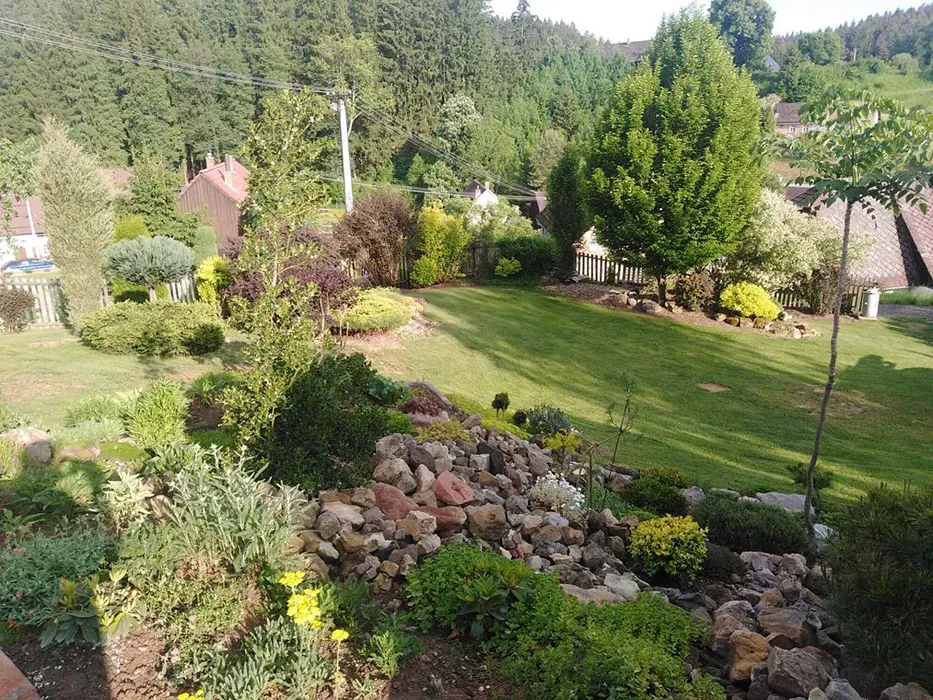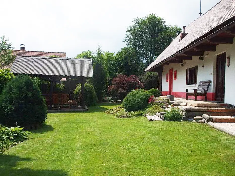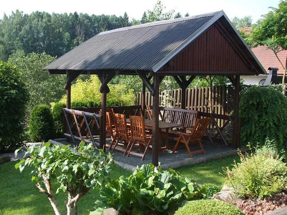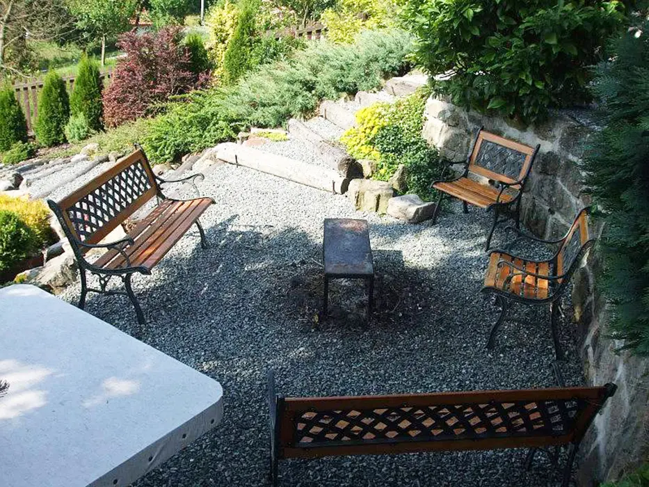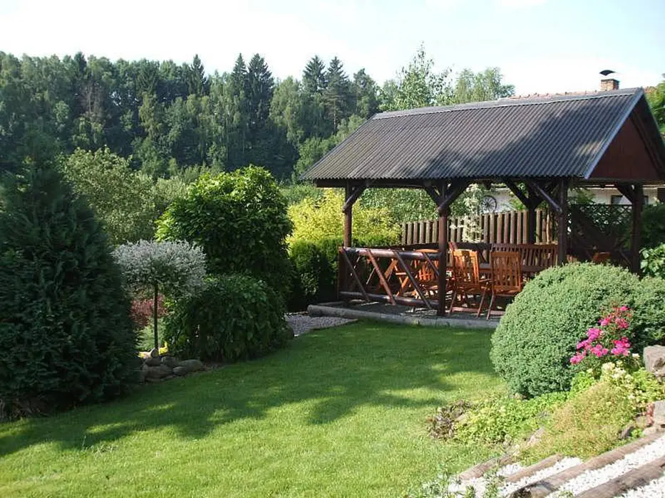 Udržovaná okrasná zahrada se skalkami, menší jezírko, ohniště s posezením, další posezení se zavěšenou houpací lavicí, velký masivní stůl s lavicí, dětské pískoviště a hračky, 300 m od chalupy malé fotbalové hřiště, k dispozici, badminton, elektronické šipky, zapuštěný bazén