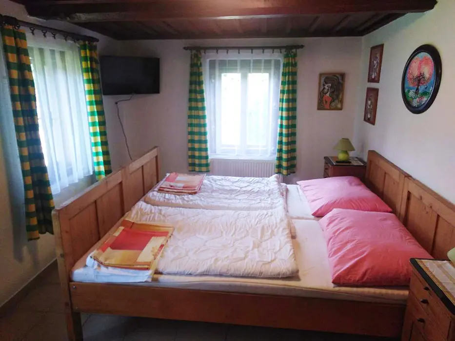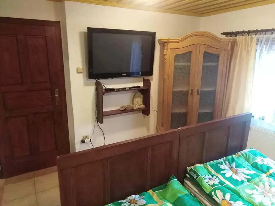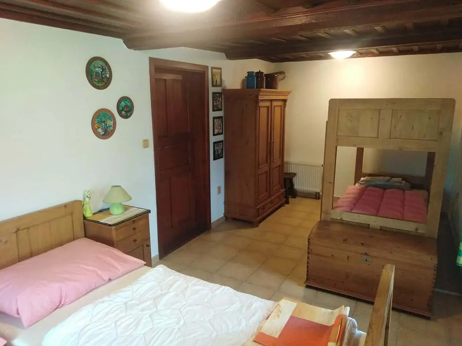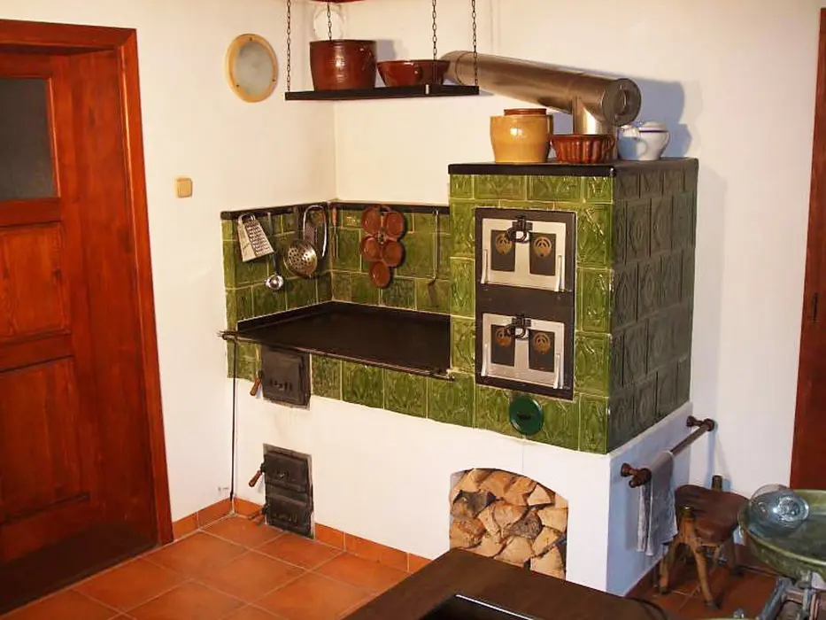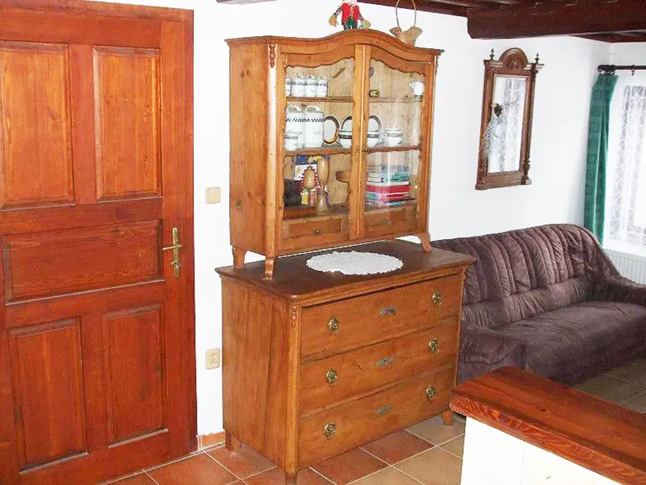 V přízemi obývací pokoj se stylovým nábytkem, klasická kachlová kamna, TV, SAT, DVD - s velkým výběrem dětských DVD. Kuchyně - 4 plotýnková sklokeramická varná deska, myčka na nádobí, mikrovlnka, lednice a mrazák, základní nádobí. 2 ložnice 1x2, 1x4 lůžka ( 2 postele + palanda ). K dispozici dětská postýlka, vanička a židlička. Koupelna - vana, sprchový kout. Teplá voda - el. bojler nebo v koupelně lázeňská kamna. Topení - elektrické nebo tuhá paliva. K dispozici pískovcový sklep - vhodný k uskladnění nápojů