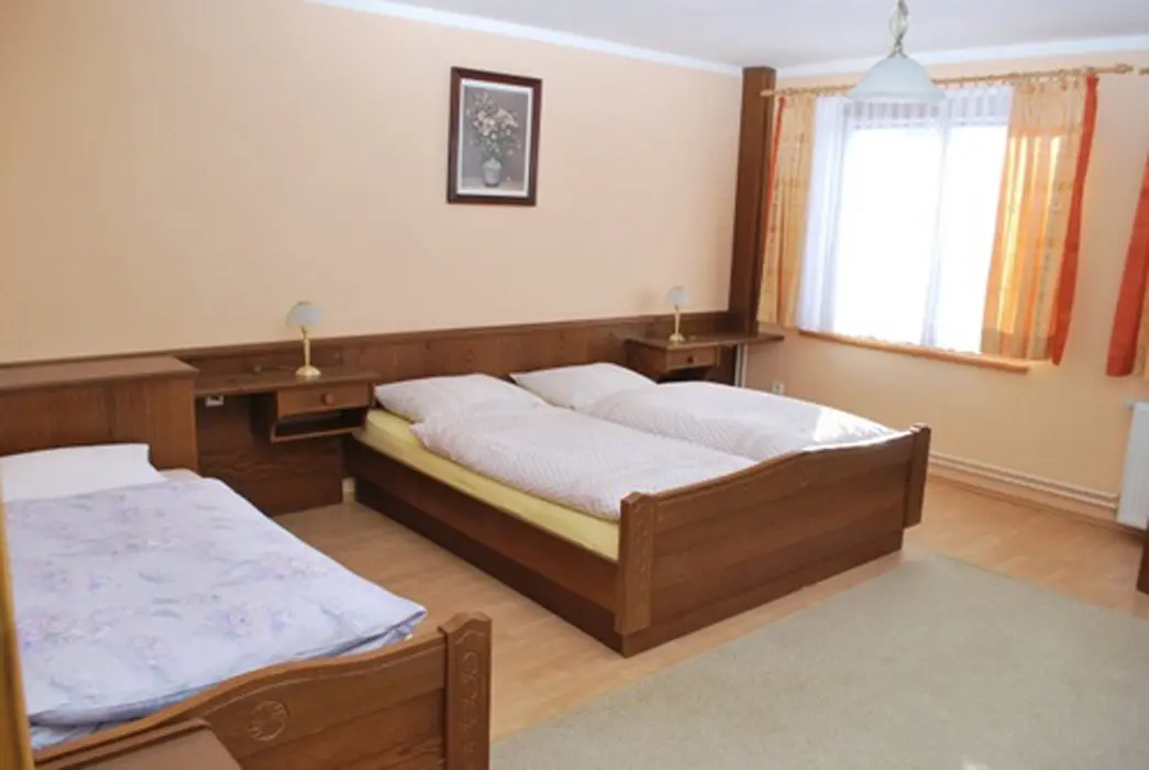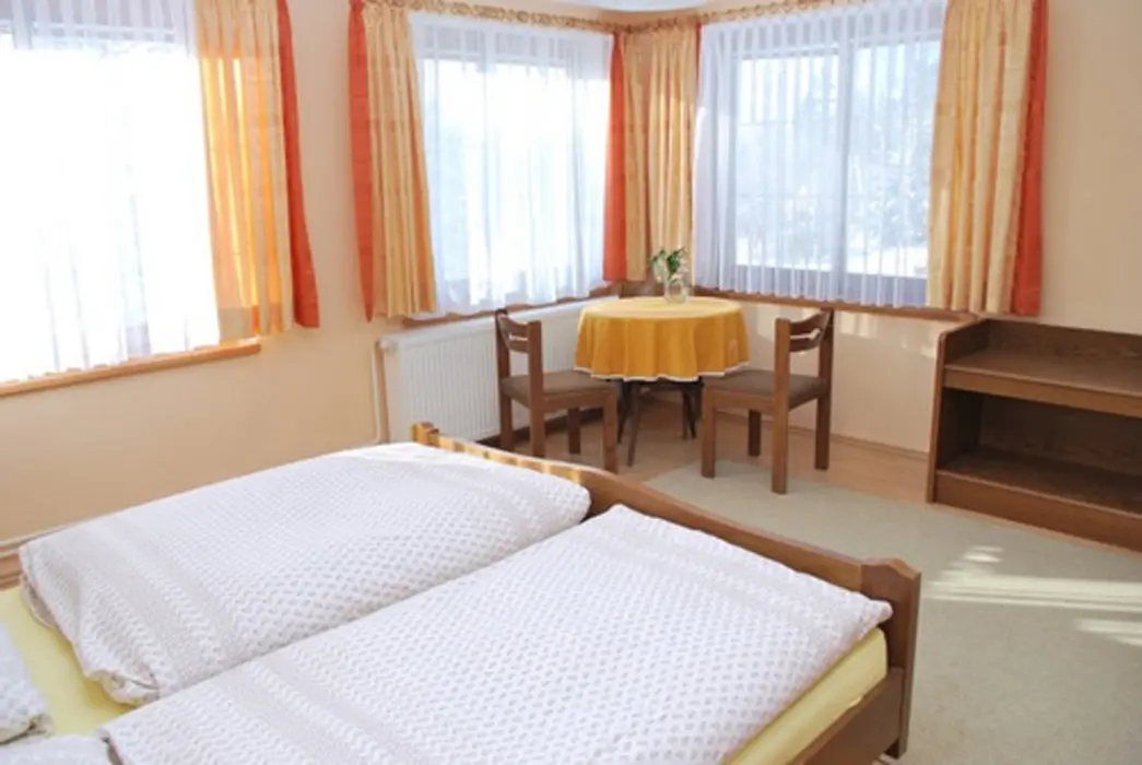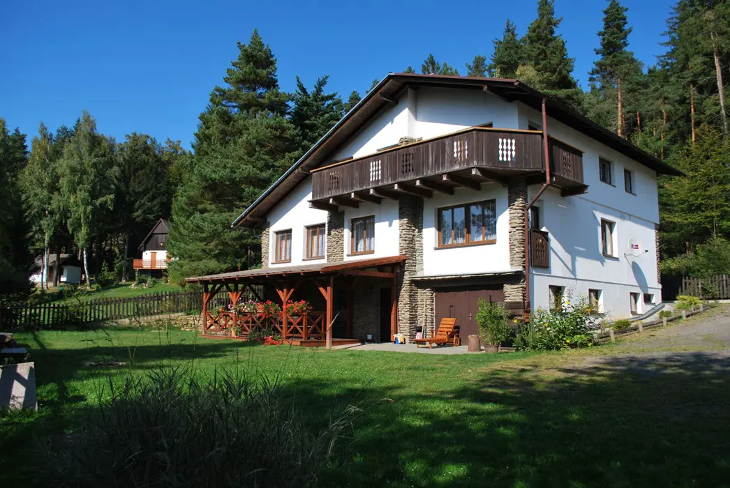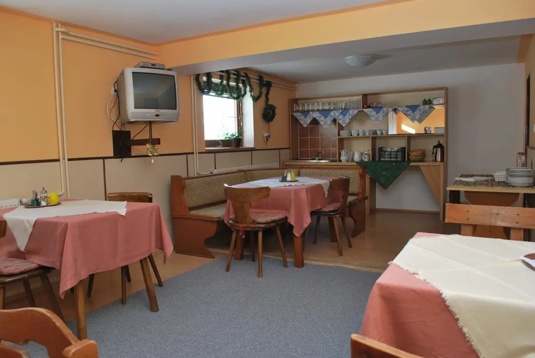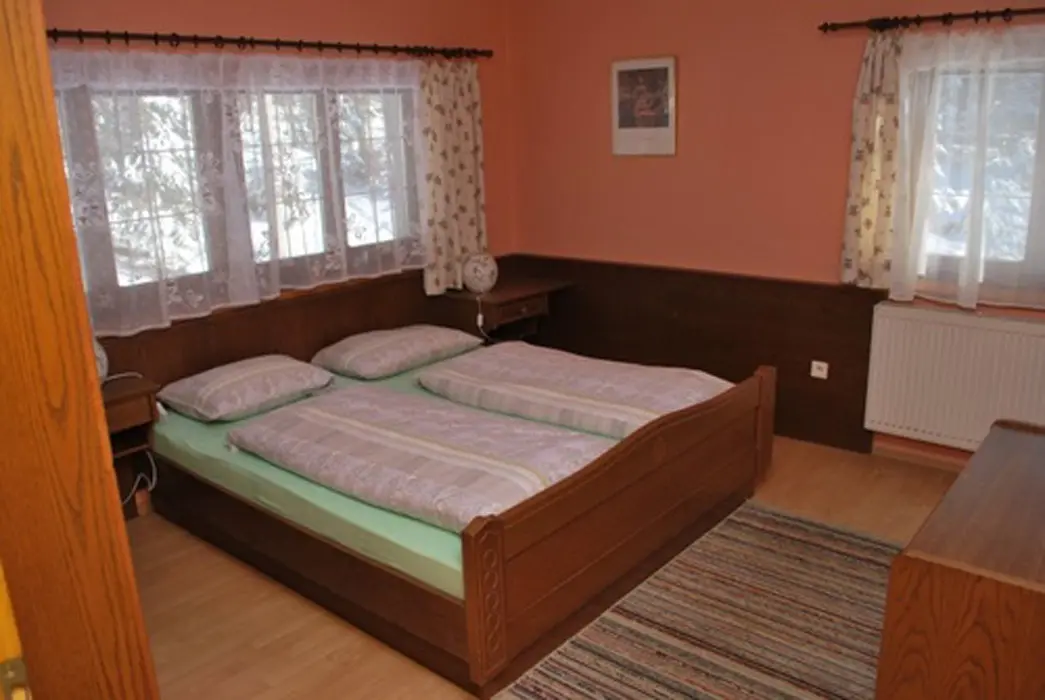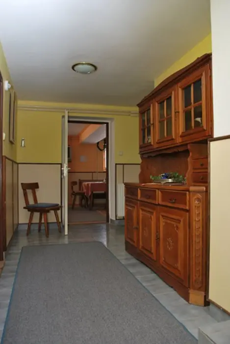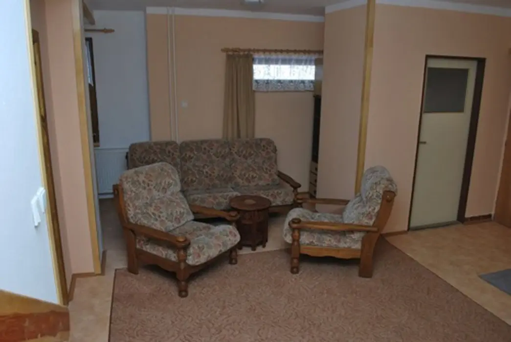 V přízemí prostorná společ. místnost s posezením. Společná kuchyně pro celý objekt - plně vybavená, 2 lednice - 1x 2m vysoká s mražákem, druhá 160 cm. 7 ložnic - 4x2, 1x3, 2x5 lůžek. Sociální zařízení - samostatné pro každý pokoj, sprchový kout, WC, umyvadlo. Topení - centrální, zajištěno majitelem objektu.