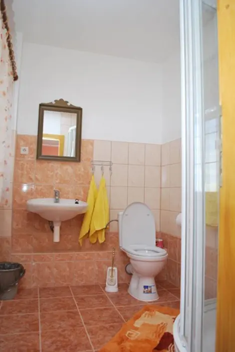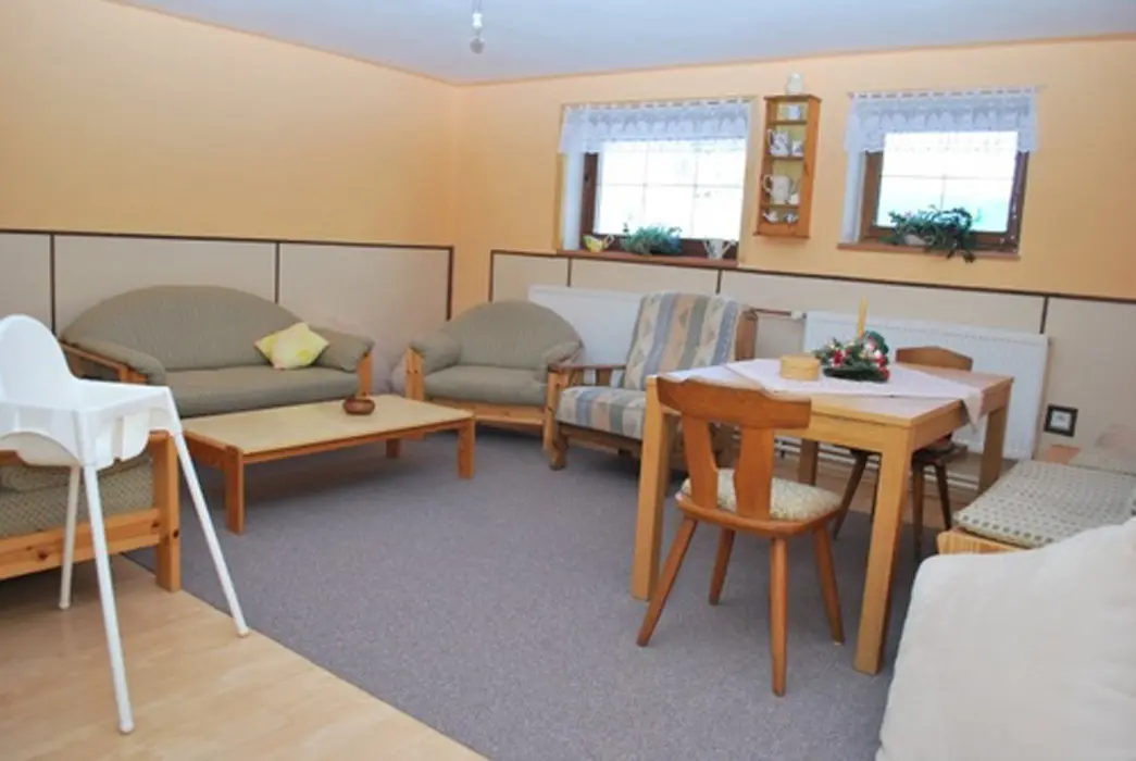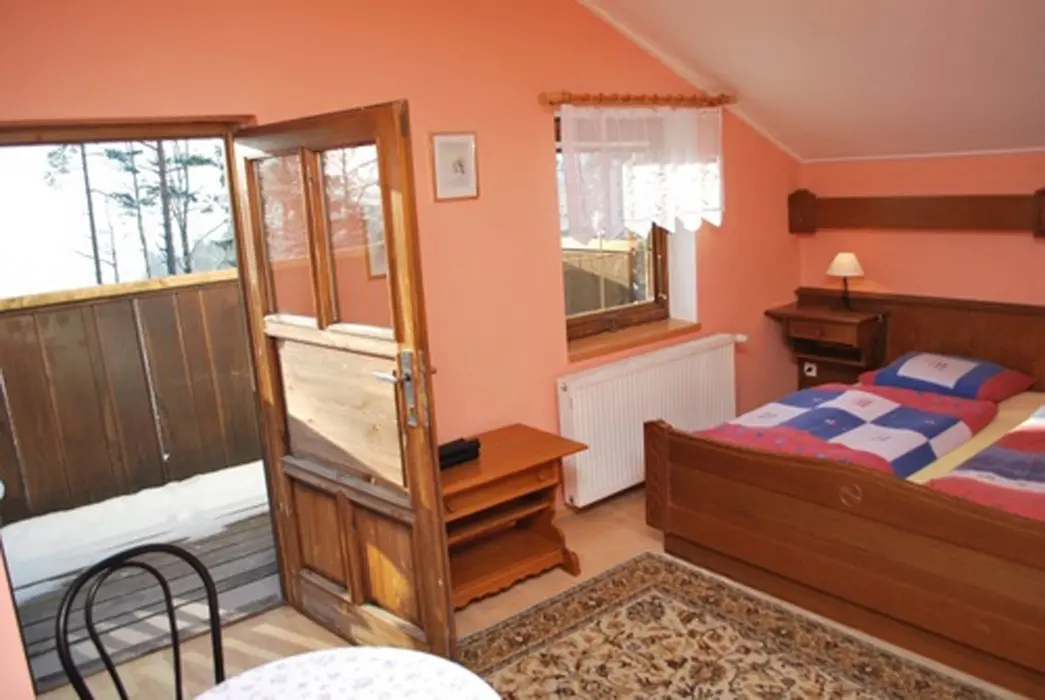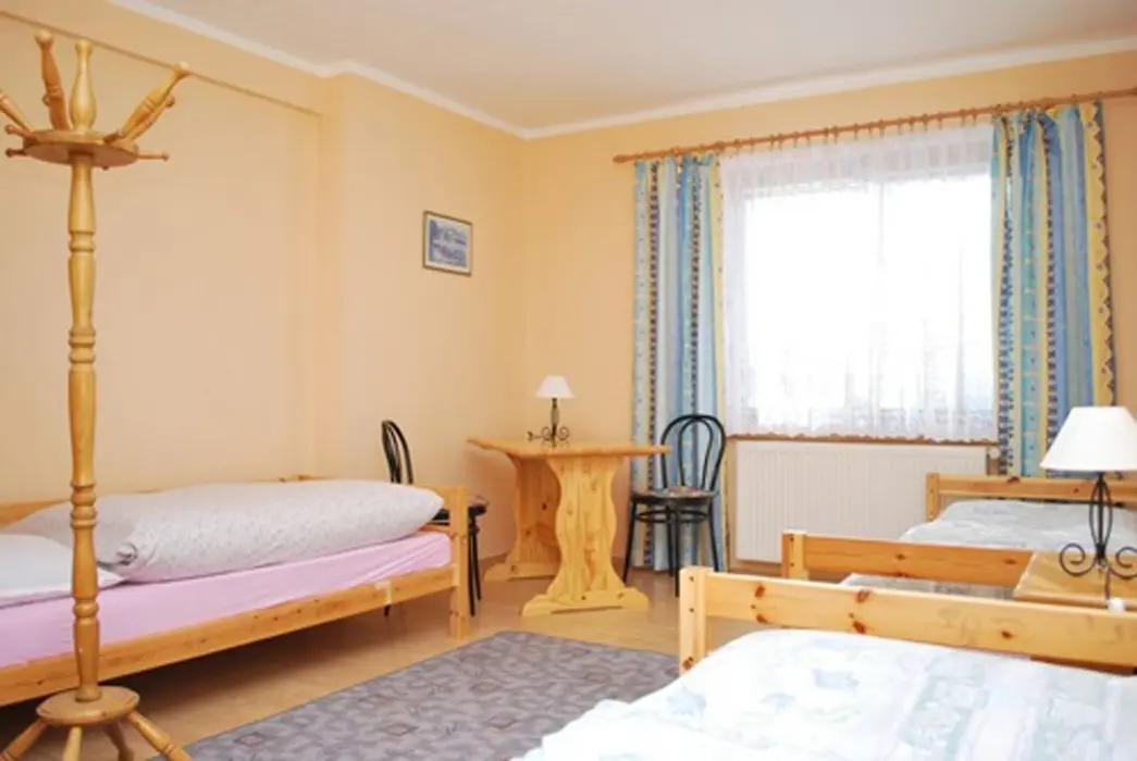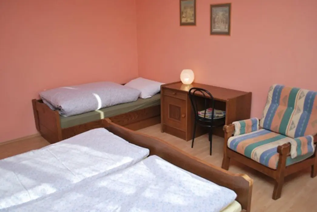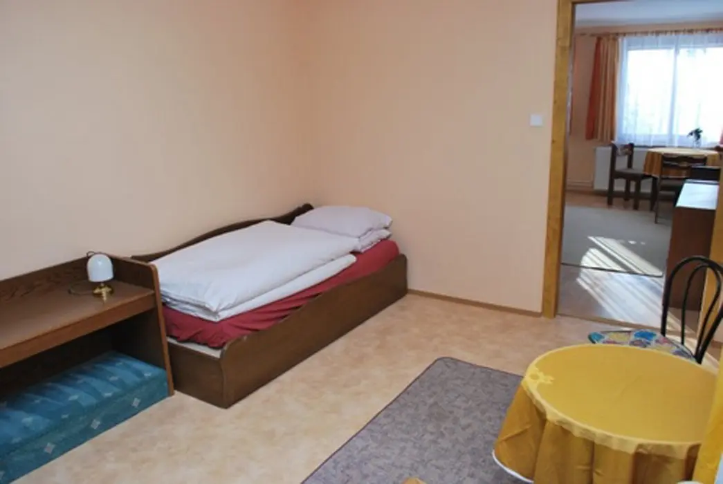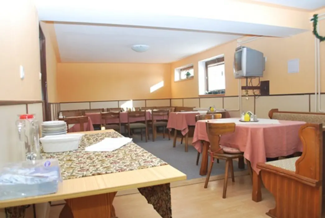 V přízemí prostorná společ. místnost s posezením. Společná kuchyně pro celý objekt - plně vybavená, 2 lednice - 1x 2m vysoká s mražákem, druhá 160 cm. 7 ložnic - 4x2, 1x3, 2x5 lůžek. Sociální zařízení - samostatné pro každý pokoj, sprchový kout, WC, umyvadlo. Topení - centrální, zajištěno majitelem objektu.
