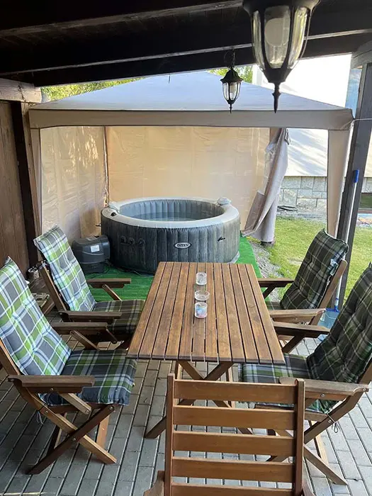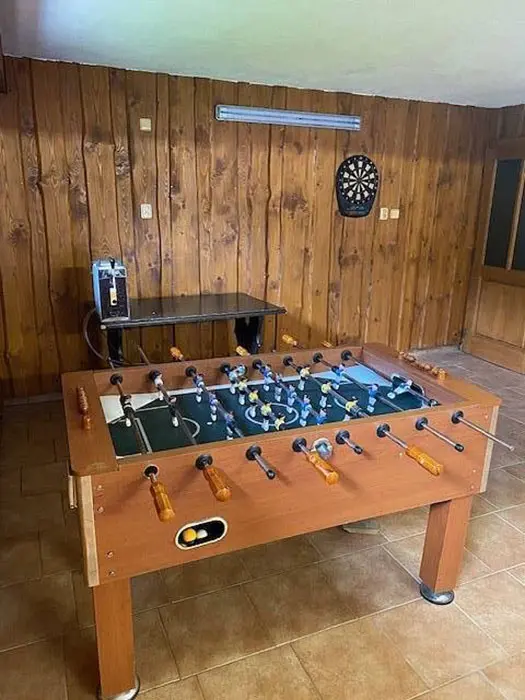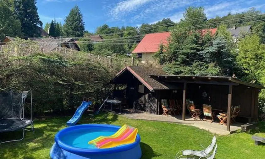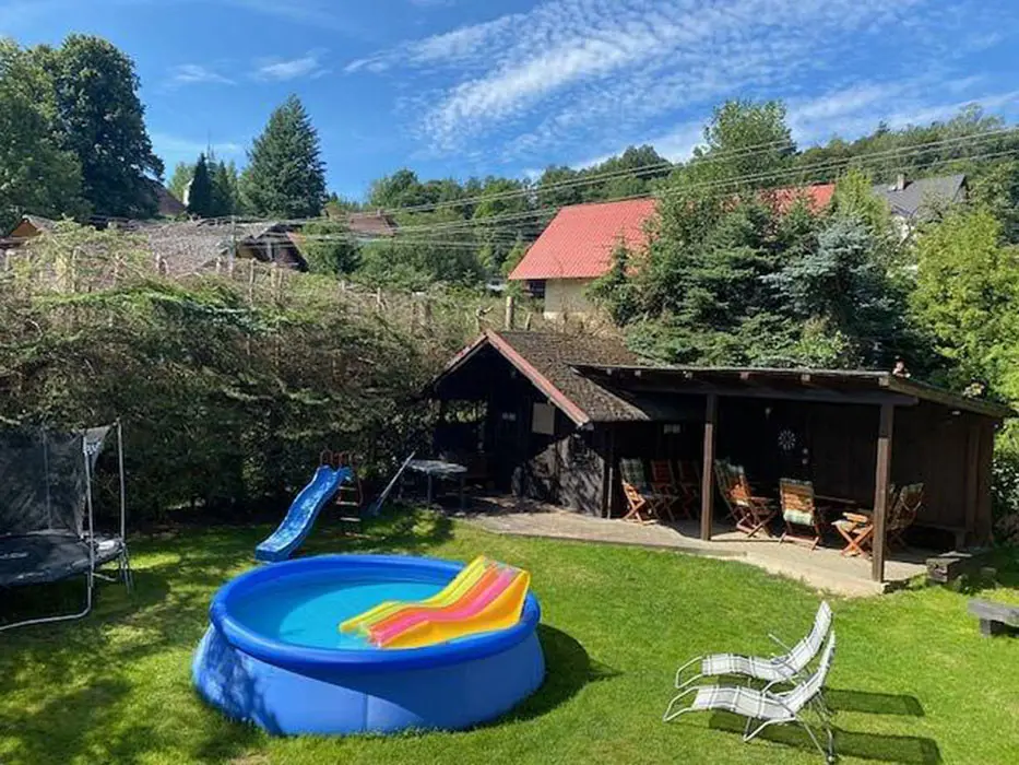 Na zahradě altán s posezením, ohniště, pískoviště pro děti a nezapuštěný bazén o průměru 3 m, nově v objektu sauna + herna v domě - ping-pong, šipky, stolní fotbálek