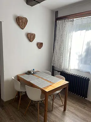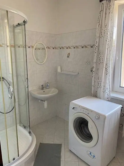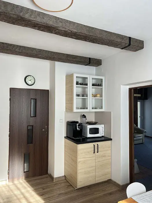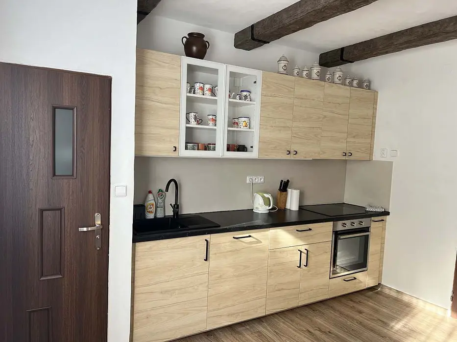 Obývací pokoj s jídelnou, posezení, krbová kamna, TV, SAT – vstup na balkon na zahradu. Kuchyně – el. sporák, trouba, myčka na nádobí, lednice, varná konvice, MVT, základní nádobí. 5 ložnic – v přízemí 1x2, v patře 2x2, 2x3 lůžka. 2 x koupelna se sprchou, 2 x samostatné WC. V patře je u jedné ložnic balkon. Topení elektrické + na tuhá paliva