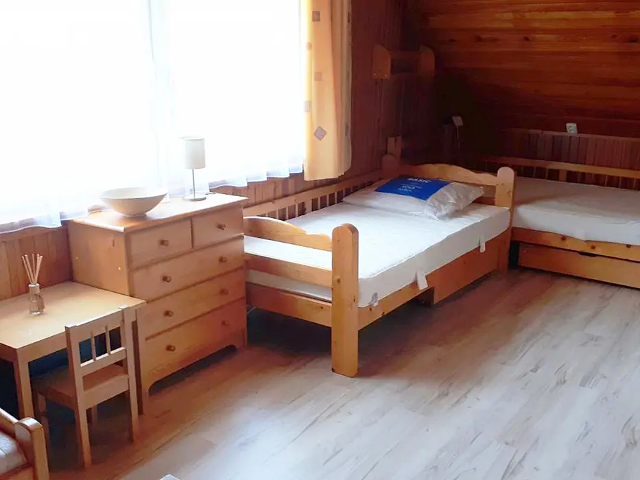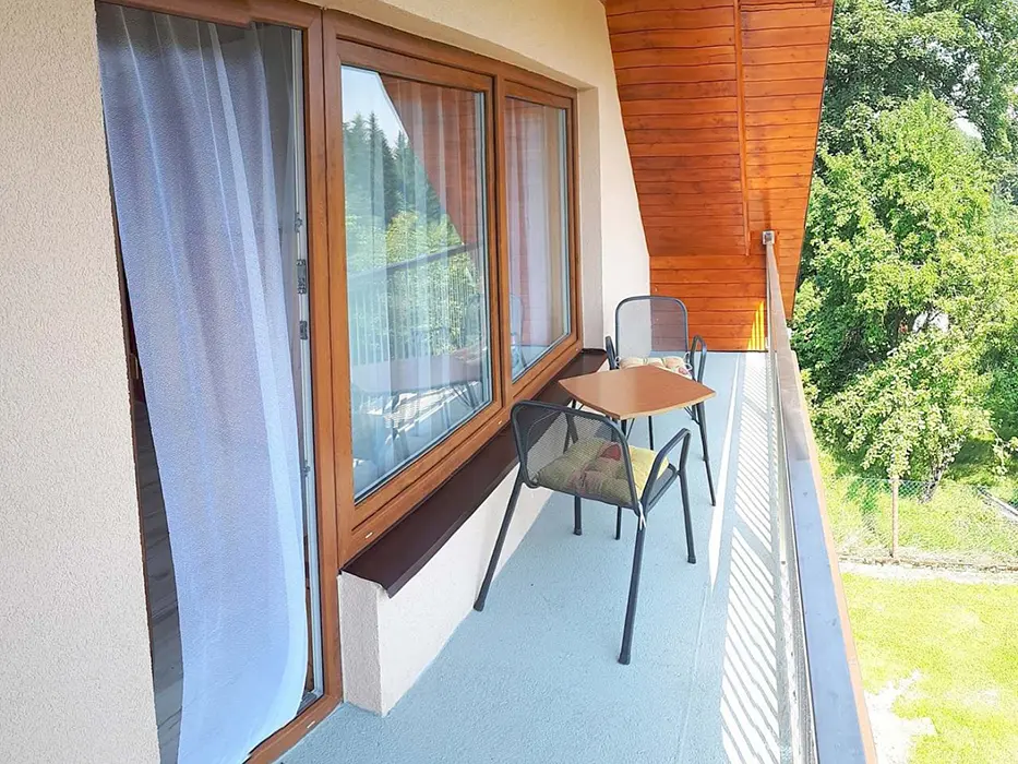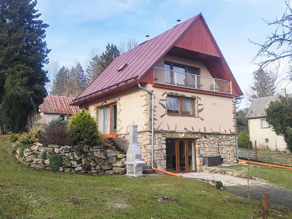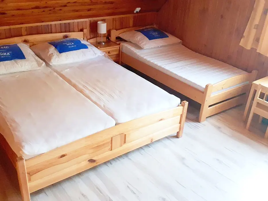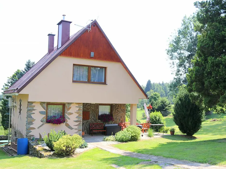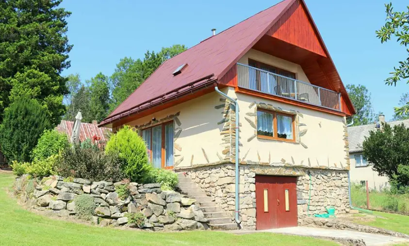 V 1. podlaží - obývací pokoj s posezením, krb, jídelní stůl, plně vybavená kuchyně - sklokeramická deska, vestavná el. trouba, myčka nádobí, mikrovlnka, varná konvice, kávovar na zrnkovou kávu, lednička, nádobí. 2. podlaží - 2 ložnice - 1x4, 1x5 lůžek, dětská postýlka. Balkon s posezením. Oba pokoje vybaveny samostatnou klimatizační jednotkou pro potřeby chlazení či topení. Soc. zařízení - sprchový kout, umyvadlo a WC v koupelně. Topení - krb, přímotopy v koupelnách, ústřední topení s tepelným čerpadlem