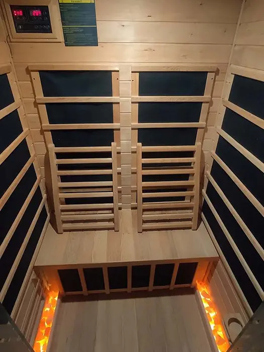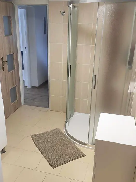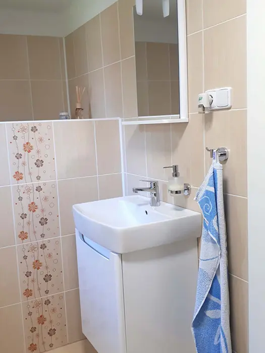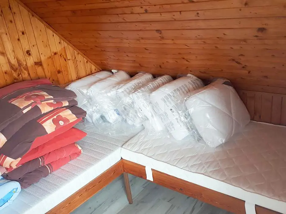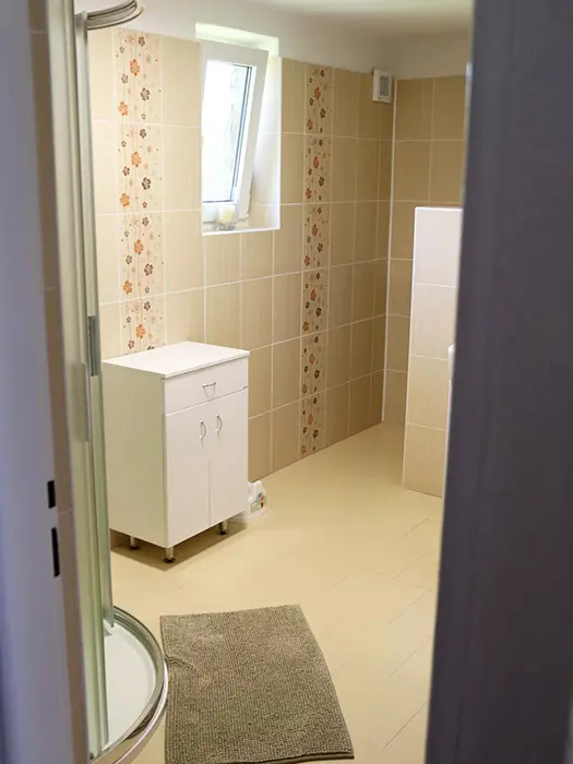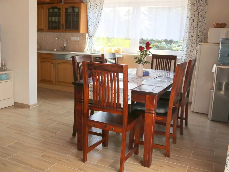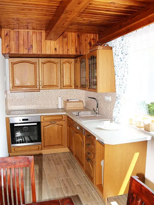 V 1. podlaží - obývací pokoj s posezením, krb, jídelní stůl, plně vybavená kuchyně - sklokeramická deska, vestavná el. trouba, myčka nádobí, mikrovlnka, varná konvice, kávovar na zrnkovou kávu, lednička, nádobí. 2. podlaží - 2 ložnice - 1x4, 1x5 lůžek, dětská postýlka. Balkon s posezením. Oba pokoje vybaveny samostatnou klimatizační jednotkou pro potřeby chlazení či topení. Soc. zařízení - sprchový kout, umyvadlo a WC v koupelně. Topení - krb, přímotopy v koupelnách, ústřední topení s tepelným čerpadlem